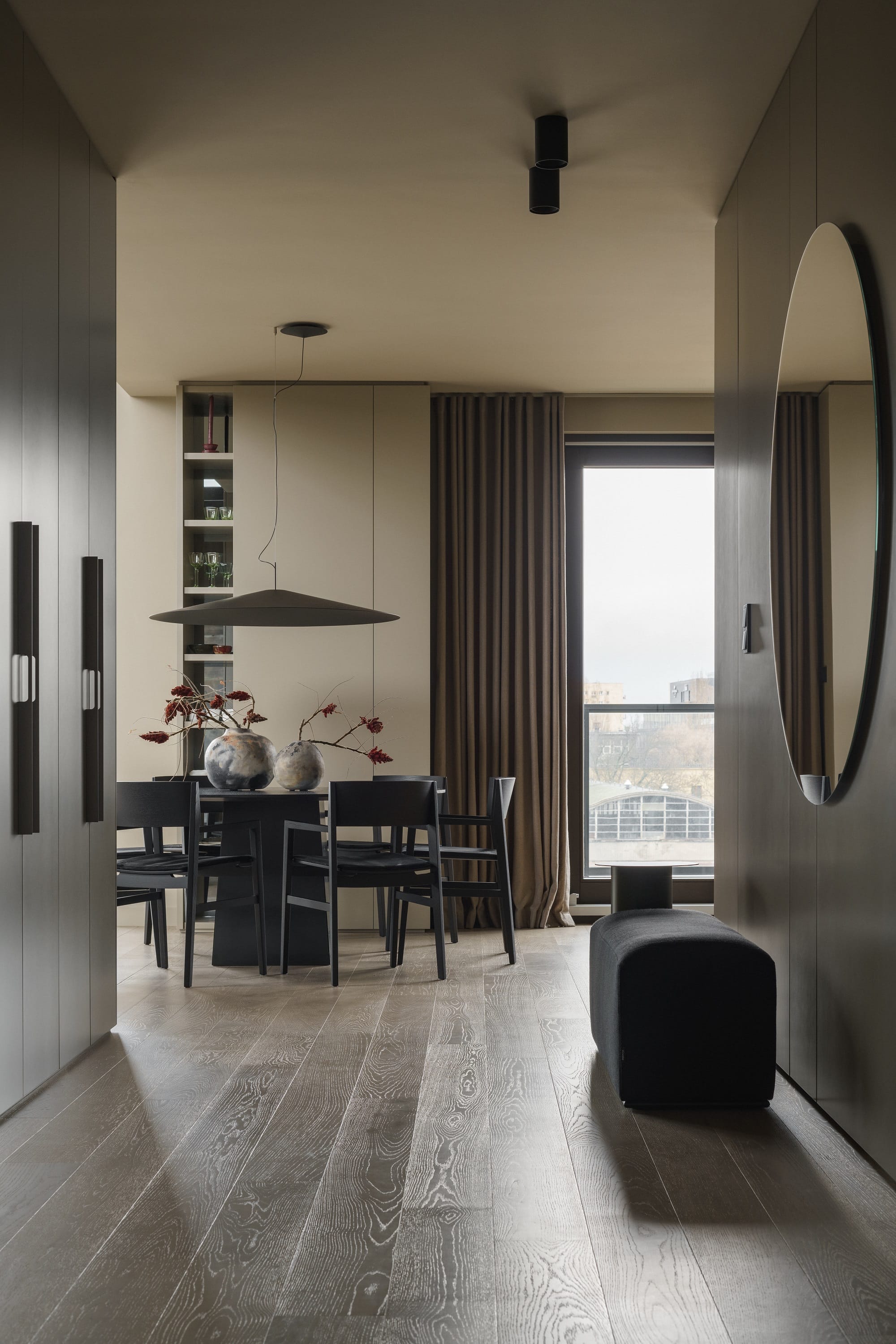 Wchodząc, mamy poczucie tajemnicy, nie widzimy od razu skali tego, co się dzieje dalej. Na dobry początek witają nas wygodne szafy garderobiane, ulokowane tak, że powodują naturalną chęć pójścia w prawo. – Bo człowiek lubi ruch w prawo – mówi z uśmiechem Adam Pulwicki, a ja od razu myślę, że to pewnie doświadczenie wzięte z jogi, którą od lat ćwiczy architekt. Idziemy więc w kierunku jadalni i dużej, komfortowej kuchni, która stanowi dobre preludium dla całej realizacji – jest monolityczna, stonowana. Adam Pulwicki od 1998 roku prowadzi w Poznaniu pracownię Pulva i jak twierdzi, ogromny wpływ na jej kształt mają jego klienci.