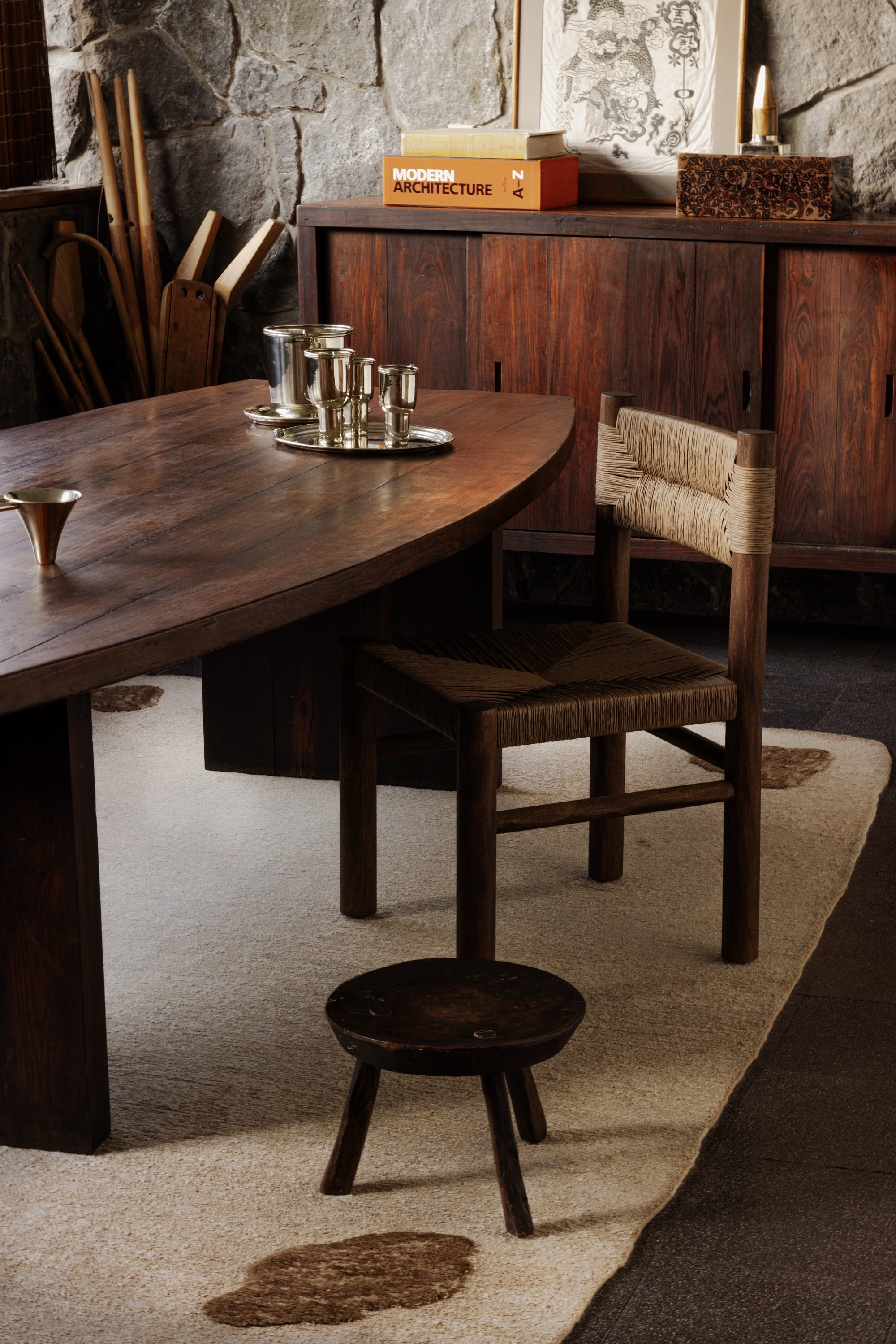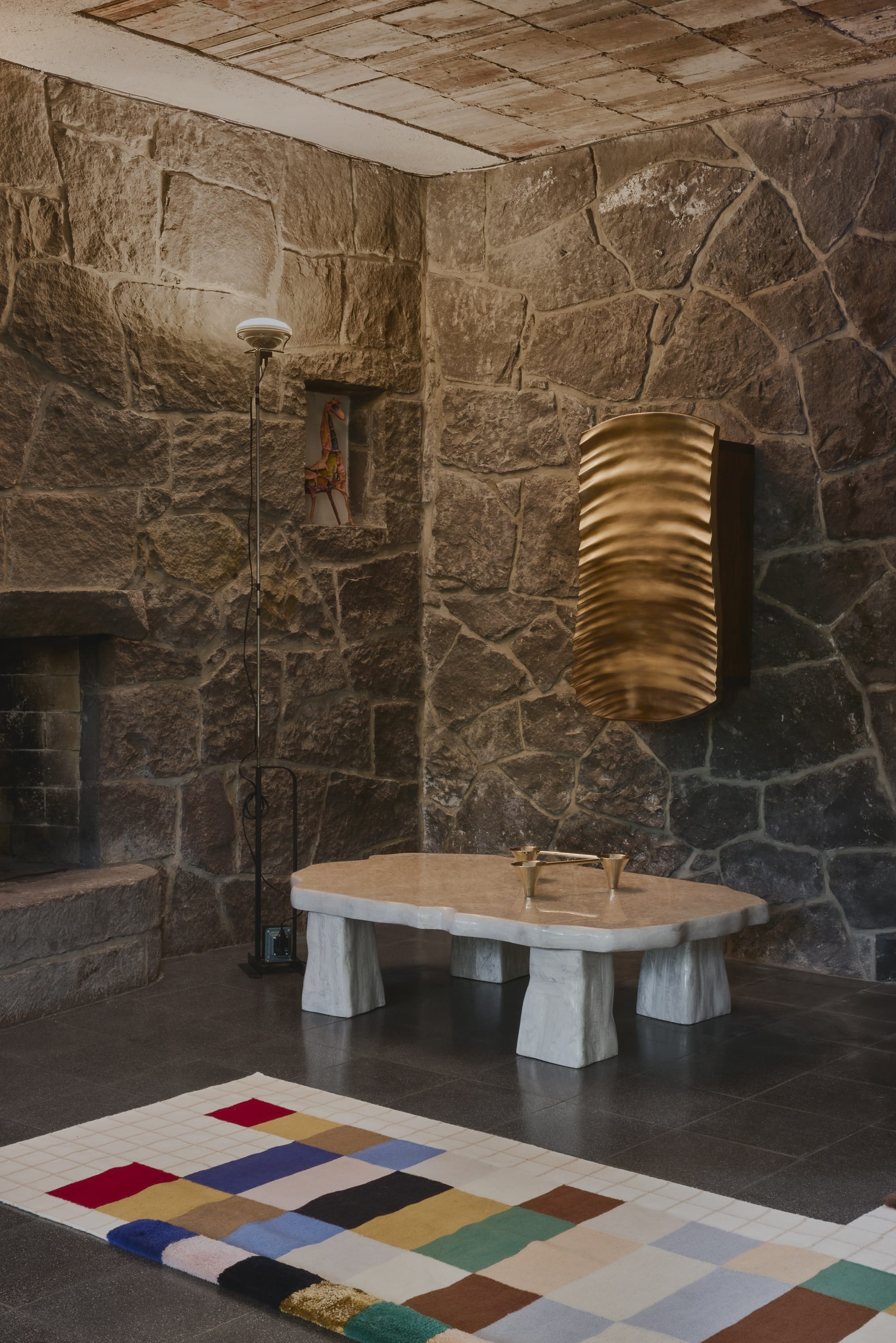 Dom wykończono z fantazją: na ścianach pojawiła się kostka z drzewa kokosowego, a na jednym z sufitów – spektakularna mozaika, zainspirowana dokonaniami Juana O’Gormana (z którym Cetto się przyjaźnił), przedstawiająca znaki zodiaku mieszkańców domu. Projektant harmonijnie zestawił elementy rustykalne, m.in. z terakoty (narożny kominek czy piec zewnętrzny), z nowoczesnymi i prostymi w formie meblami – wiele z nich zaprojektował sam Cetto, choćby stół w jadalni.