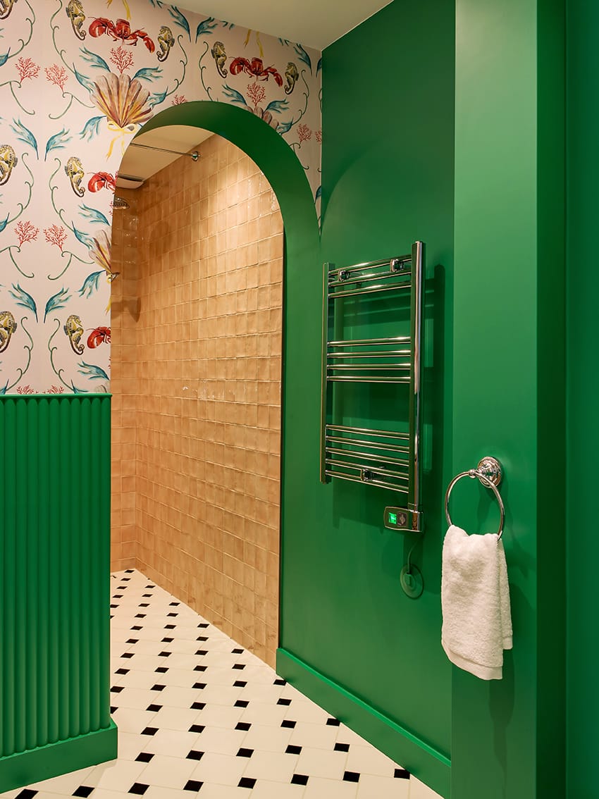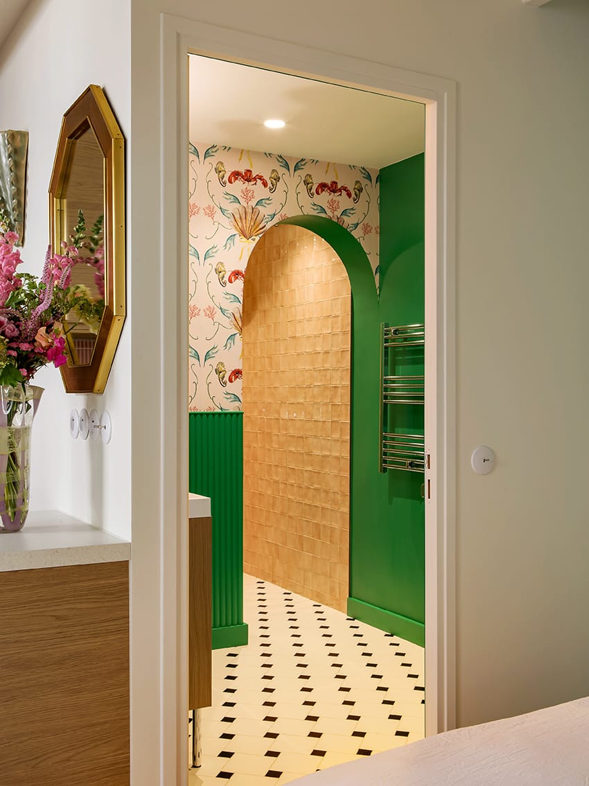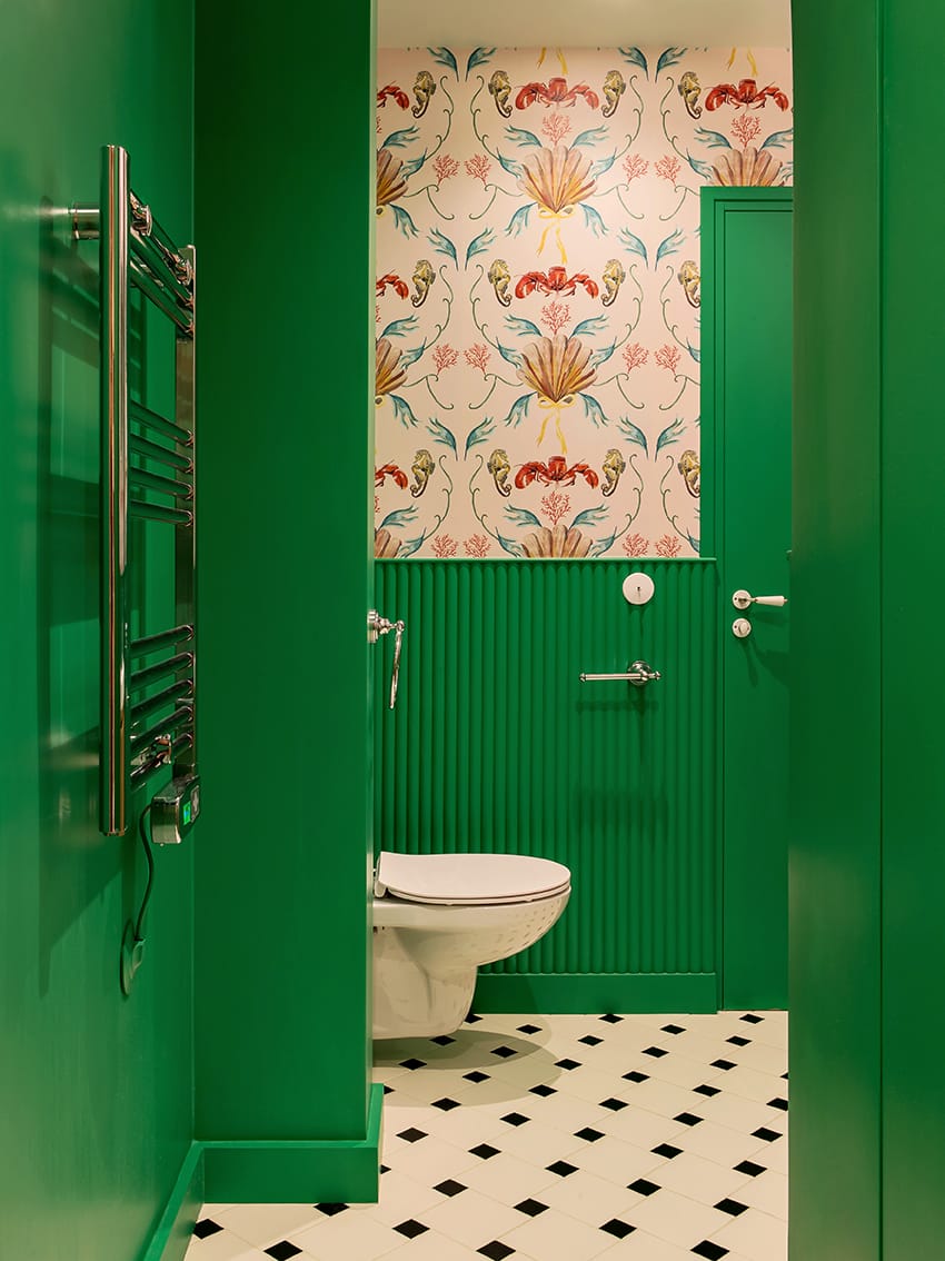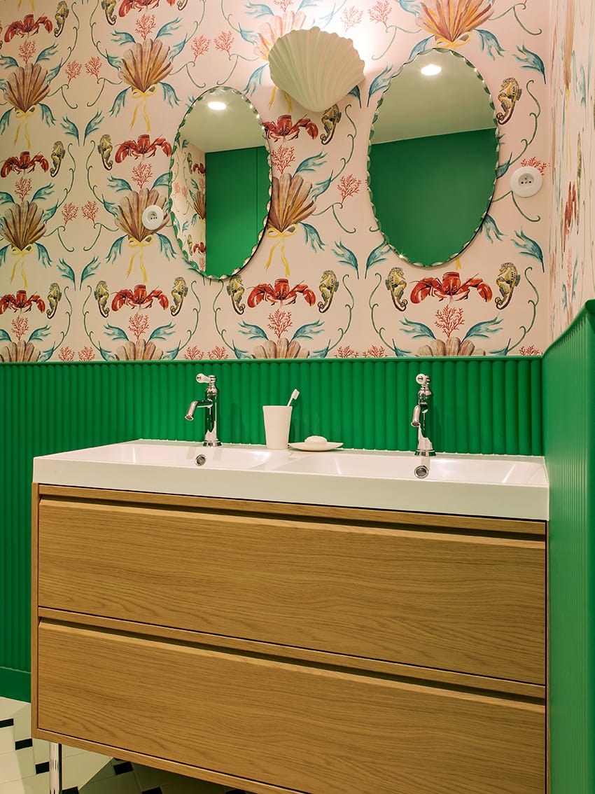 W łazience natomiast projektantka wprowadziła bardziej teatralną kompozycję, która przełamuje spokojny rytm mieszkania.