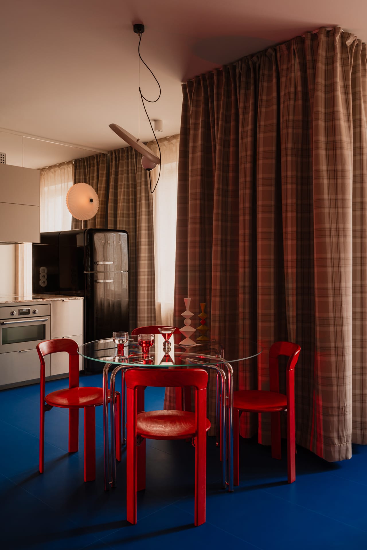 Kolory – głębokie czerwienie, elektryzujące błękity – pulsują w dialogu z błyszczącym stalowym wykończeniem szafek i metaliczną podstawą owalnego stołu.