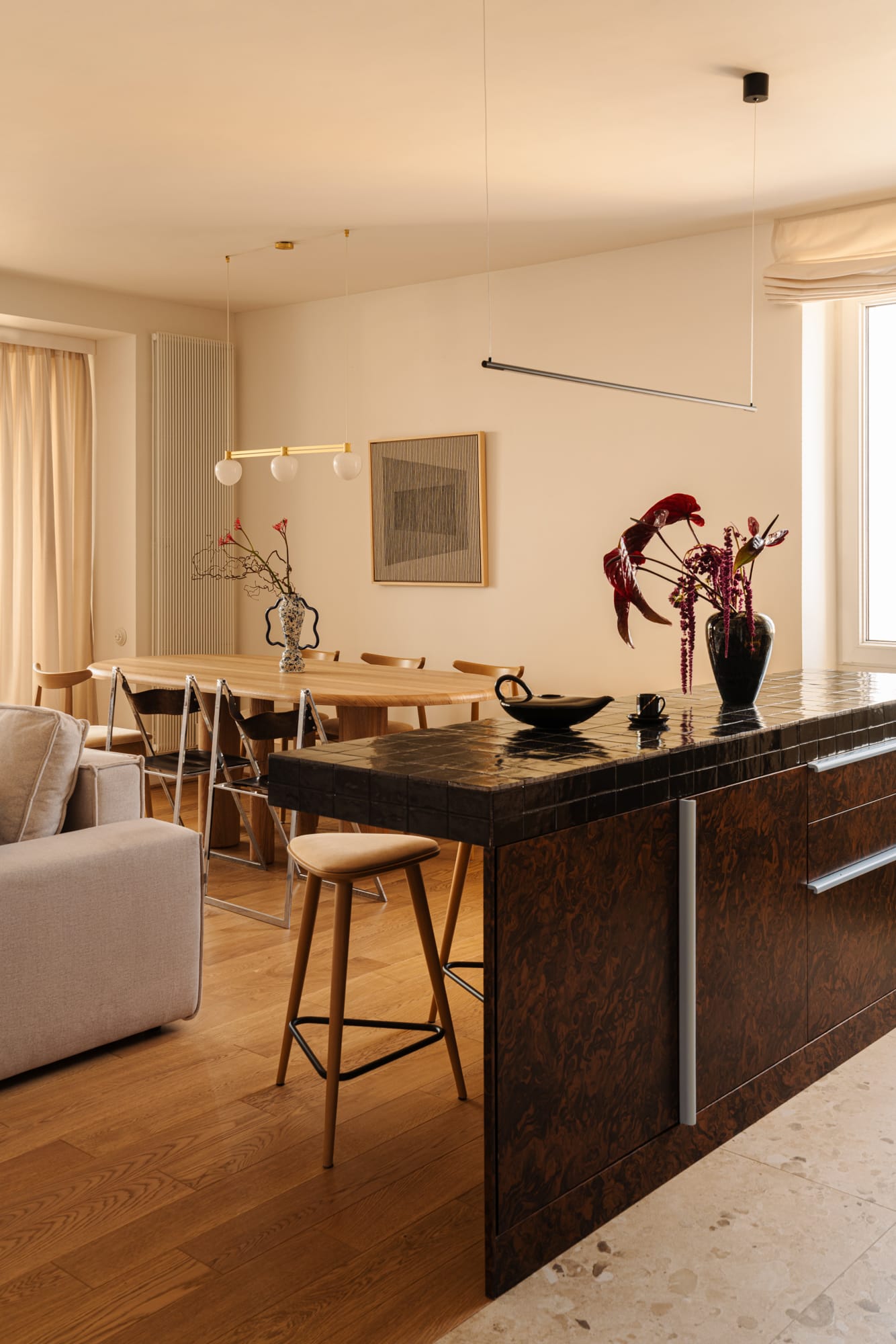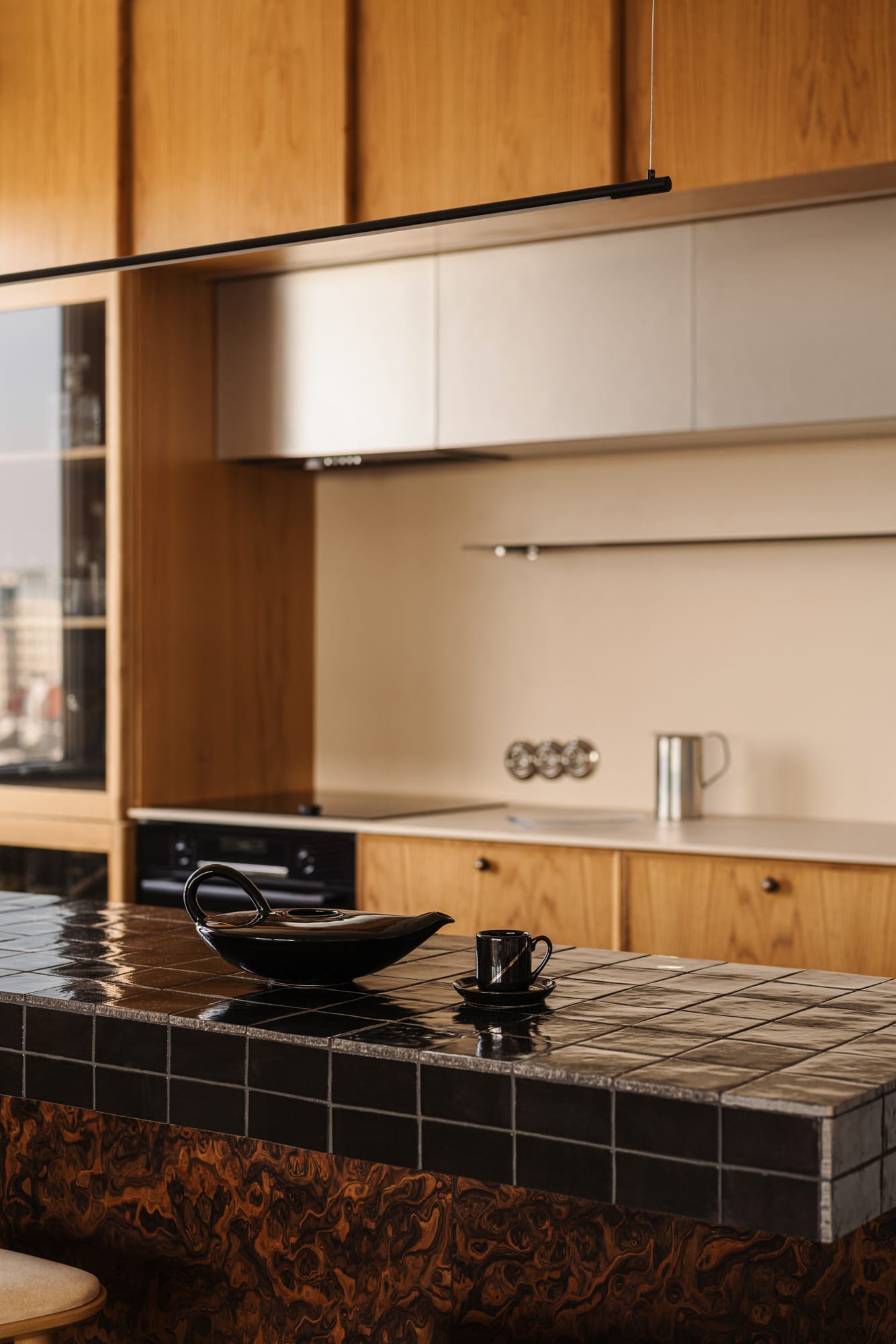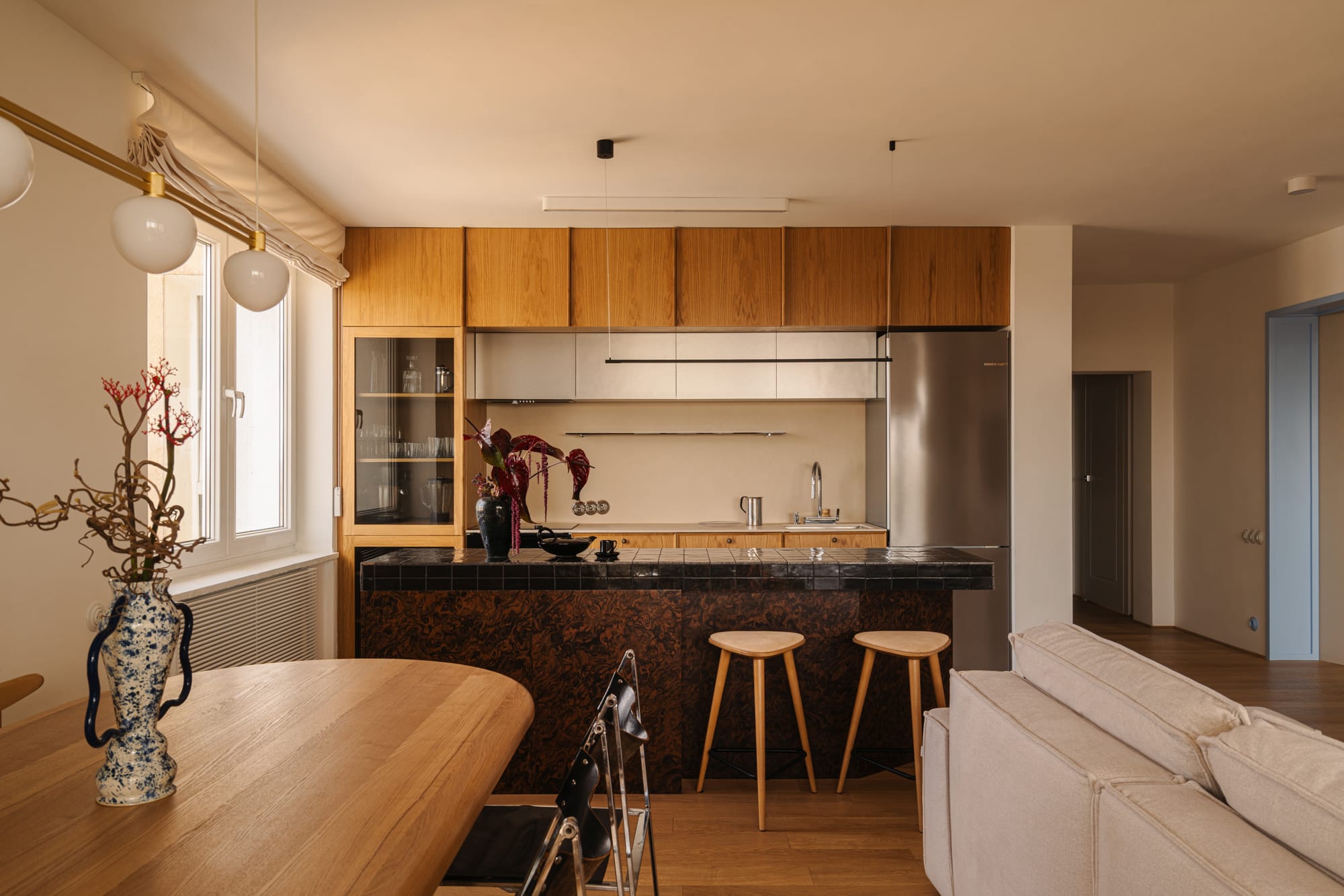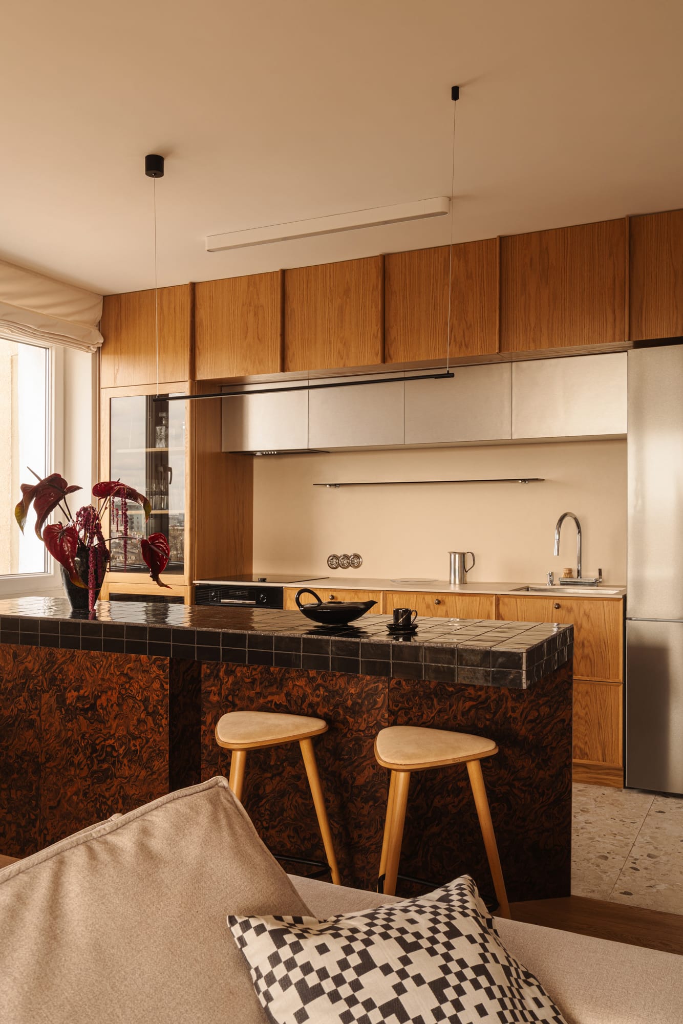 Naturalne materiały zestawiono ze szczotkowanym metalem i dymionym szkłem. Pojawiają się również nieregularne kafle Zellige, wypalana ceramika i dekoracyjny rysunek forniru zastosowanego na zabudowach, stanowiący ukłon w stronę designu lat 60. i 70.