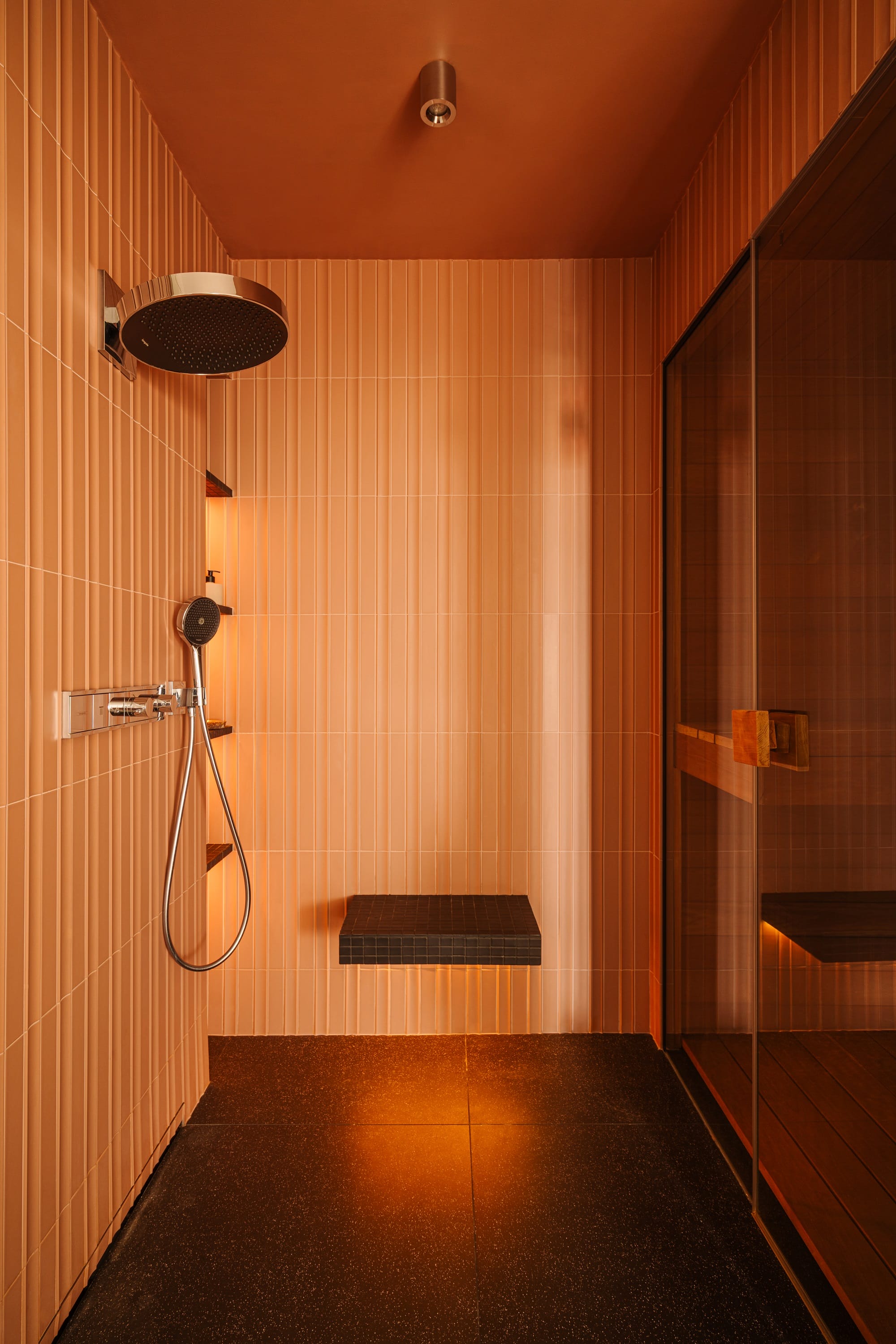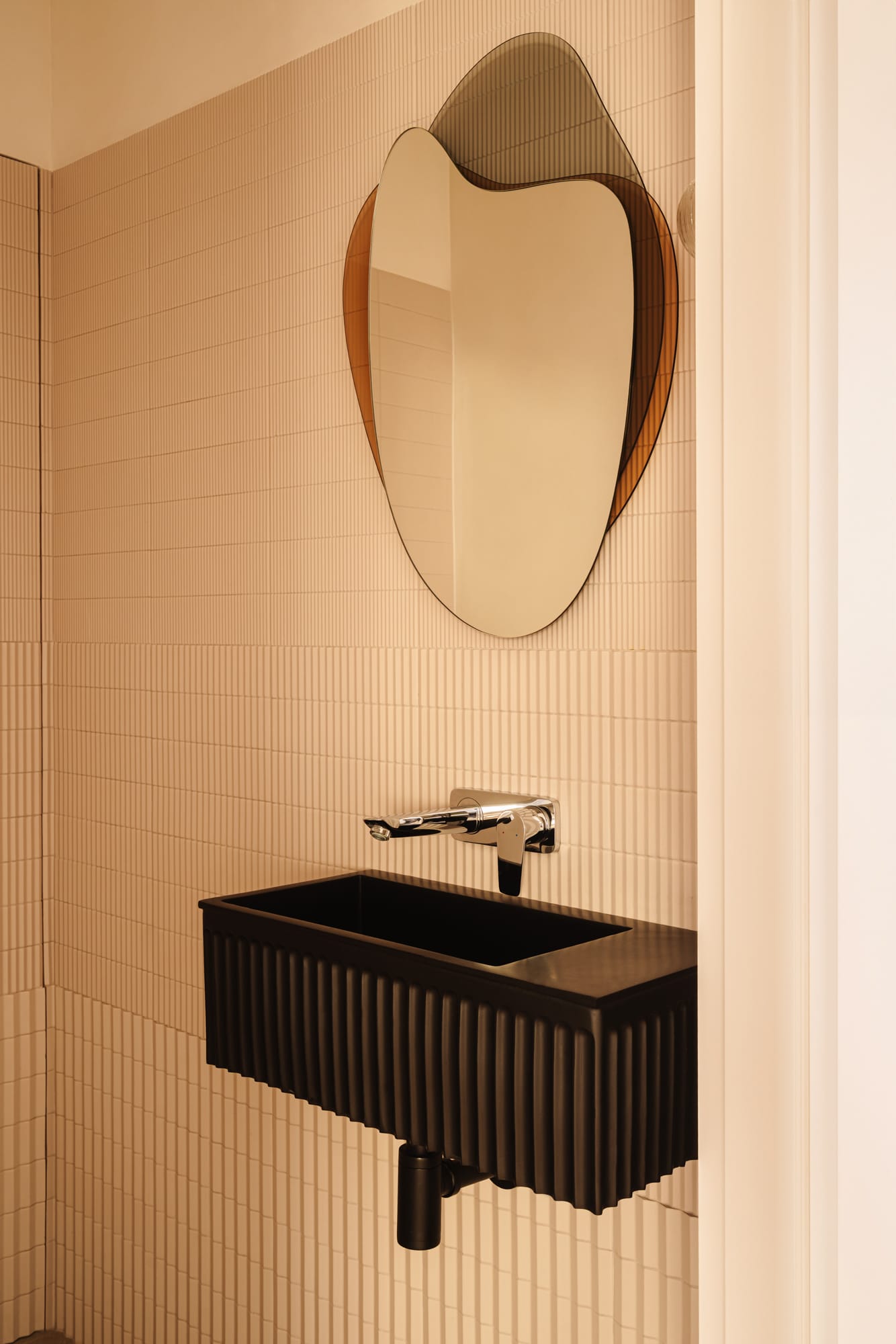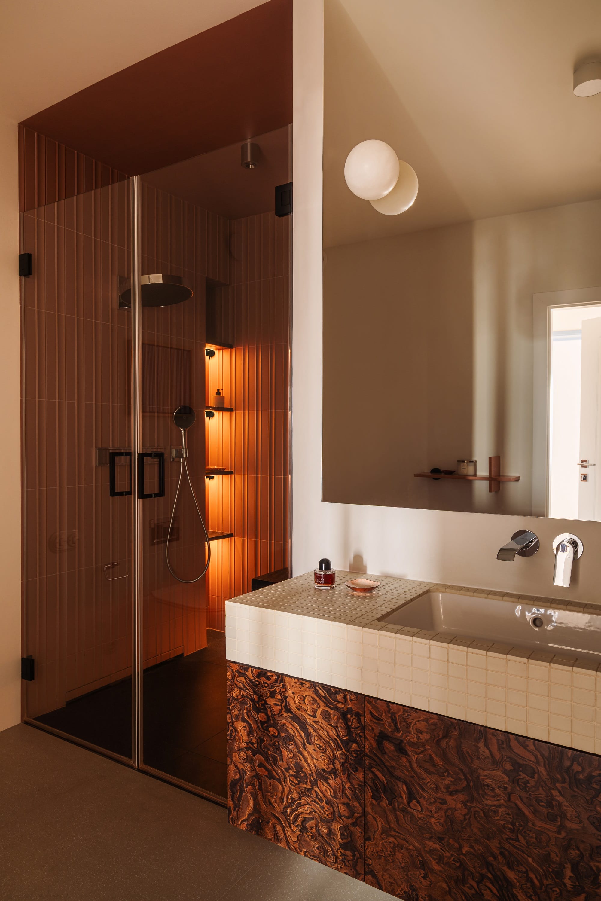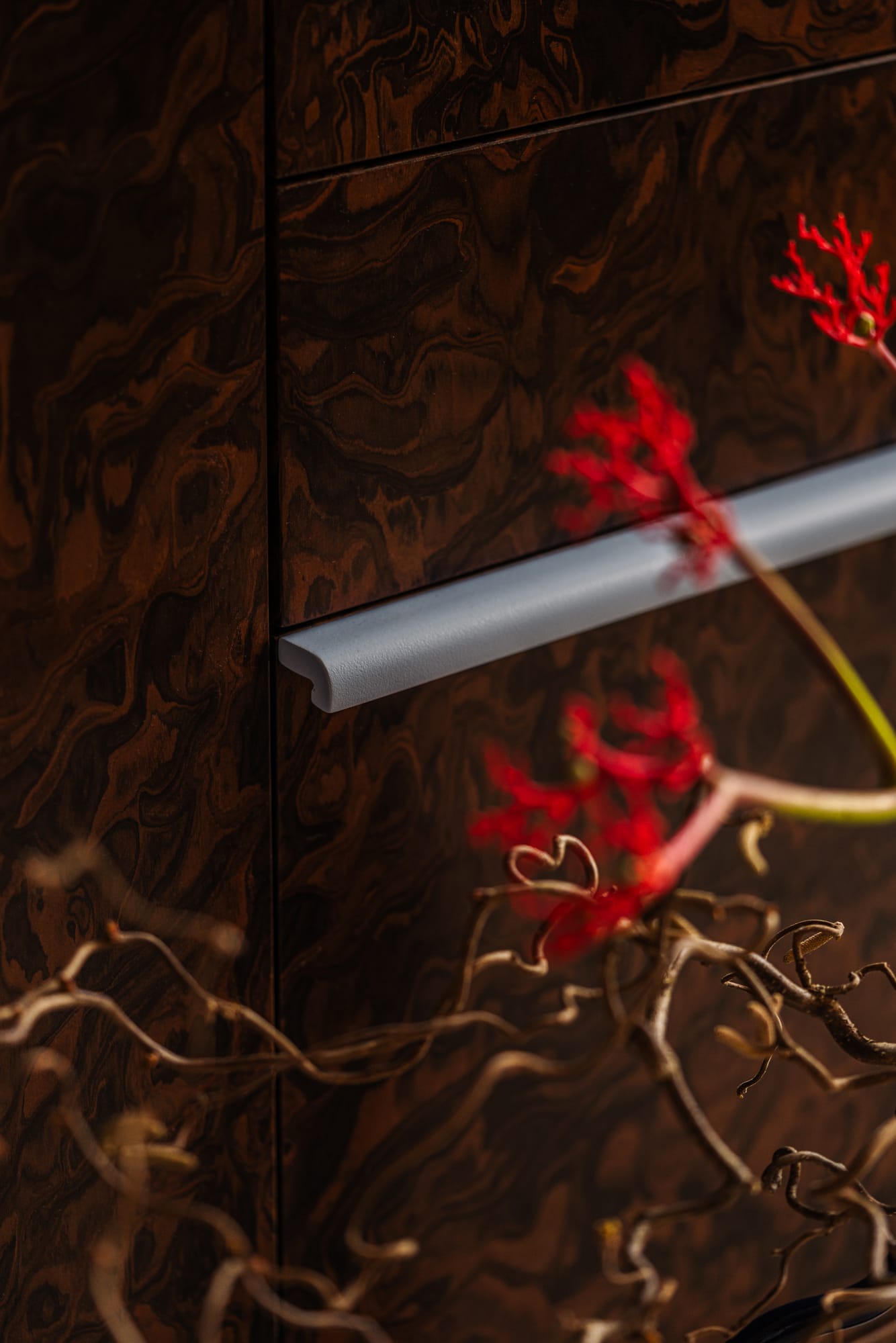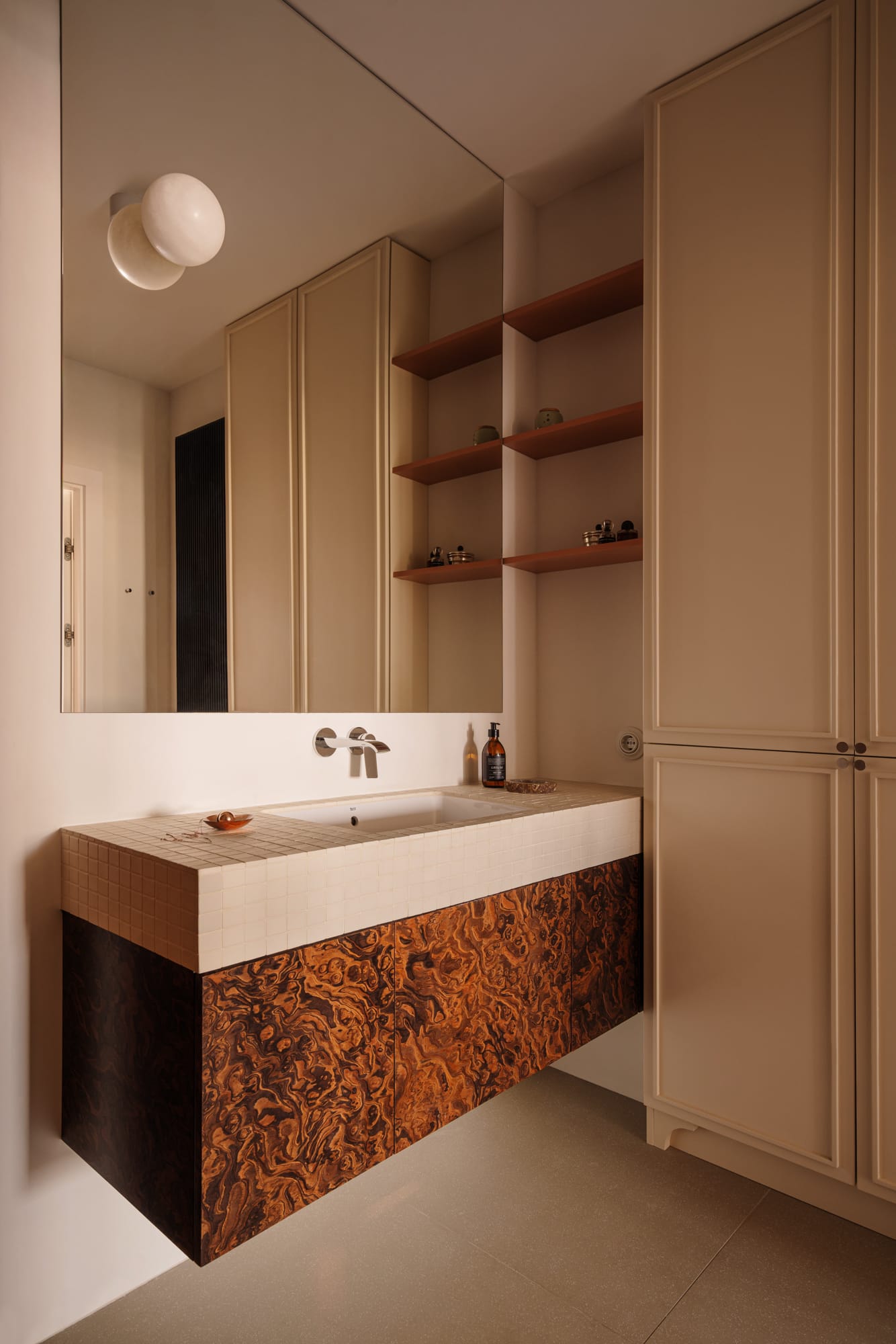Naturalne materiały zestawiono ze szczotkowanym metalem i dymionym szkłem. Pojawiają się również nieregularne kafle Zellige, wypalana ceramika i dekoracyjny rysunek forniru zastosowanego na zabudowach, stanowiący ukłon w stronę designu lat 60. i 70.