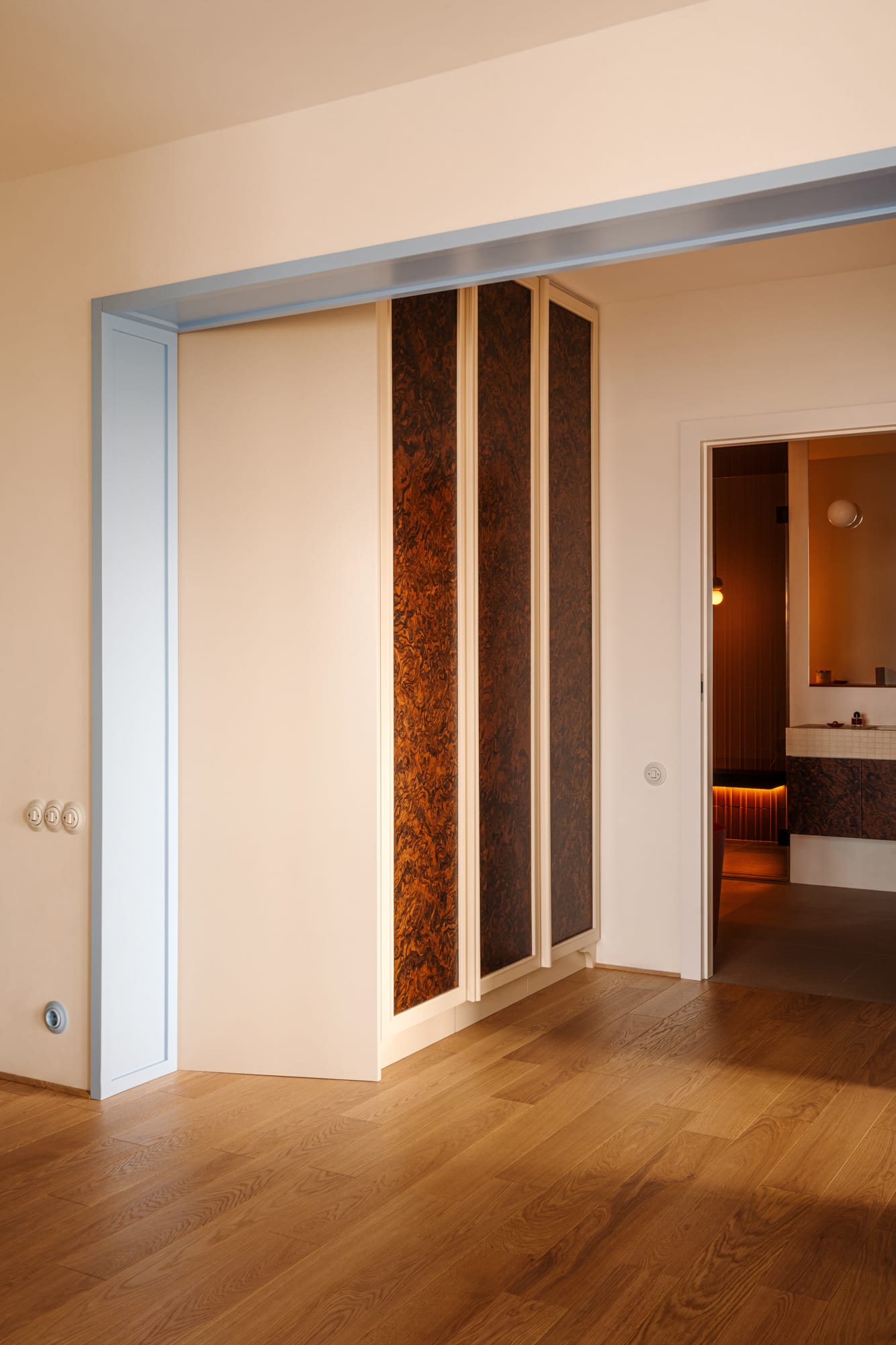 Uwagę zwraca błękitny portal oraz strukturalne farby i trójwymiarowe pustaki z kolekcji Mutina autorstwa Patricii Urquioli, oddzielających garderobę od sypialni.