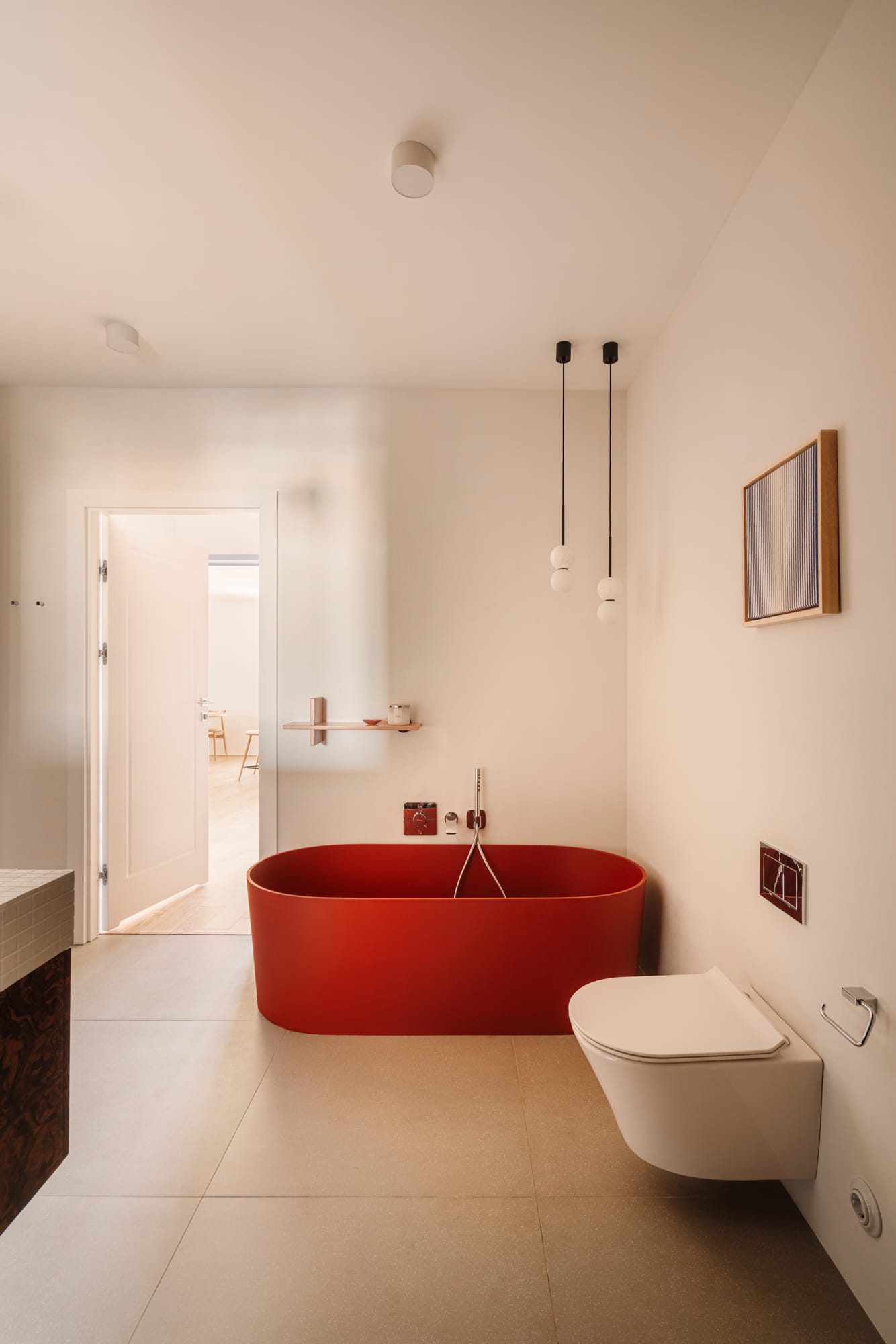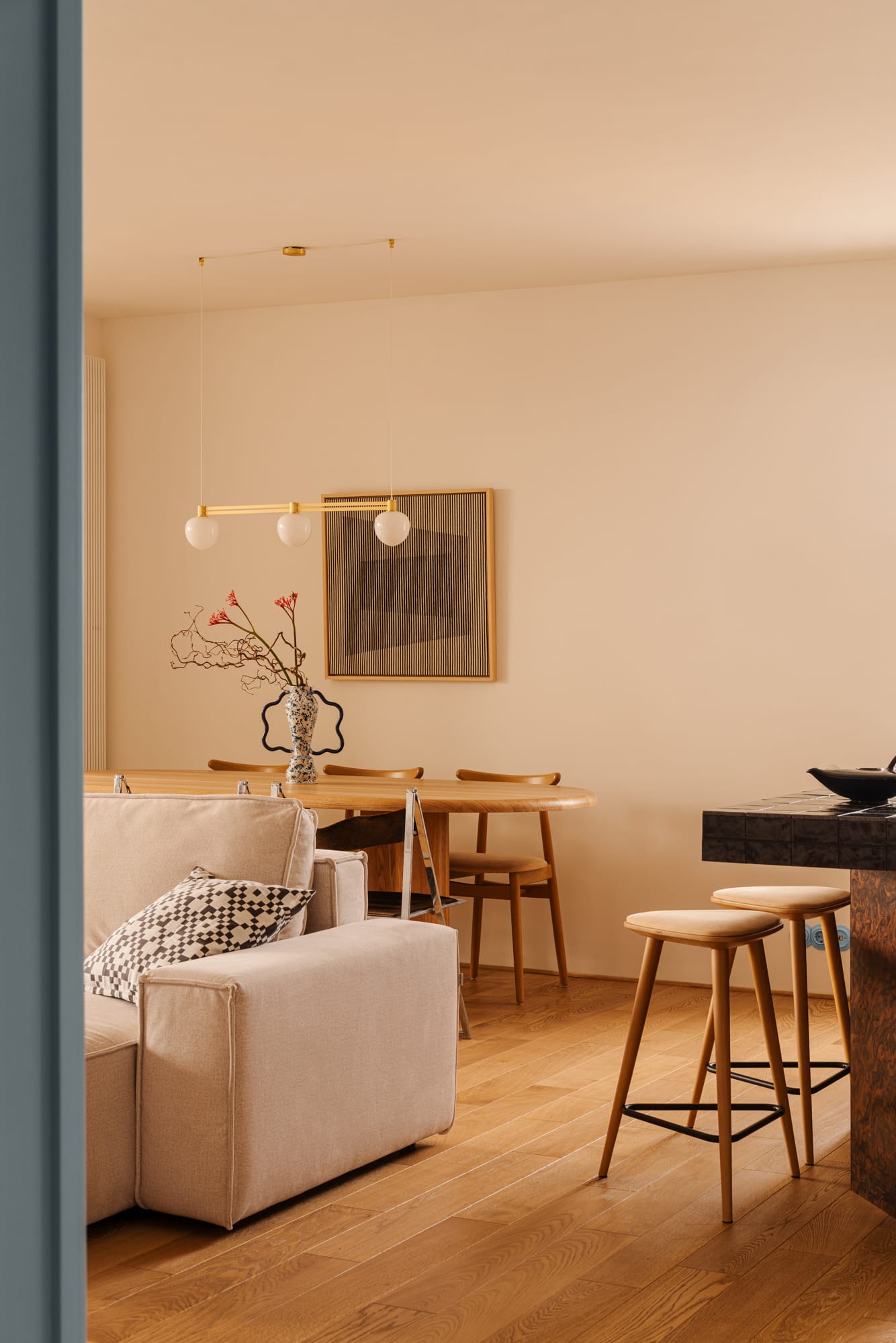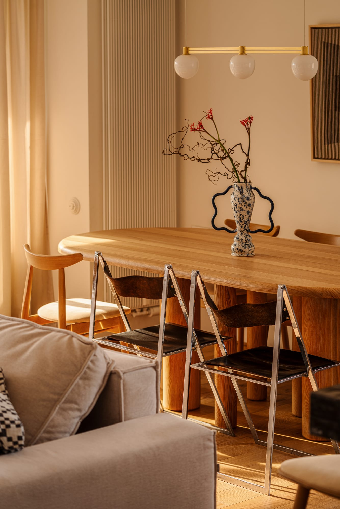 Wiszące lampy z jedwabnymi kloszami miękko rozpraszają światło, budując intymny, ciepły nastrój. Na ścianach zawisły prace Karoliny Szwed, która eksperymentuje z techniką haftu i prostymi formami geometrycznymi. Z kolei przy stole w jadalni stanęły składane krzesła Elios zaprojektowane przez Fontoni & Geraci w latach 60., kolejny ukłon w stronę modernistycznej tożsamości kamienicy, w której znajduje się mieszkanie.