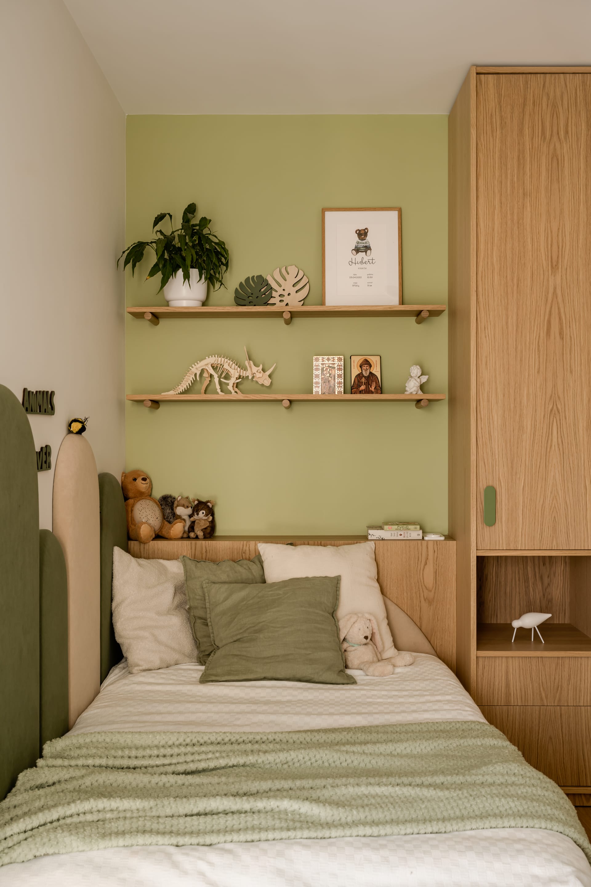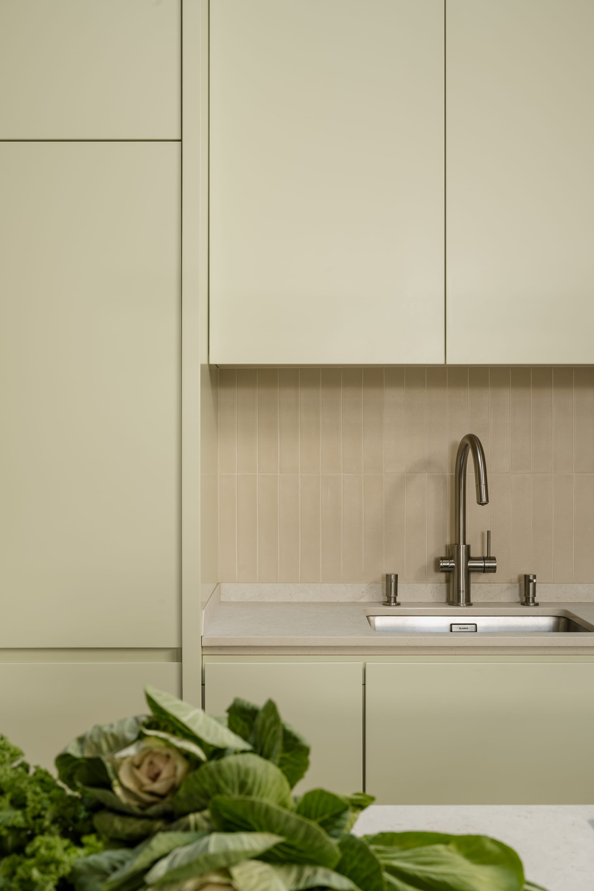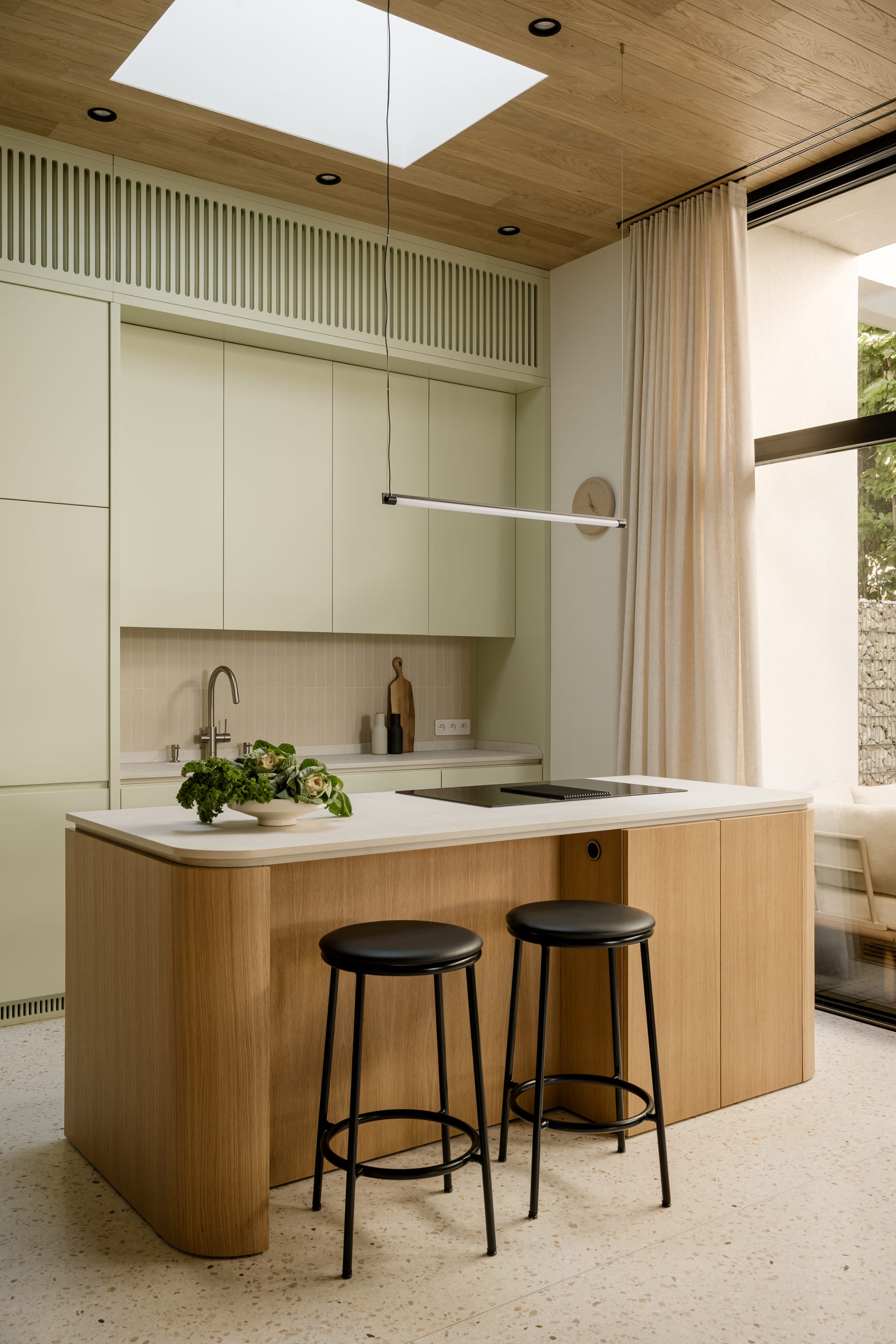 Minimalistyczną zabudowę kuchni w szałwiowym odcieniu dopełnia fornirowa wyspa. – Duża, zaokrąglona wyspa pełni kilka ról. To miejsce przygotowywania posiłków, ale też przestrzeń do rozmów i wspólnego spędzania czasu domowników – podkreśla architektka.