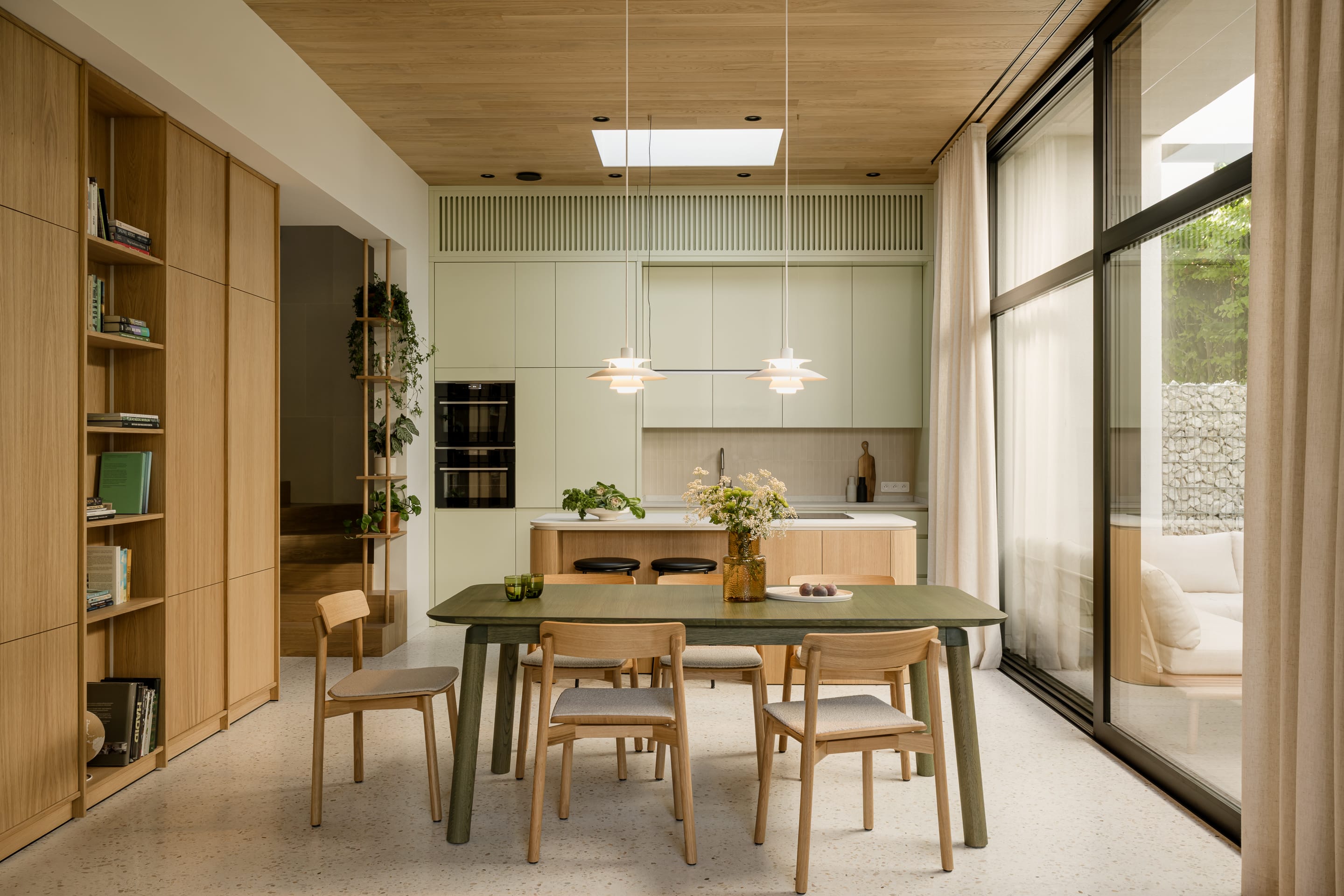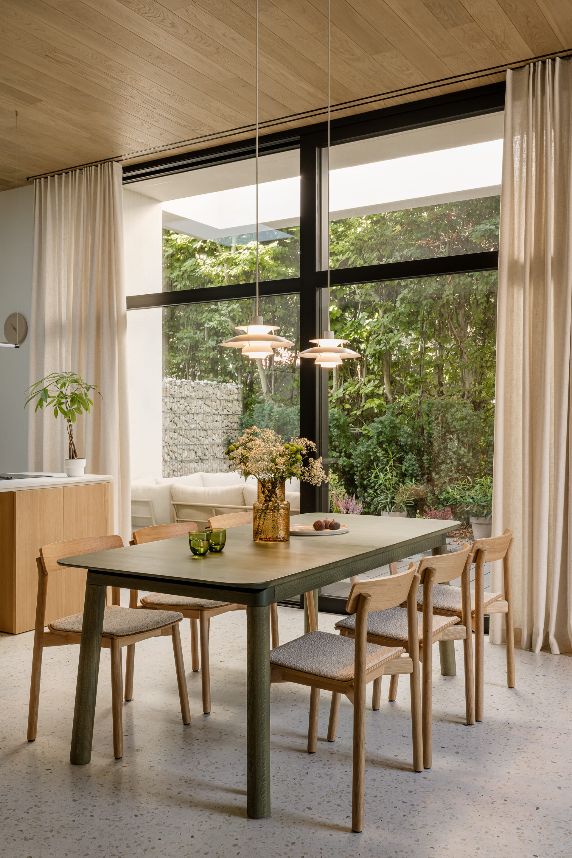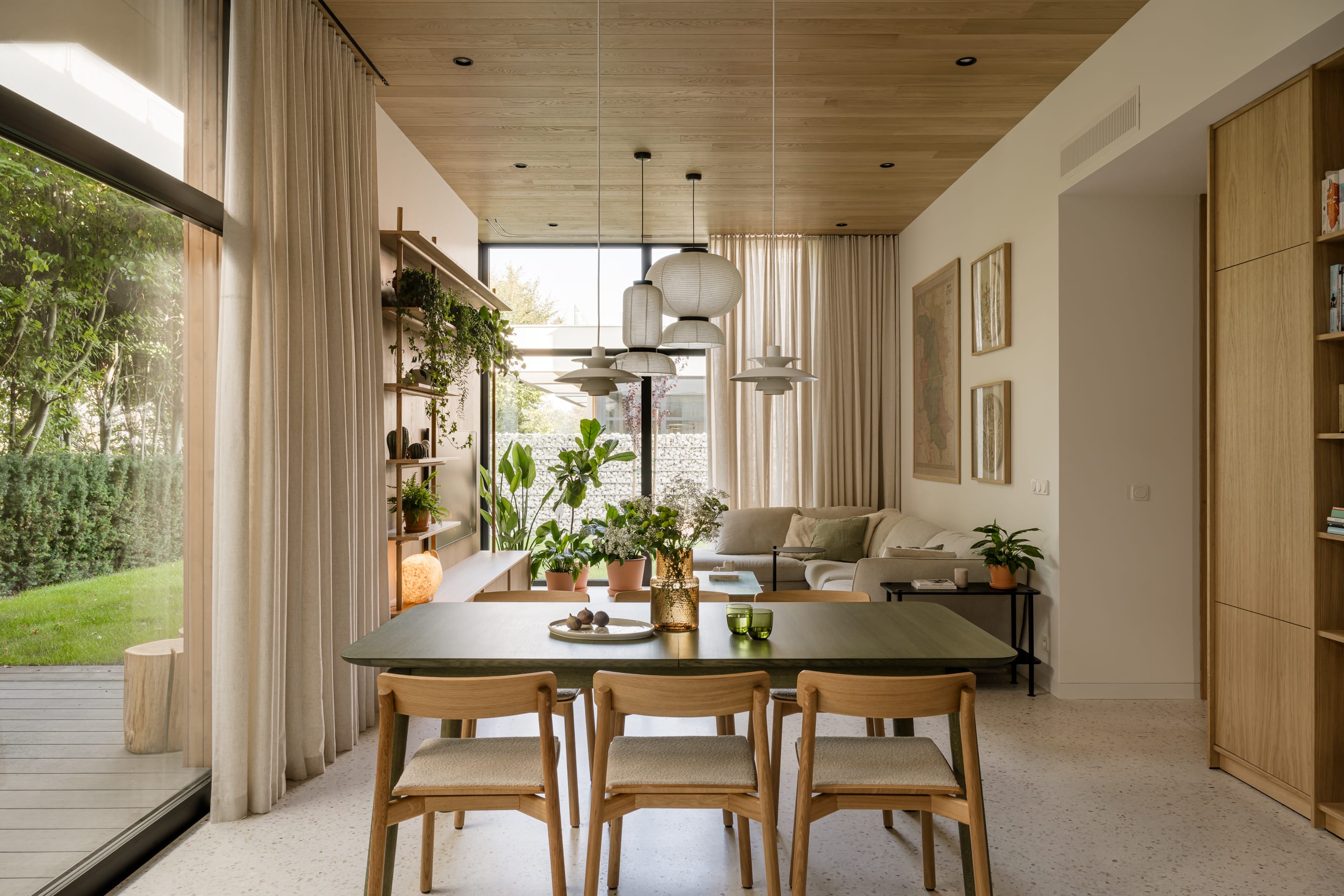 Kuchnia, jadalnia i salon funkcjonują jako jedna przestrzeń. Motyw braku granic szczególnie wyraźnie wybrzmiewa w postaci wysokich od podłogi do sufitu okien oddzielających wnętrze domu od ogrodu oraz posadzki z lastryko, która płynnie łączy wszystkie strefy. Jako przeciwwaga do posadzki nad strefą dzienną pojawił się drewniany sufit, który nadaje przestrzeni ciepłego wyrazu.