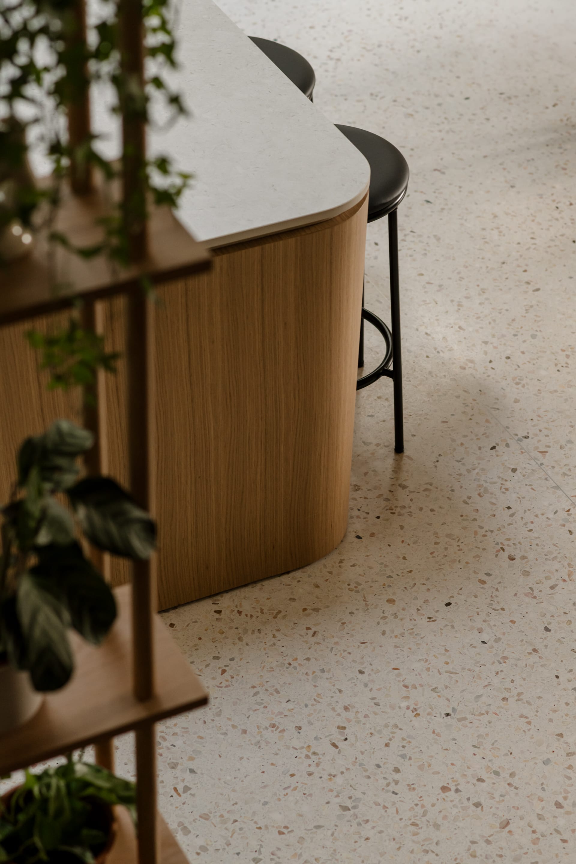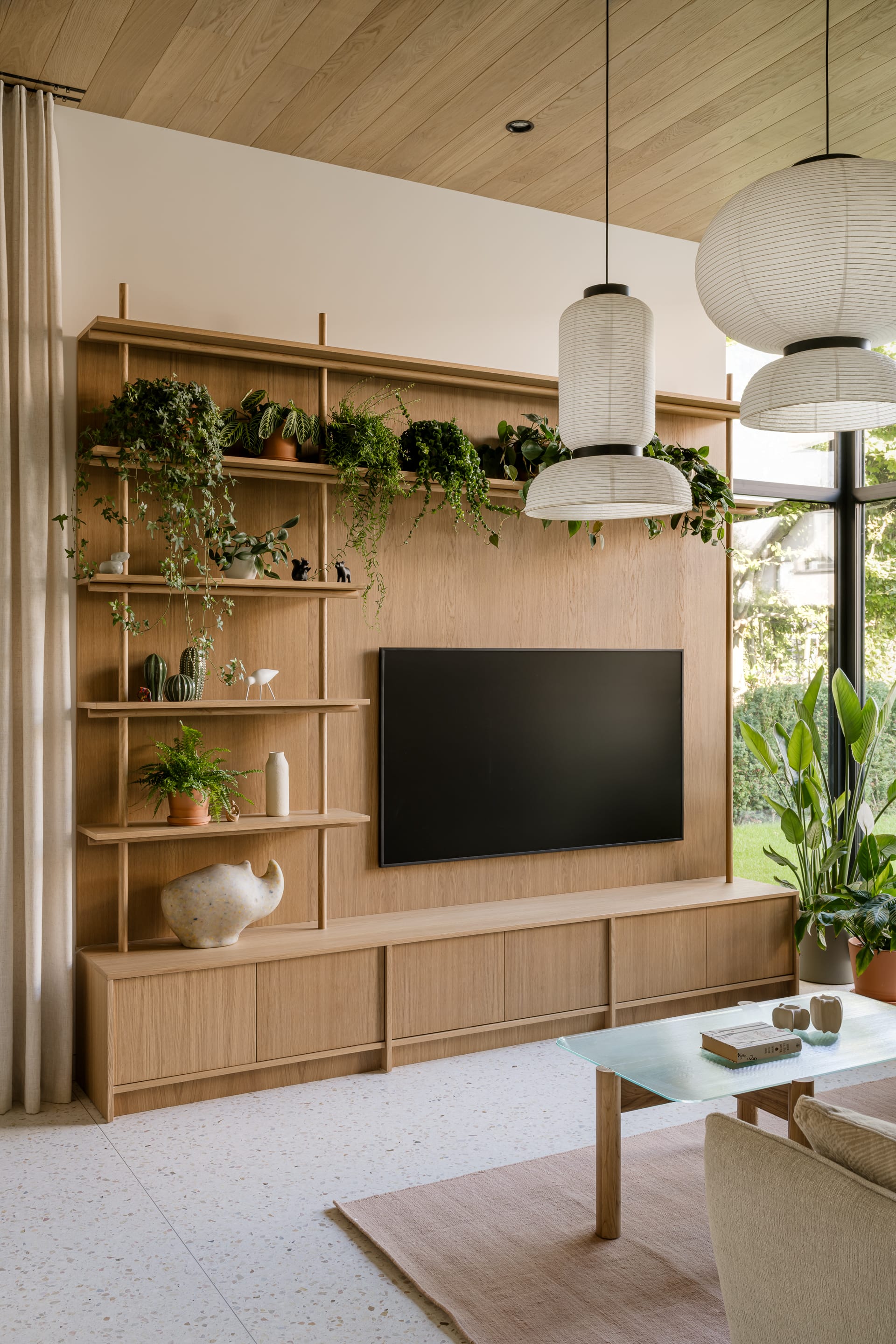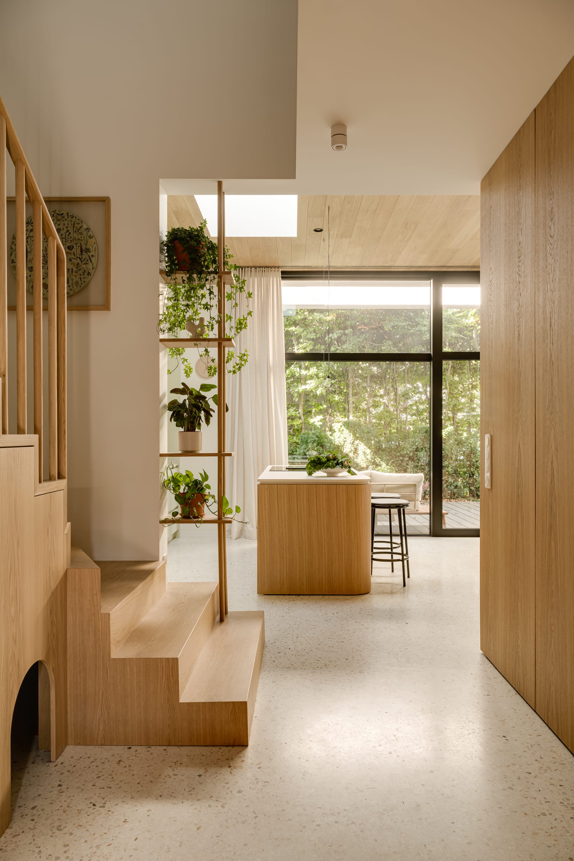 Kuchnia, jadalnia i salon funkcjonują jako jedna przestrzeń. Motyw braku granic szczególnie wyraźnie wybrzmiewa w postaci wysokich od podłogi do sufitu okien oddzielających wnętrze domu od ogrodu oraz posadzki z lastryko, która płynnie łączy wszystkie strefy. Jako przeciwwaga do posadzki nad strefą dzienną pojawił się drewniany sufit, który nadaje przestrzeni ciepłego wyrazu.