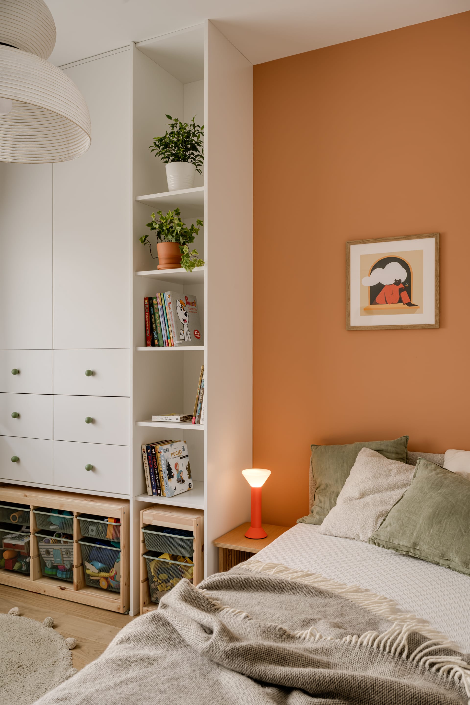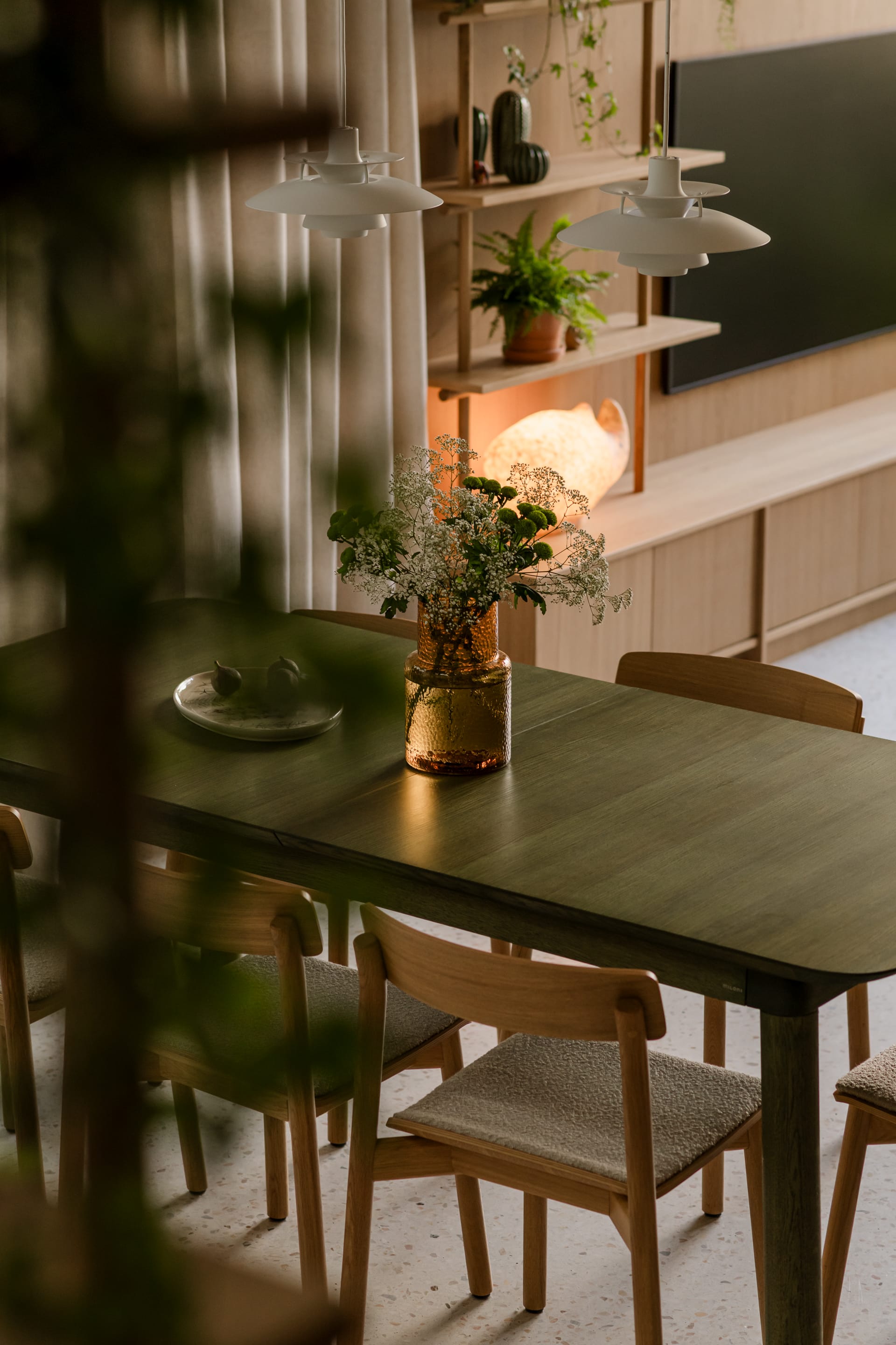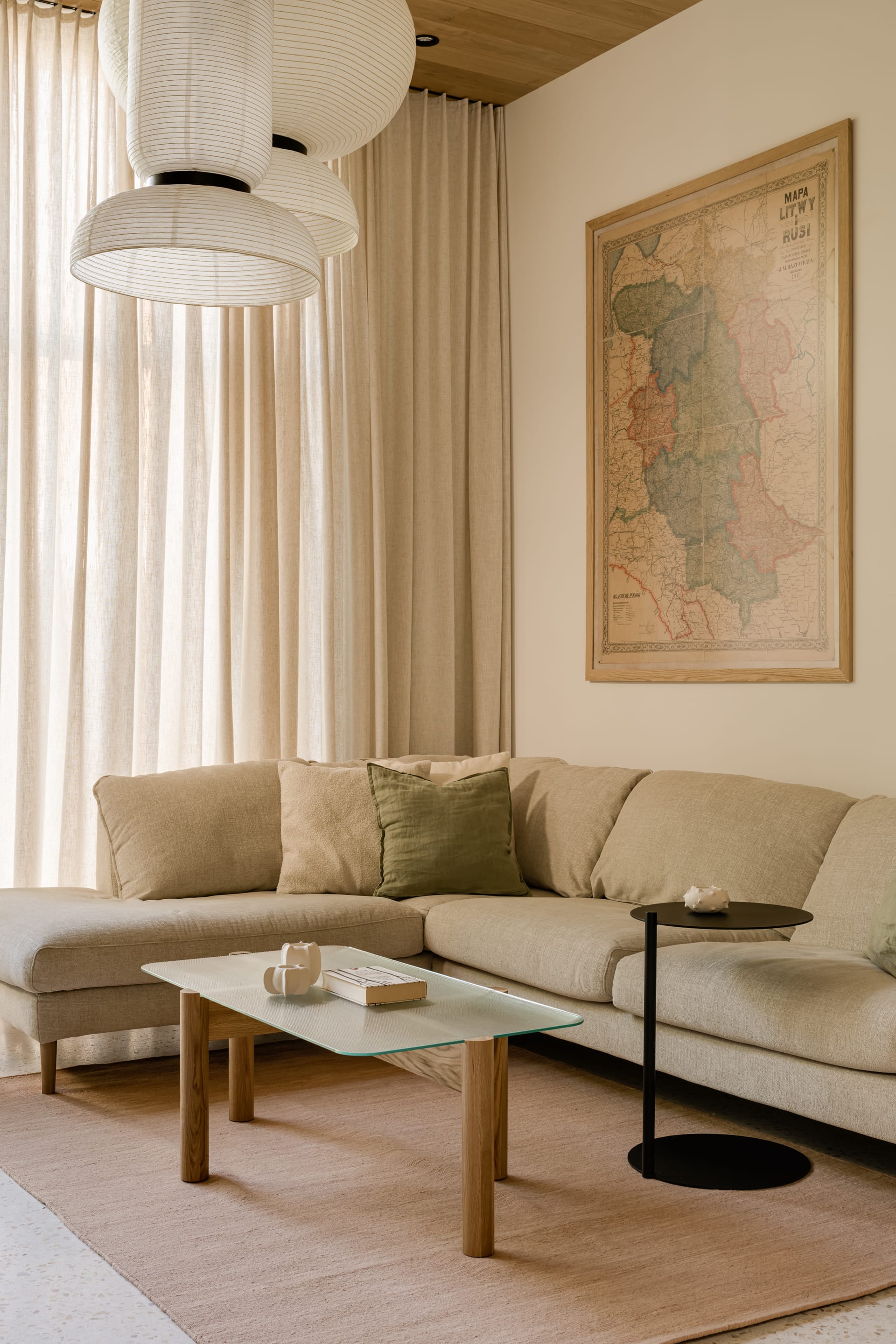 Na ścianie nad sofą zawisła stara mapa w drewnianych ramach, niegdyś należąca do pradziadka właścicielki. Obok pojawiły się prace lokalnej artystki z suszonych polnych kwiatów. Wieczorem przestrzeń zmienia charakter dzięki miękkiemu światłu lamp &Tradition oraz klasycznych PH5 od duńskiej marki Louis Poulsen.