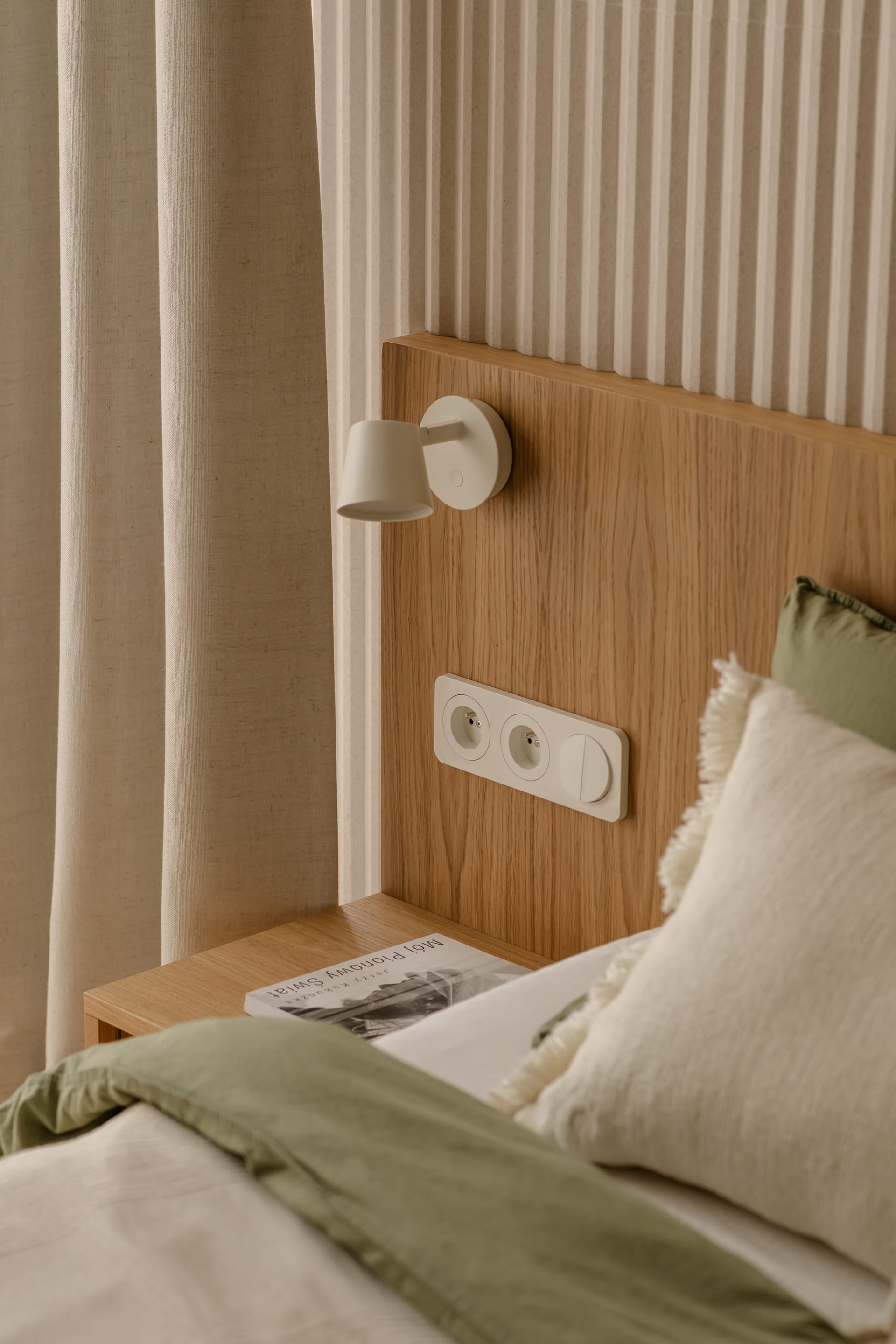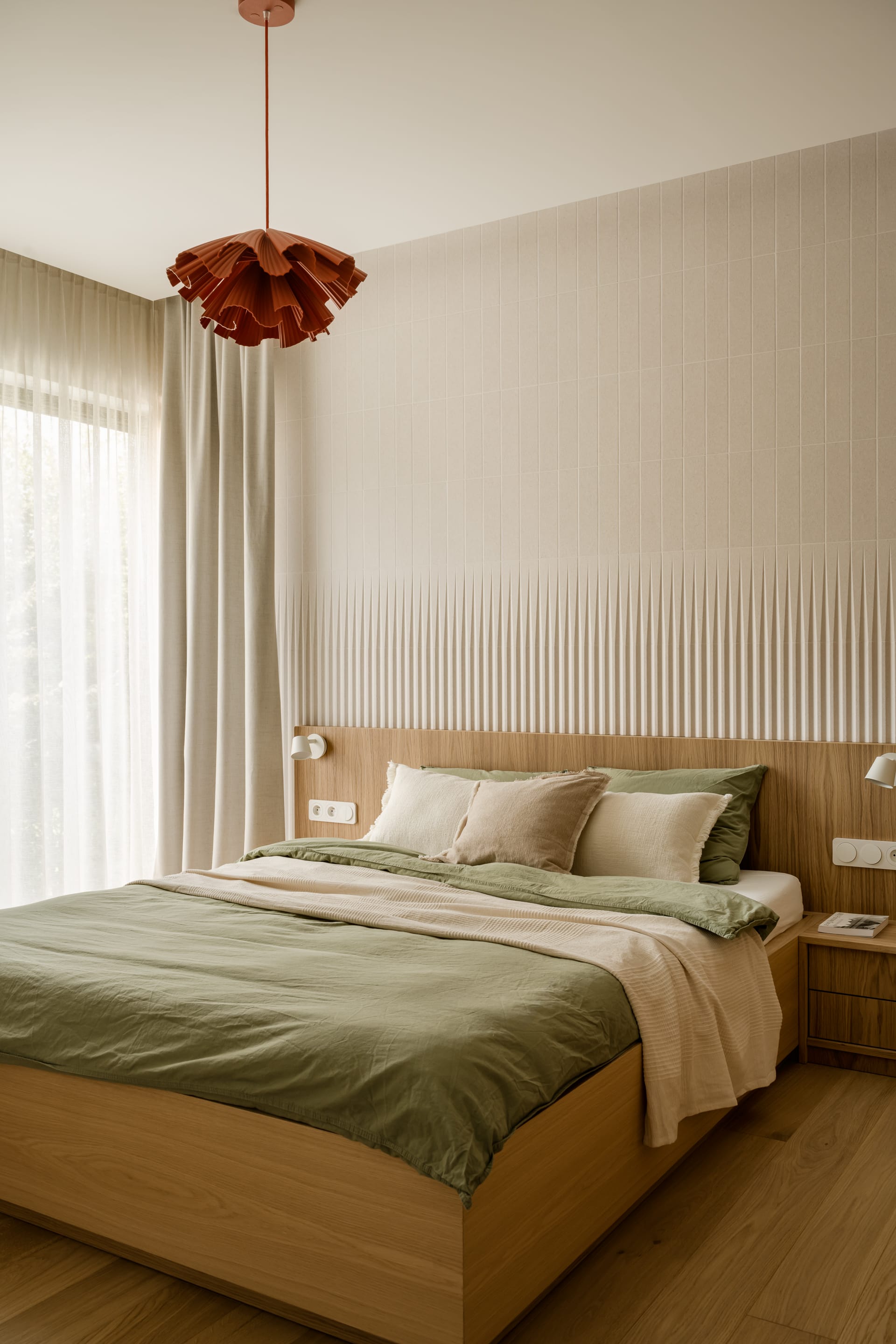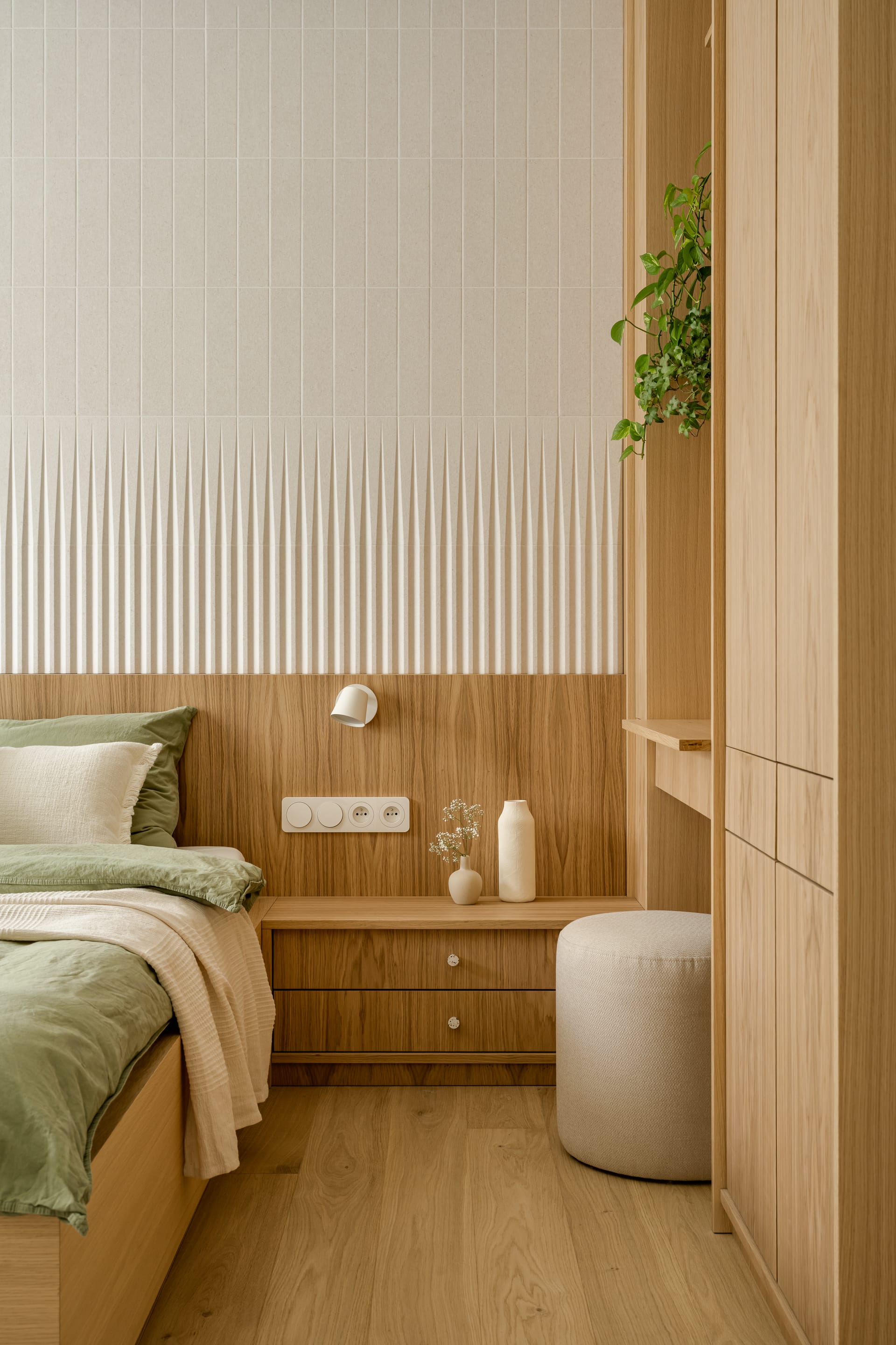 Piętro to prywatna enklawa, obejmująca sypialnie, garderobę i łazienki. W sypialni głównej trójwymiarowa struktura płytek Wow Design tworzy subtelną grę światła i cienia, kontrastując z drewnianym wezgłowiem. Rytm pionowych, ryflowanych elementów powtarza się także w balustradzie i meblach. – Oczywiście w sypialni musiało się też znaleźć miejsce dla roślin, których miłośniczką jest właścicielka domu – mówi Bryniarska.