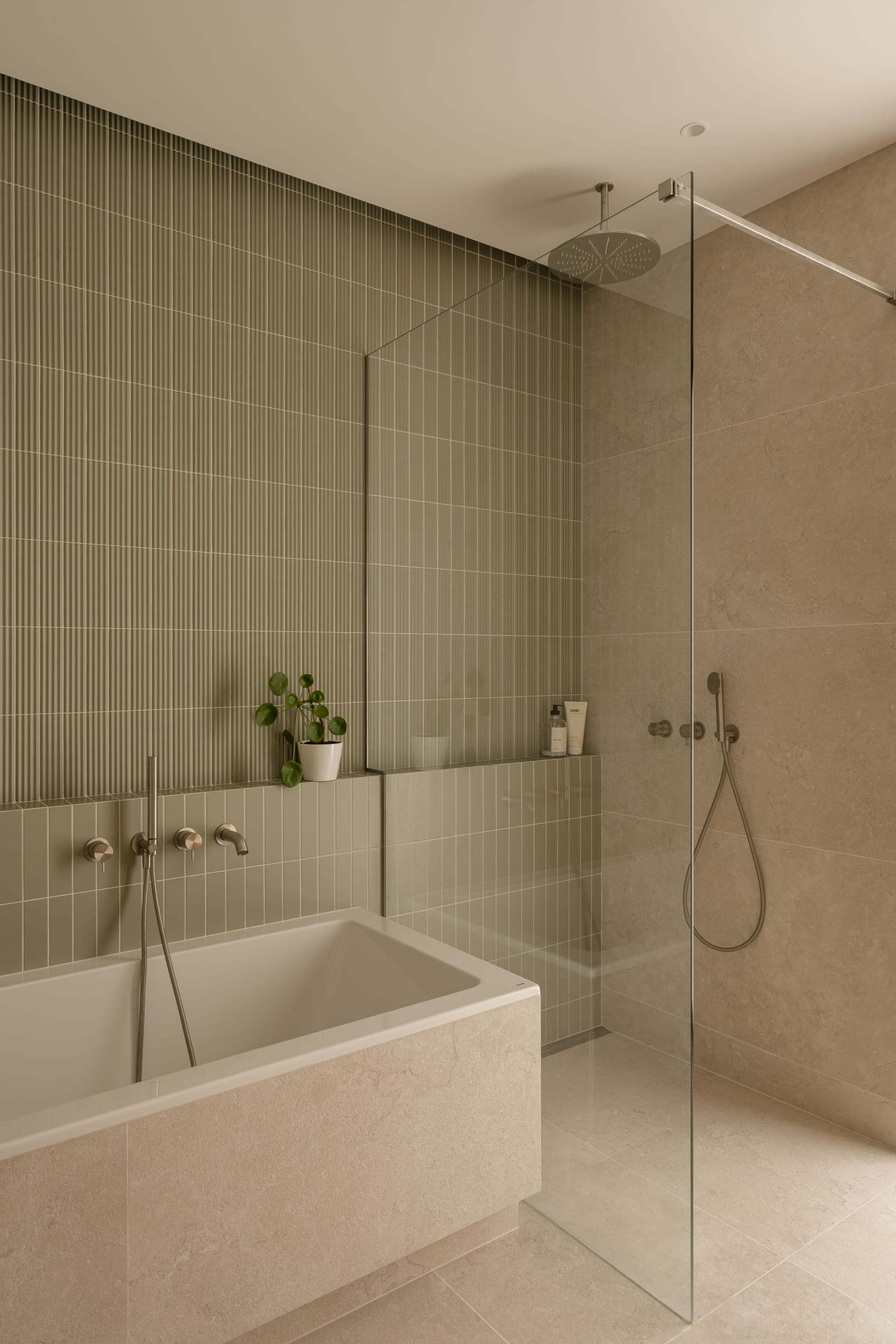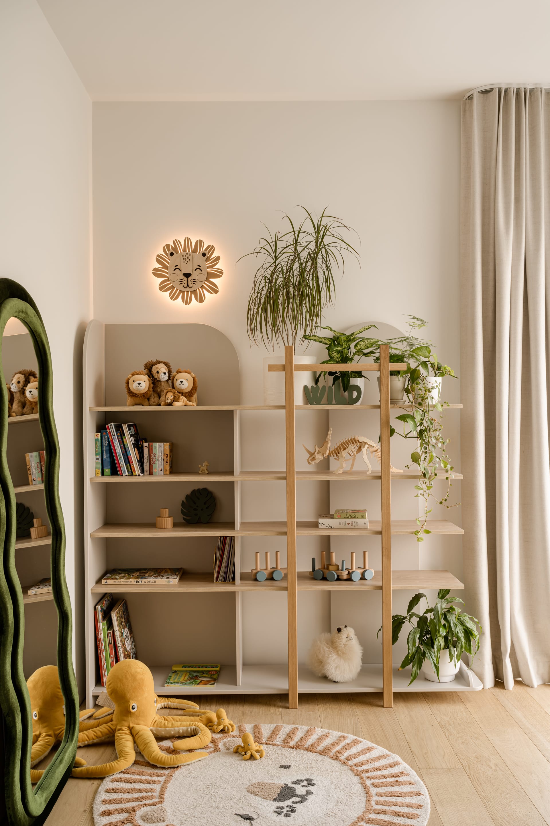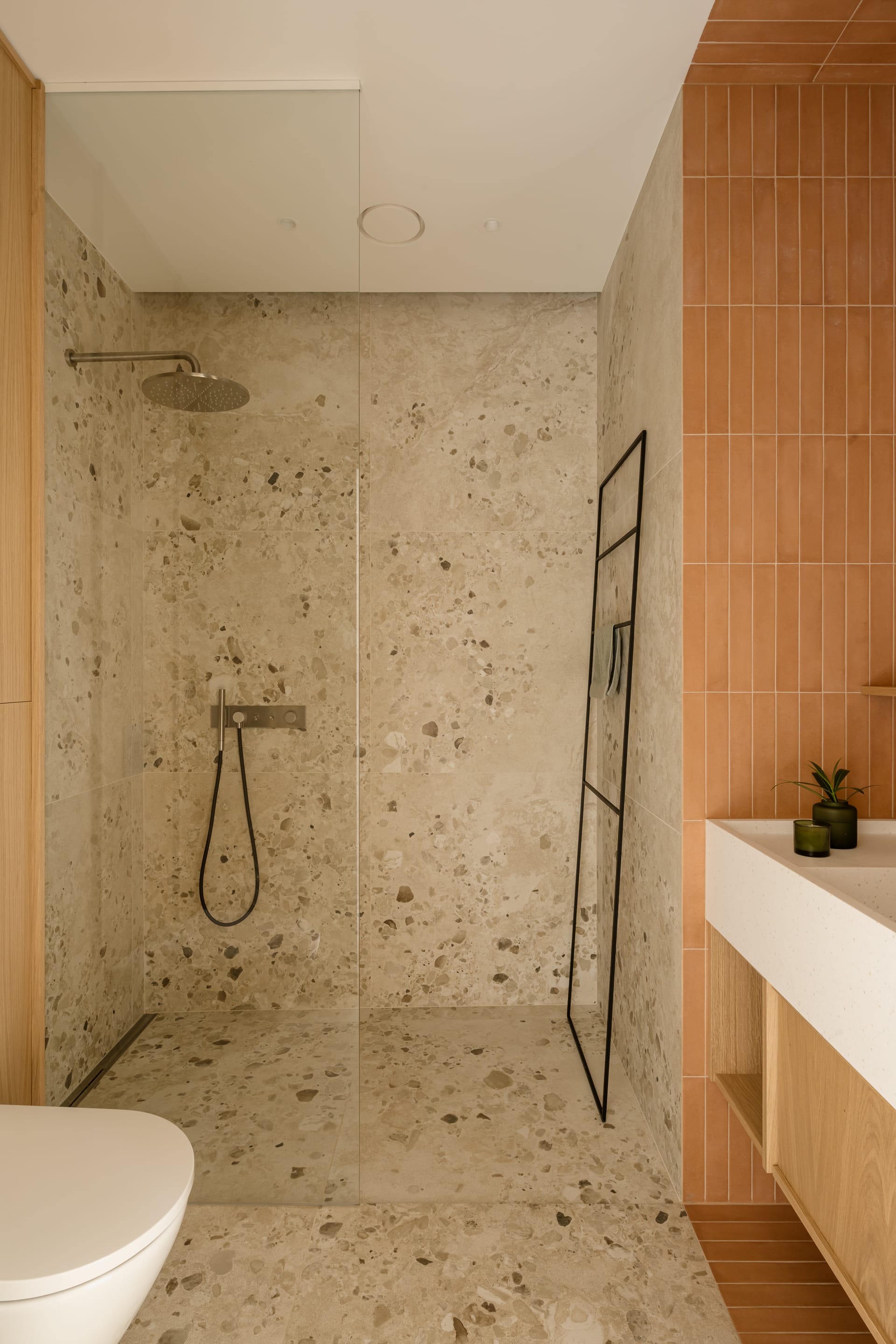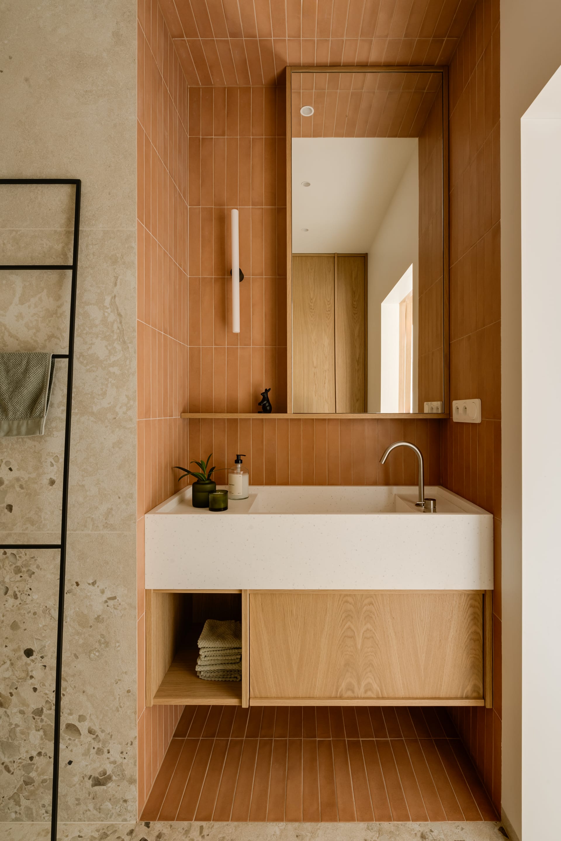 Piętro to prywatna enklawa, obejmująca sypialnie, garderobę i łazienki. W sypialni głównej trójwymiarowa struktura płytek Wow Design tworzy subtelną grę światła i cienia, kontrastując z drewnianym wezgłowiem. Rytm pionowych, ryflowanych elementów powtarza się także w balustradzie i meblach. – Oczywiście w sypialni musiało się też znaleźć miejsce dla roślin, których miłośniczką jest właścicielka domu – mówi Bryniarska.