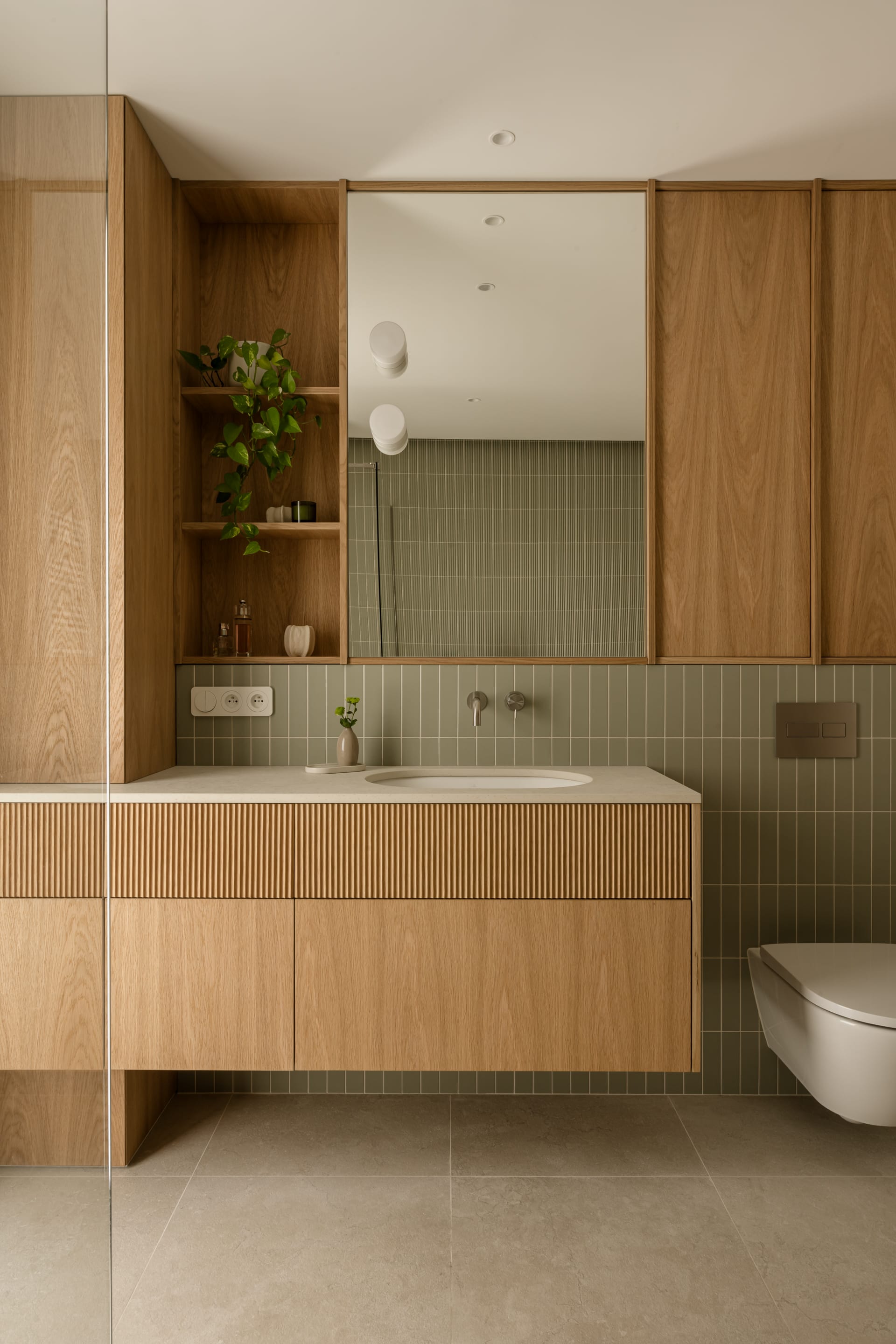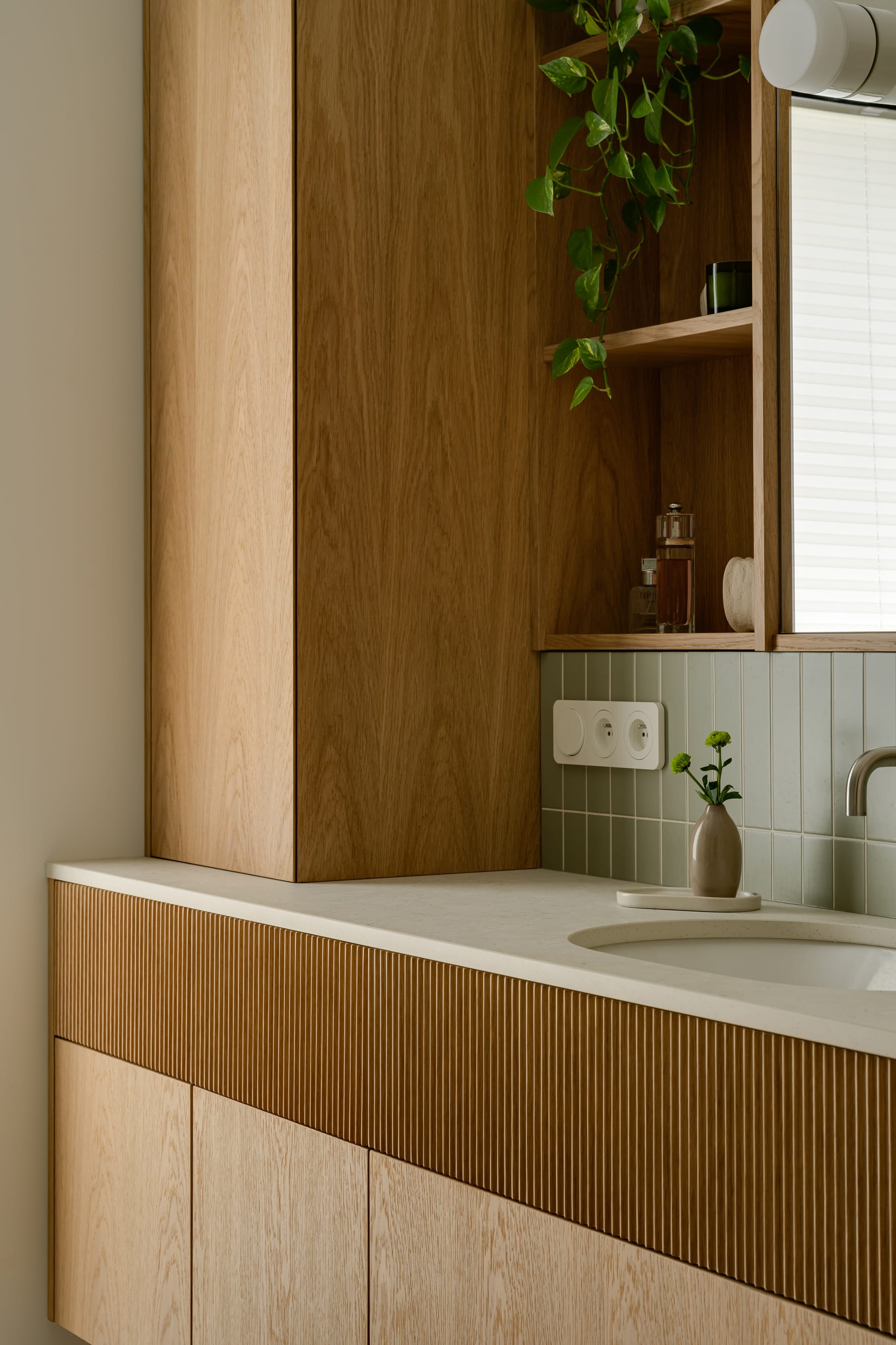 Łazienka na piętrze rozwija tę estetykę. Drewniana zabudowa z pionowymi elementami frontów wprowadza wyraźny rytm i fakturę. Motyw z trójwymiarowych płytek nad wanną został subtelnie przeniesiony na ryflowane, drewniane fronty szuflad. Całość dopełnia armatura w kolorze stali szczotkowanej. – W całym domu celowo unikałam chłodnych, połyskliwych materiałów – zaznacza projektantka.