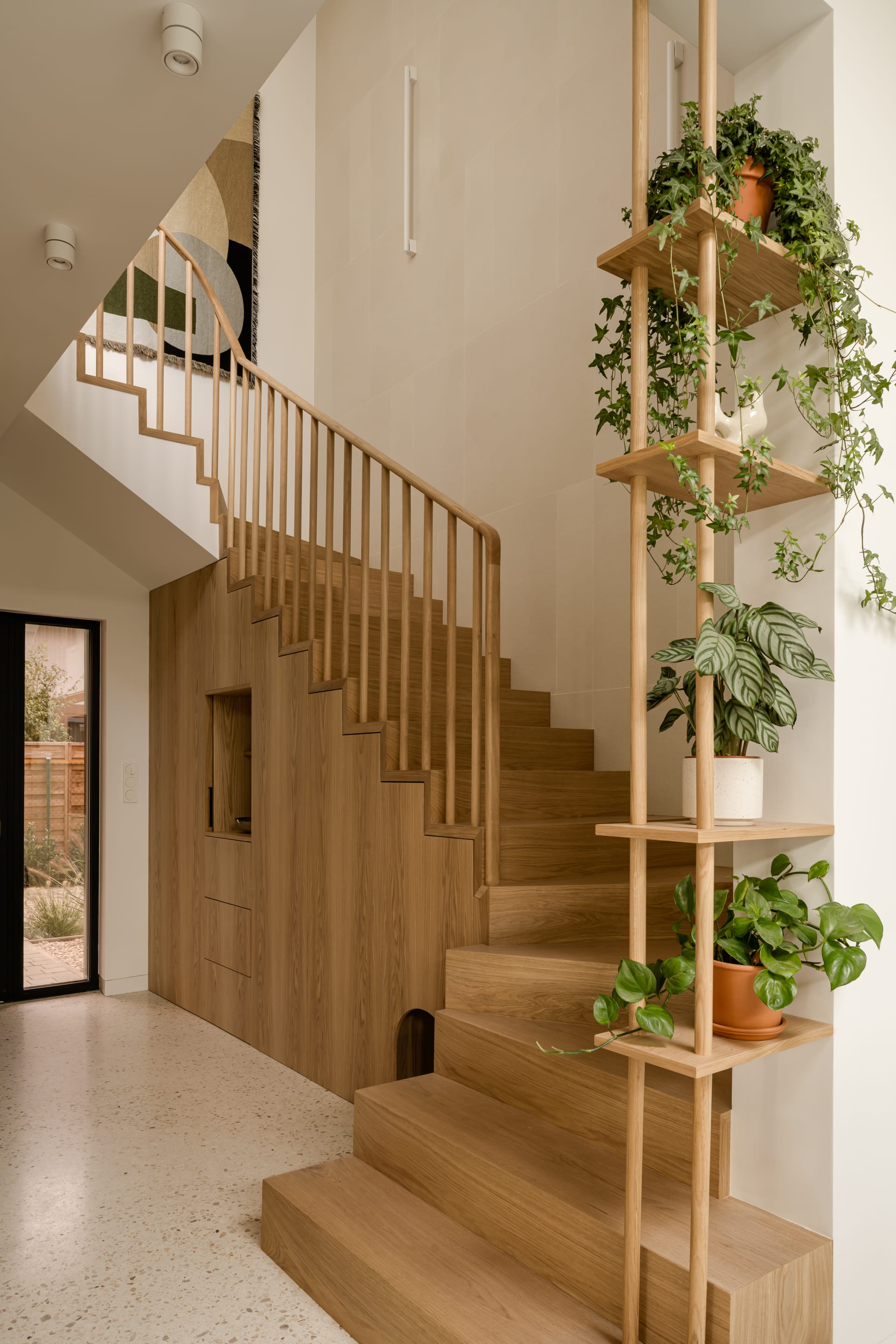 Poczucie otwartości pojawia się już od progu, w holu bezpośrednio przechodzącym w strefę dzienną. Przestrzeń porządkuje zabudowa klatki schodowej prowadzącej na bardziej prywatne piętro domu – pod schodami ukryto garderobę, schowki i legowisko psa.