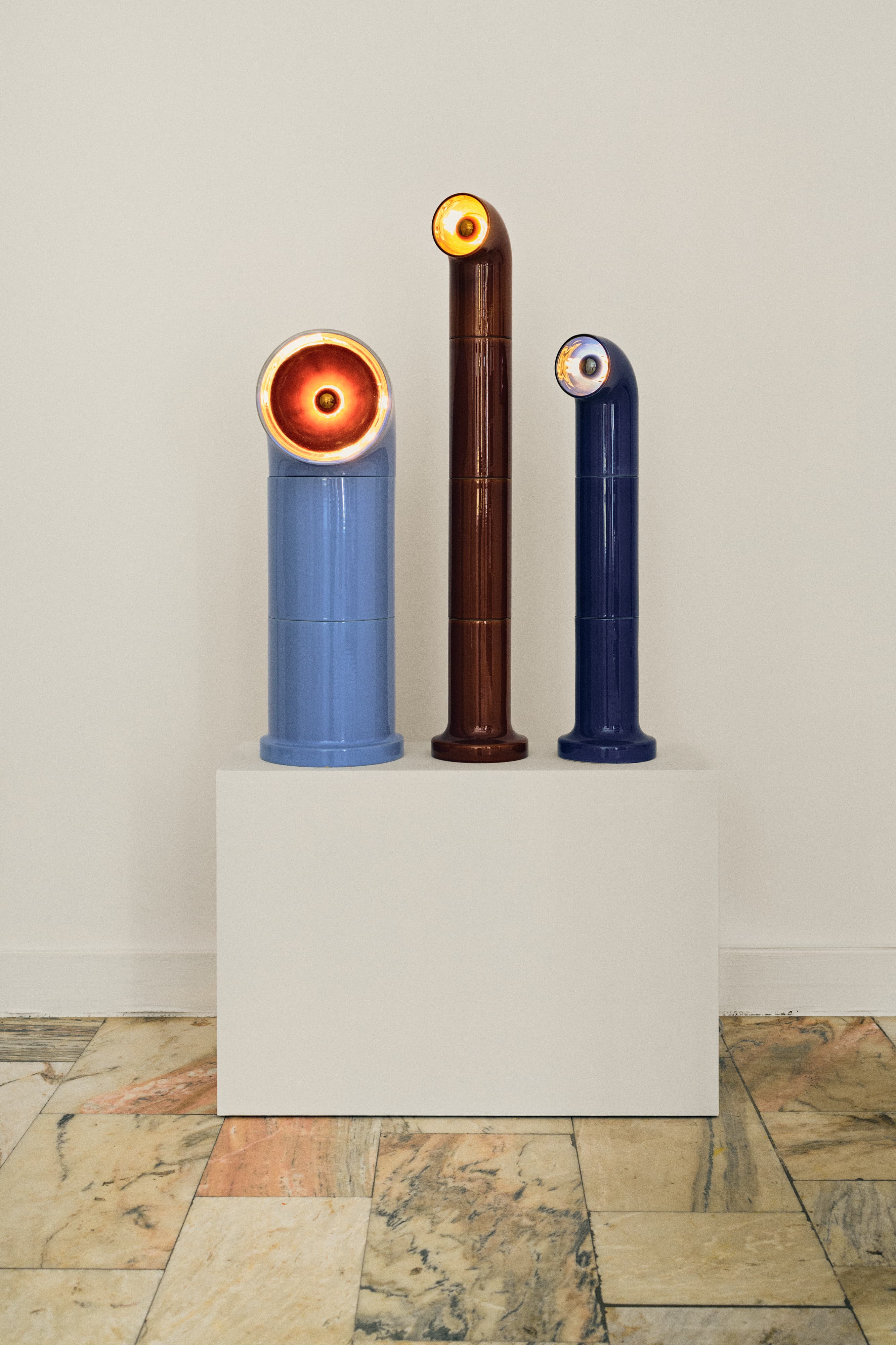 Lampa stojąca, modułowa, dopasowująca swoją wysokość do funkcji i potrzeb użytkownika. Jej masywne ciało, budzące skojarzenia z materią ożywioną, wieńczy wklęsłe oko w kontrastującym kolorze. Po zapaleniu żarówki, oko wypełnia się światłem wydobywając esencję ukrytego koloru. Światło FAT OP skierowane jest do wewnątrz, na materialną urodę materiału ceramicznego i zachwycającą głębię kolorów szkliw.
