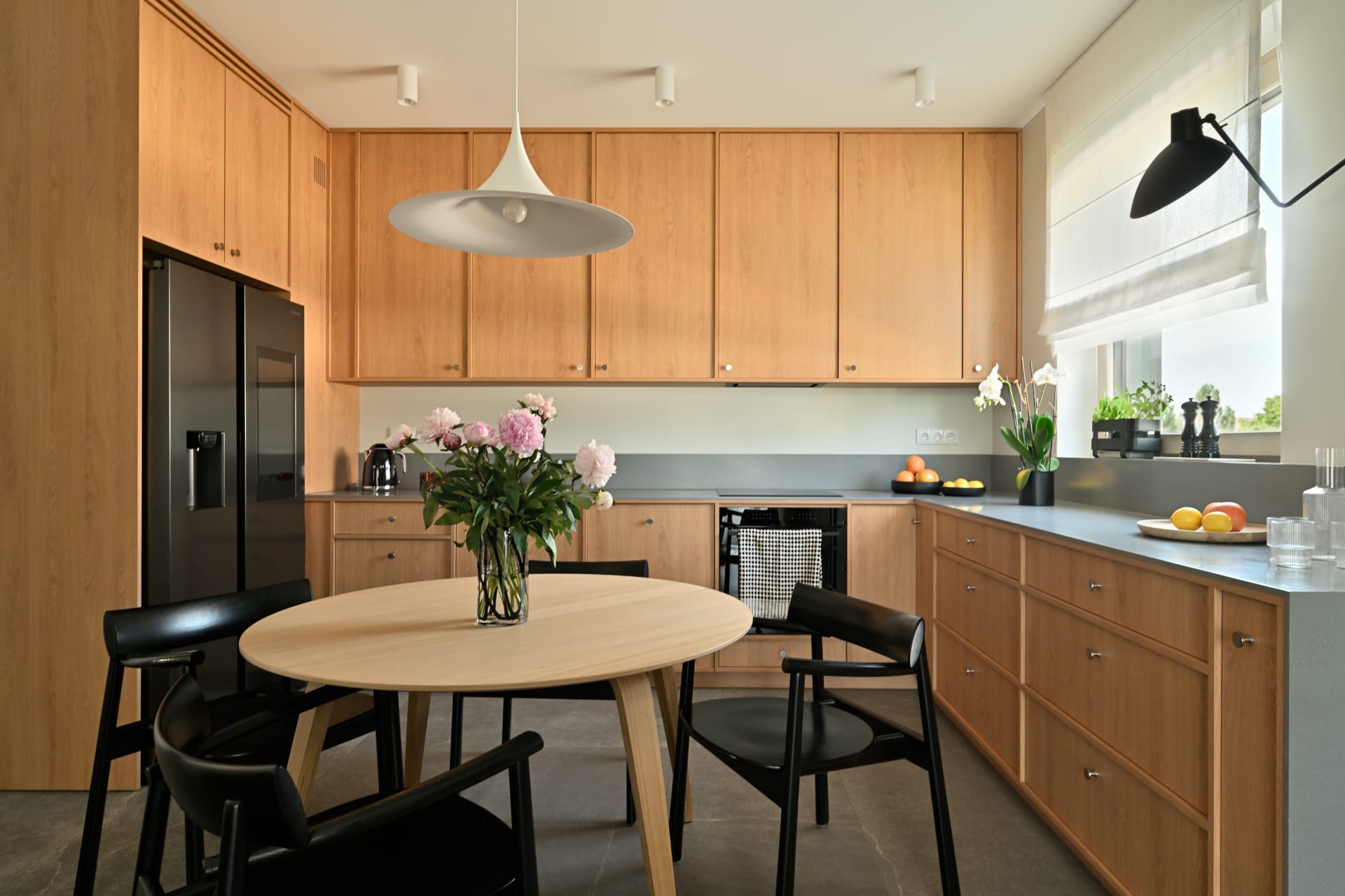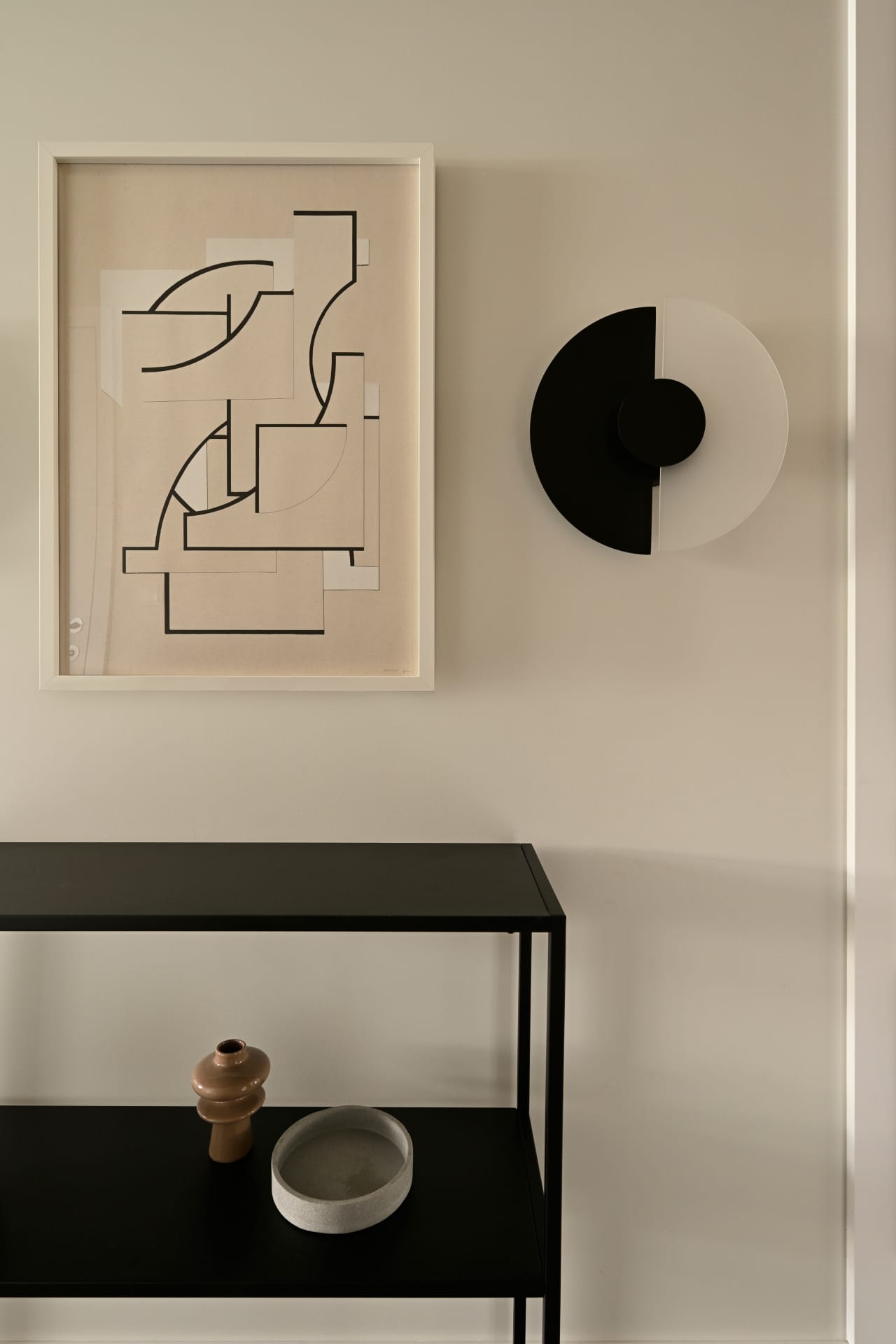 Właścicielom zależało na wyważonym minimalizmie, dlatego każdy element ma znaczenie. Obok komody Tamo pojawiły się czarne krzesła tej samej marki, zestawione z fornirowanym stołem Gubi. W całym mieszkaniu przewijają się także grafiki kopenhaskiego duetu Atelier Cph.
