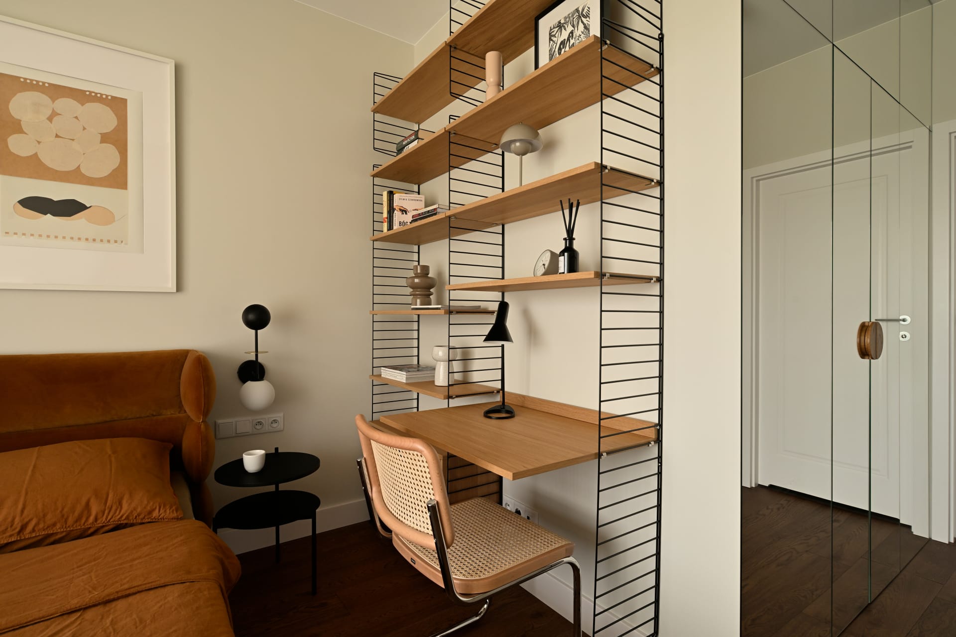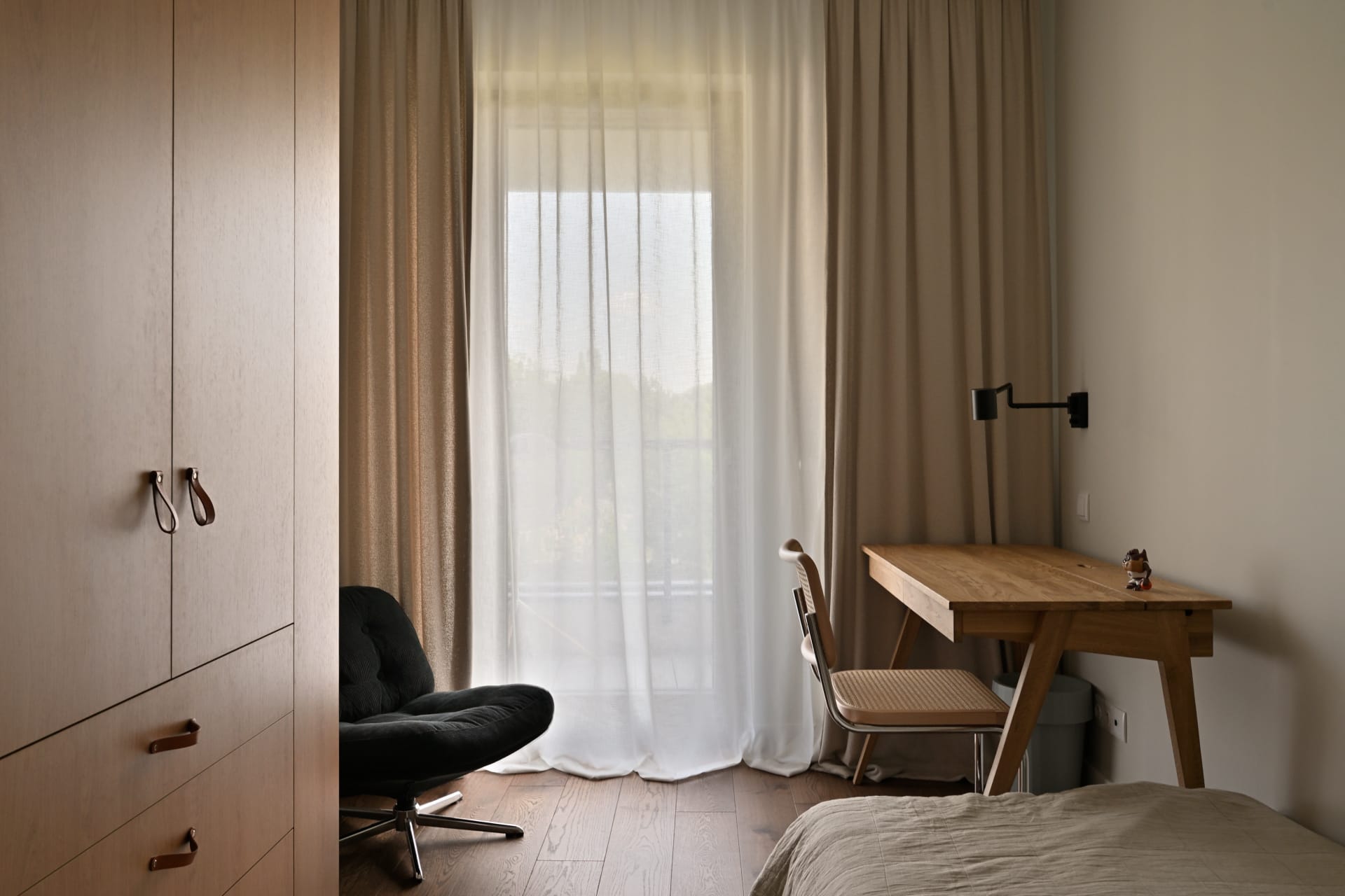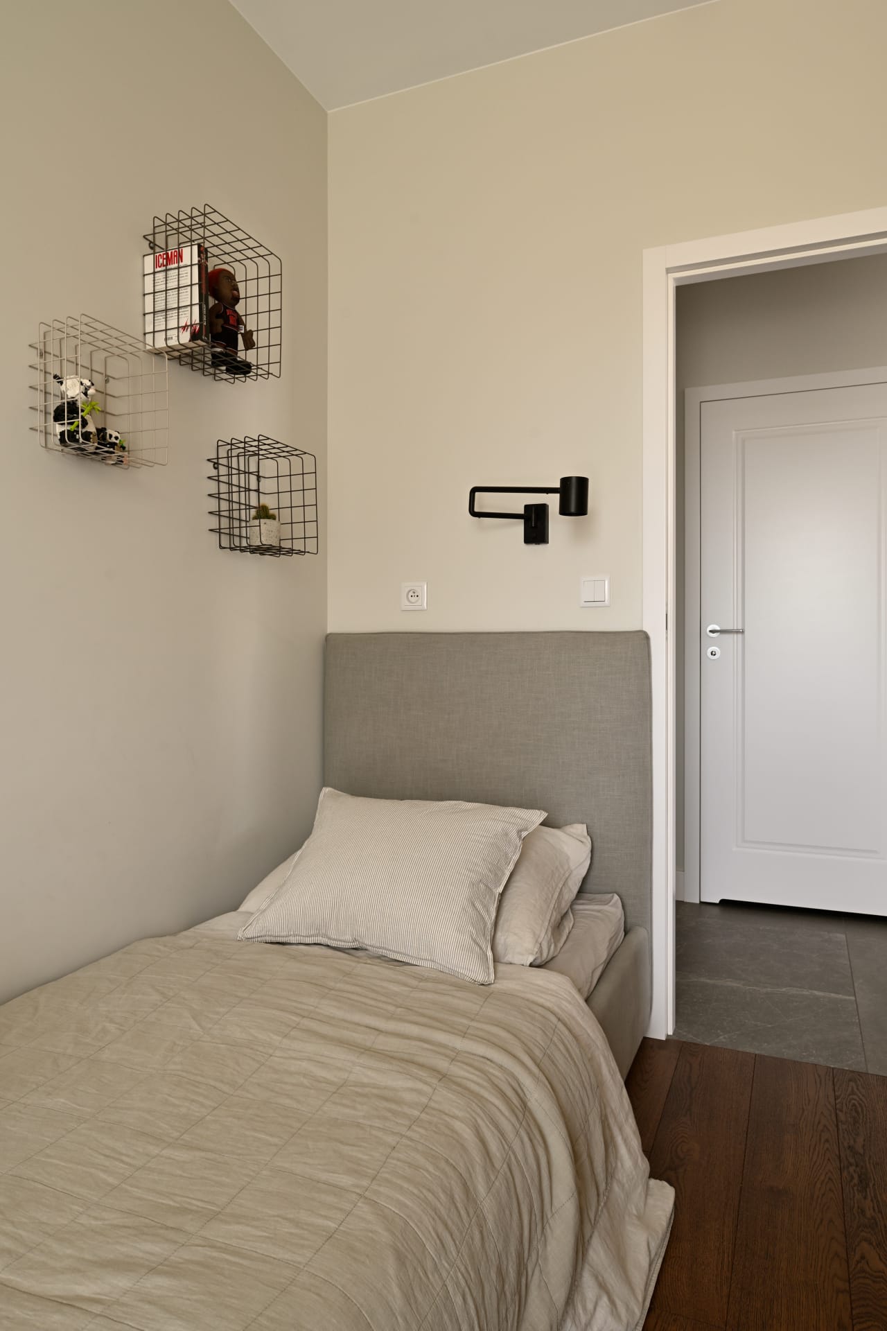 – Pokoje synów mają analogiczny do siebie układ i konsekwentnie minimalistyczny, spokojny nastrój – zaznacza Marta Czeczko-Skruczaj. Dzięki neutralnej i łatwej do modyfikacji stylistyce pokoje mogą zmieniać się wraz z potrzebami dorastających dzieci.
