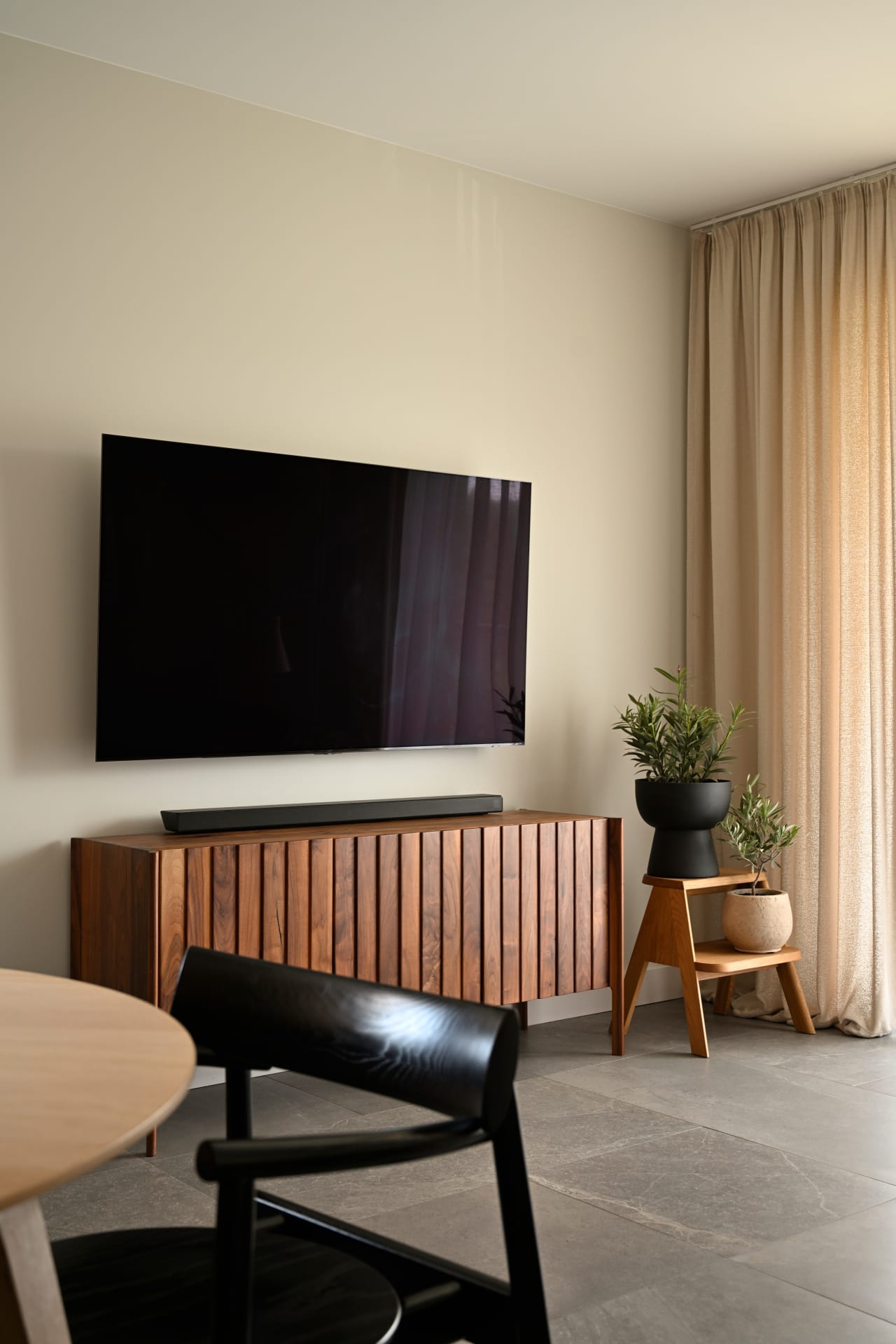 Układ mieszkania podporządkowany jest rytmowi codziennego życia czteroosobowej rodziny. Przestronny salon z aneksem kuchennym i jadalnią stanowi centrum domu, które uzupełnia strefa prywatna z sypialnią, dwiema łazienkami, garderobą i pokojami dzieci.