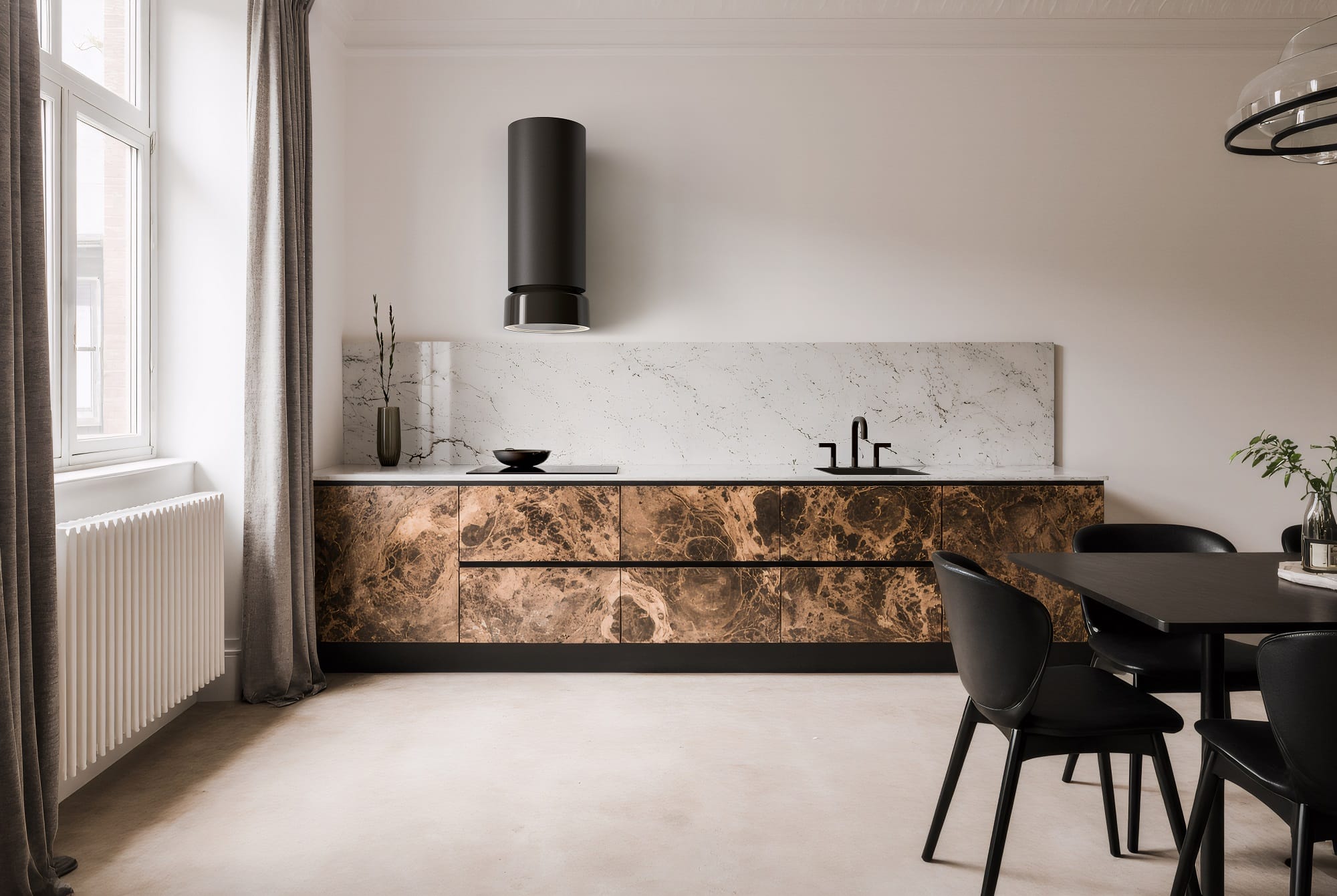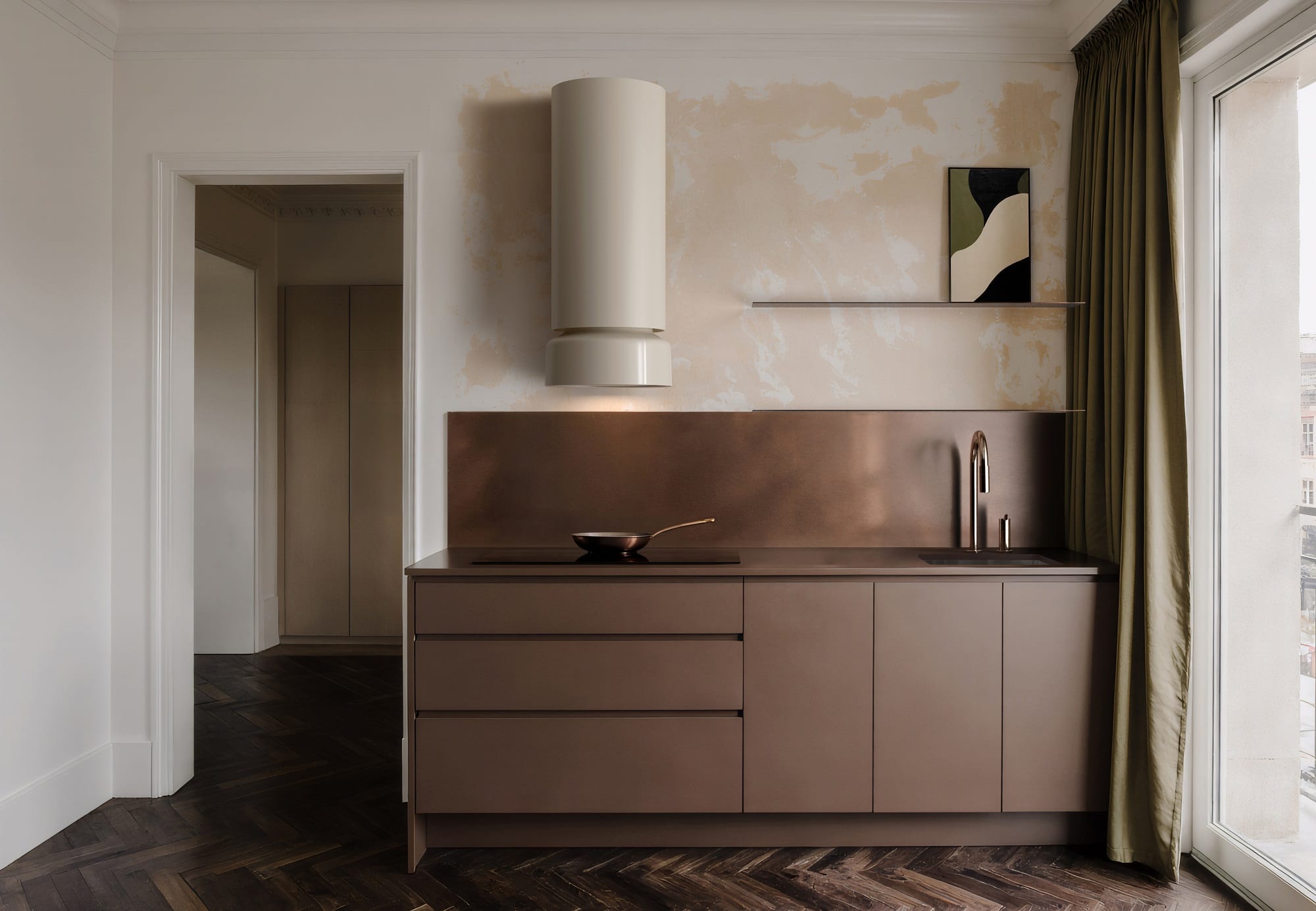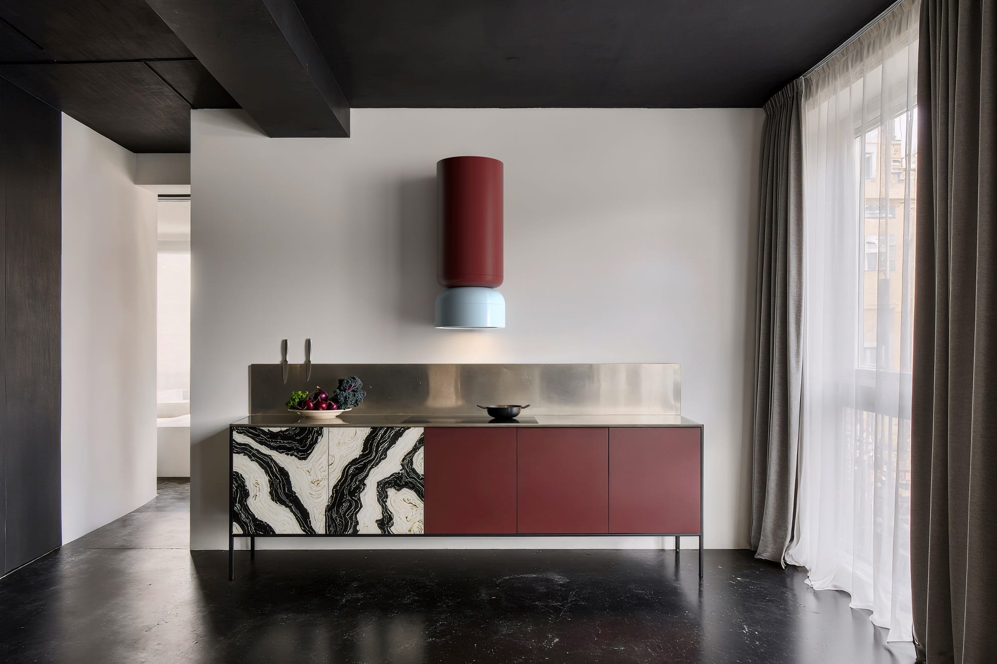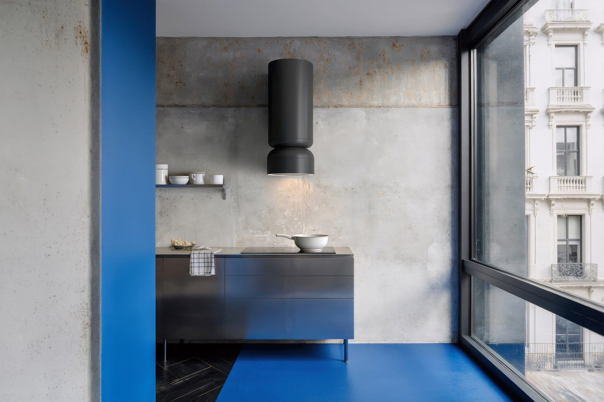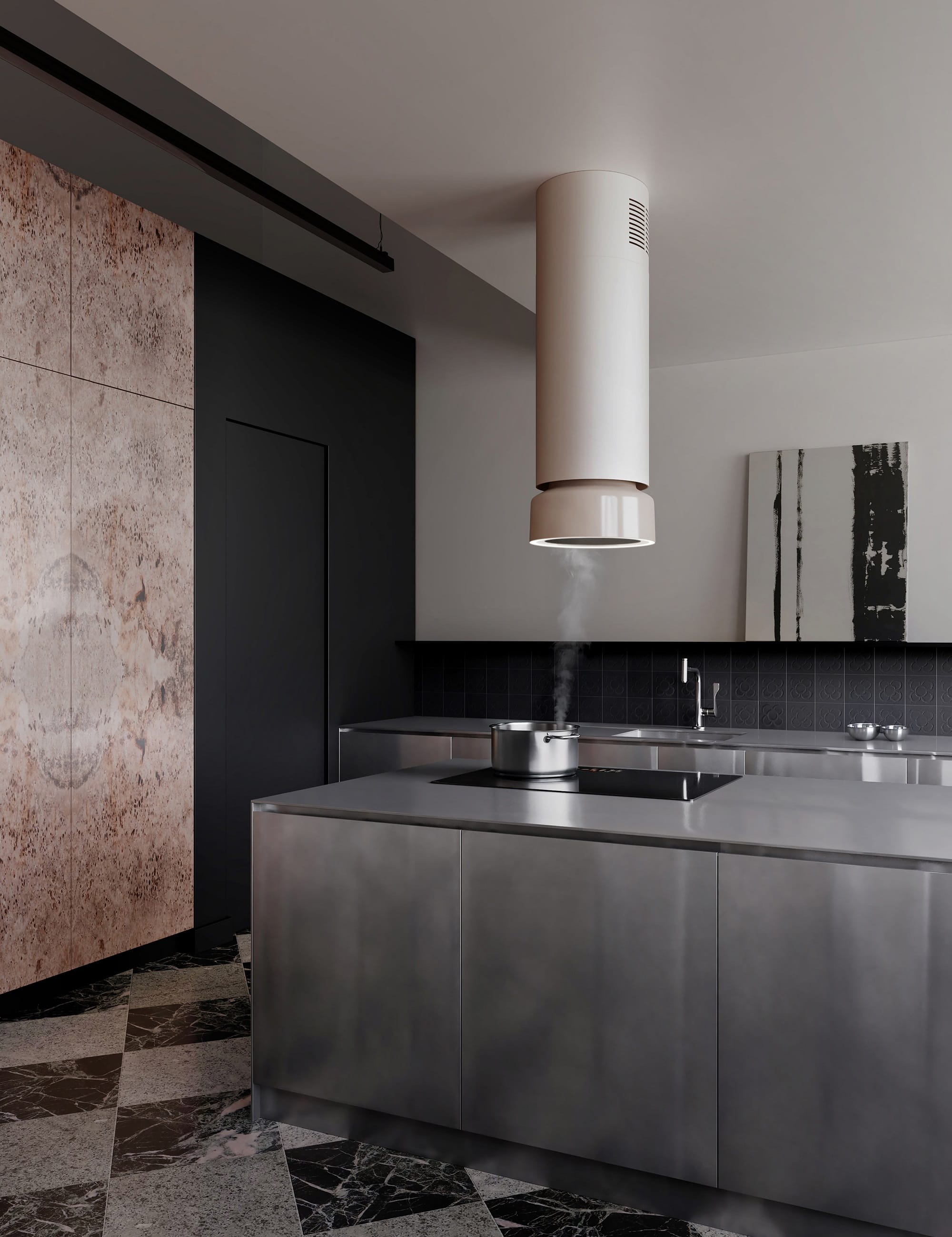 Ekspozycję podzielono na dwie narracje, wykorzystując ponownie moduły z poprzedniej edycji wydarzenia – jako wyraz odpowiedzialnego podejścia do projektowania. Jasna, kaszmirowa strefa eksponuje okapy w klimacie laboratoryjnej czystości i architektonicznej dyscypliny. Z kolei strefa burgundowa to głęboka, zmysłowa opowieść o mocy produktu i jego wpływie na atmosferę wnętrza.