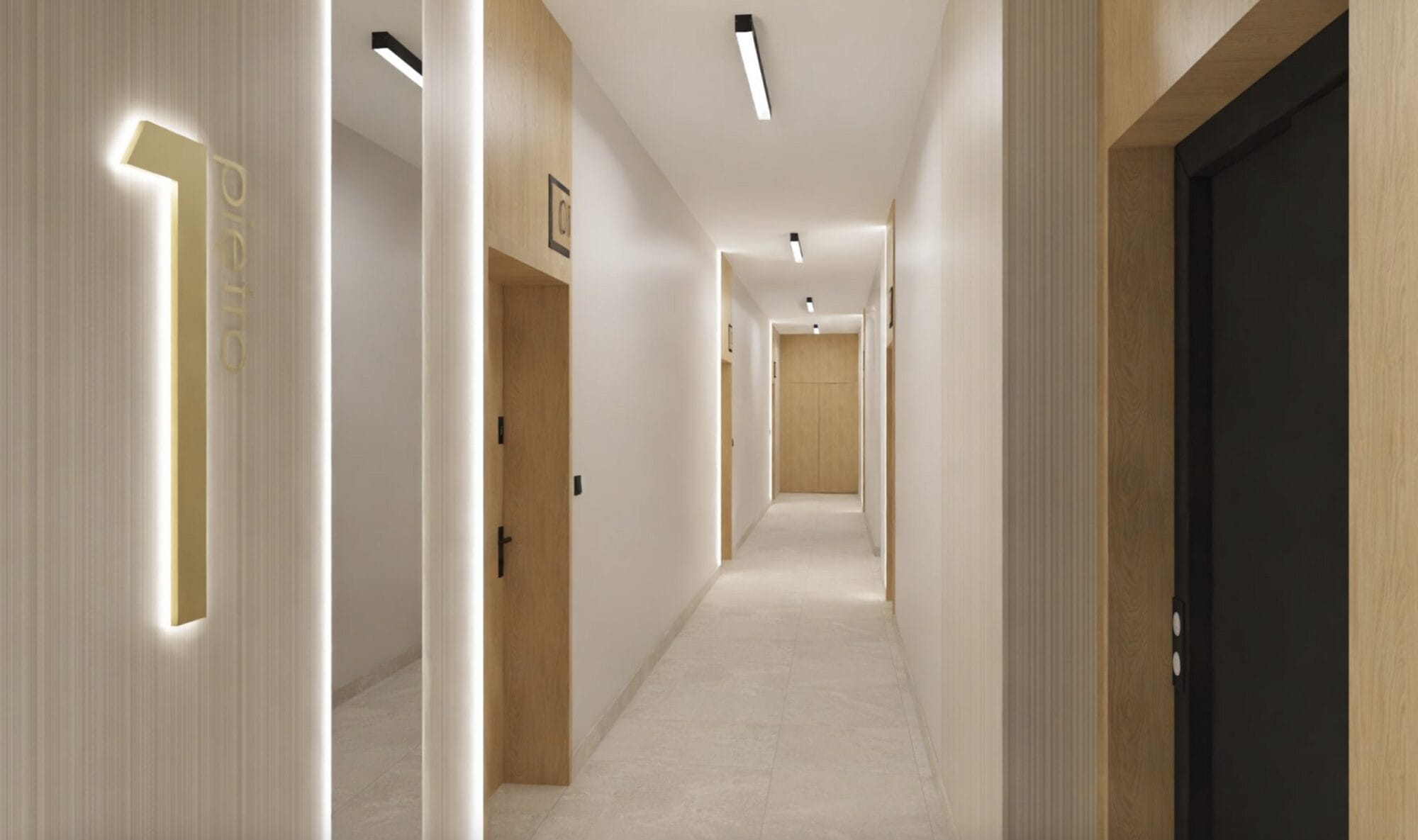 Każdy element mieszkań na Pogonowskiego 52 został przemyślany pod kątem trwałości i elegancji. W częściach wspólnych pojawią się zabudowy meblowe, designerskie tapety i efektowne lustra – materiały, które nadają wnętrzom prestiż, ale jednocześnie nie ulegają chwilowym modom.