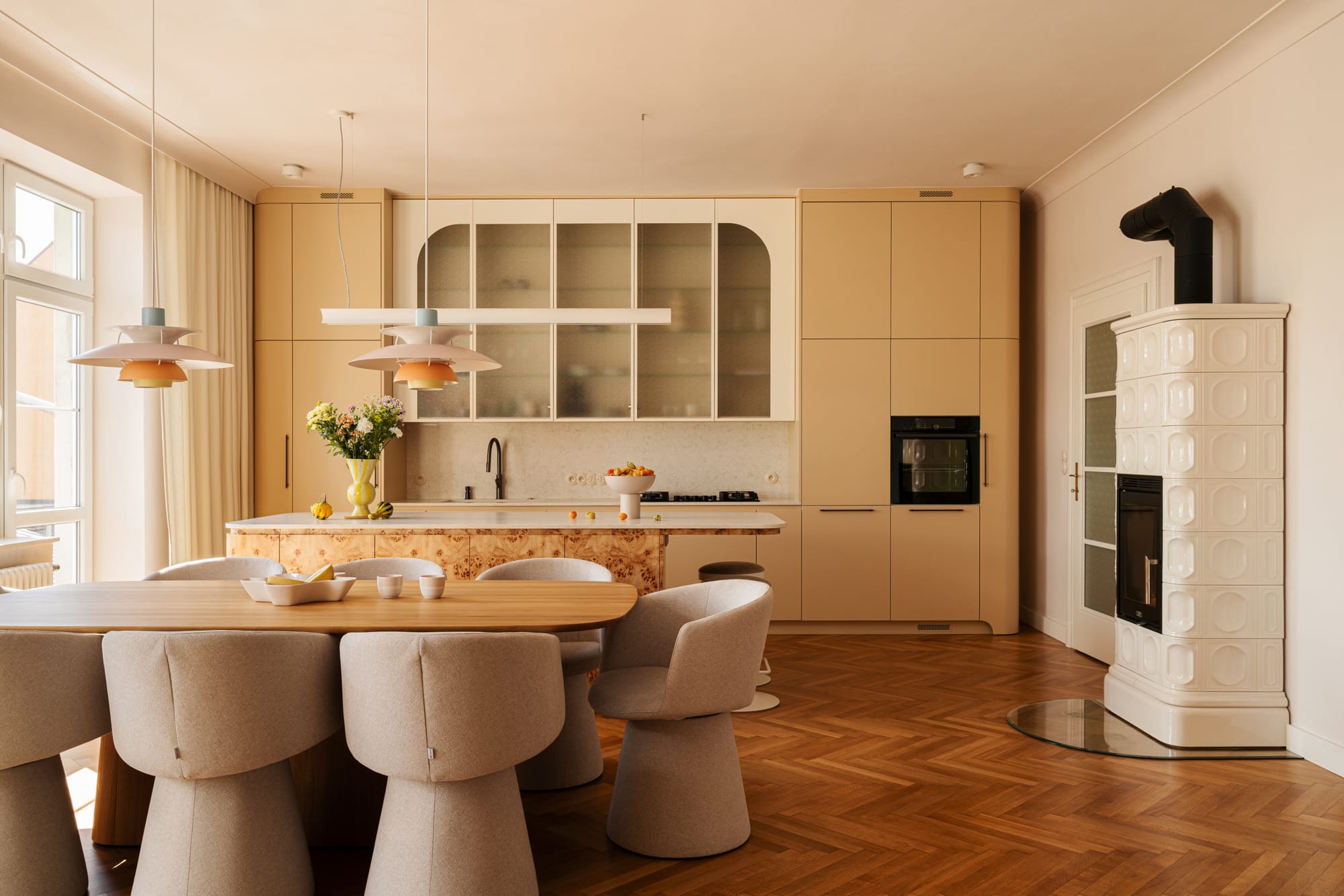 W zaproponowanej aranżacji dominują ciepłe, naturalne odcienie beżu, piasku i miodowego drewna, które podkreślają modernistyczny charakter kamienicy, a jednocześnie wprowadzają atmosferę domowego komfortu. Drewniana podłoga, ułożona w klasyczną jodełkę, nawiązuje do pierwotnego charakteru wnętrza. W zabudowach meblowych wykorzystano matowe wykończenia, które zestawiono z wyrazistym fornirem z czeczoty topoli, który spina poszczególne strefy w spójną kompozycję.