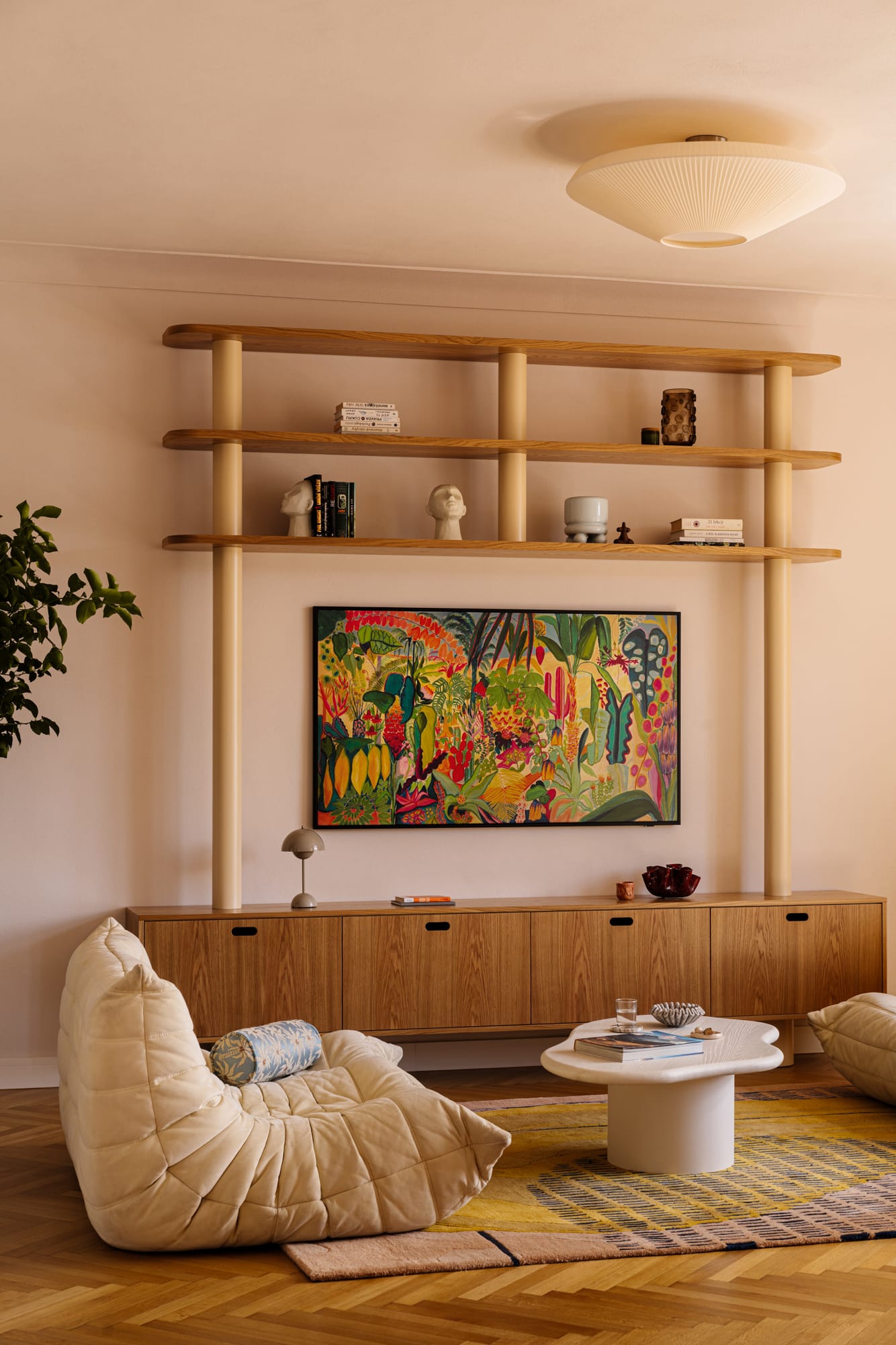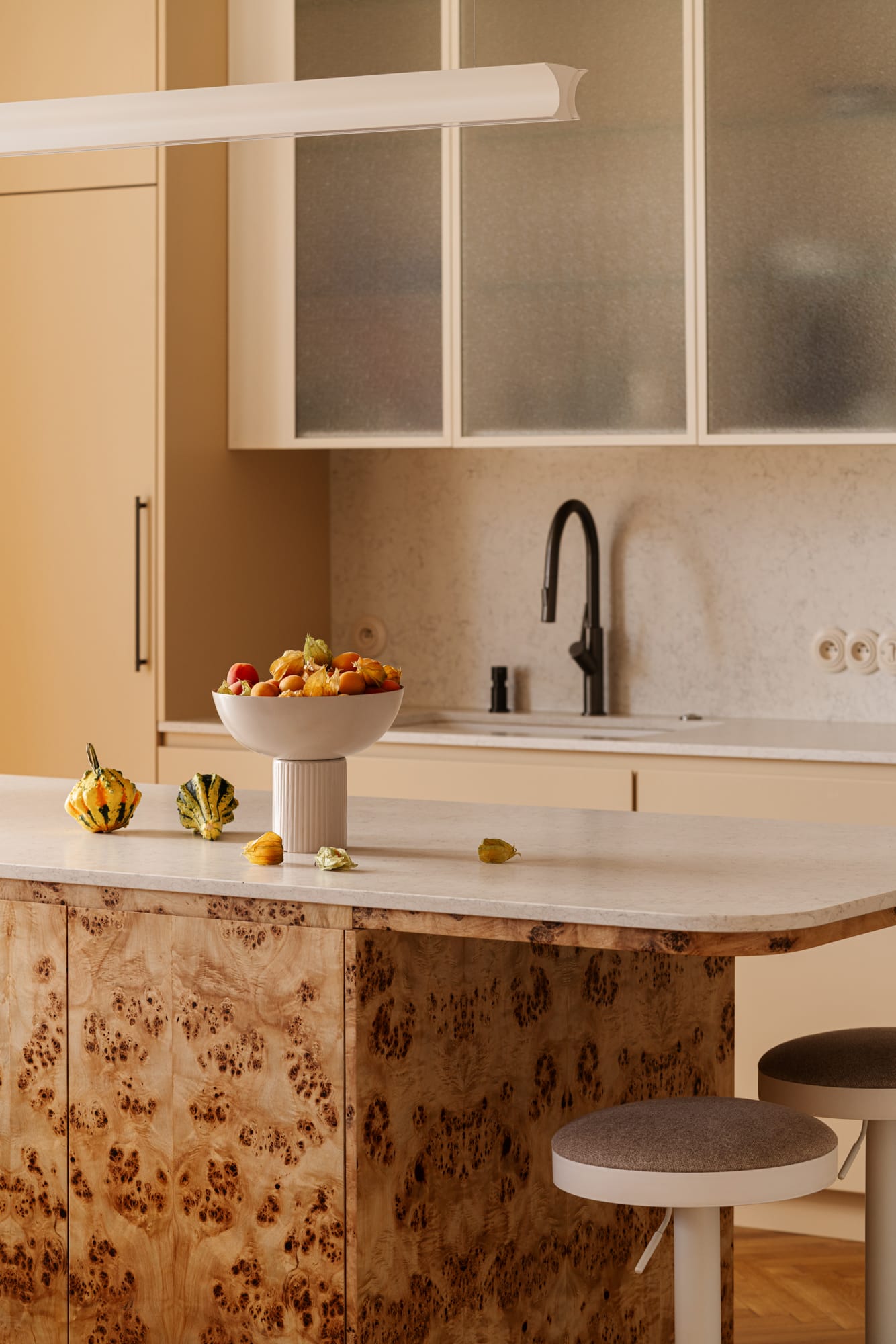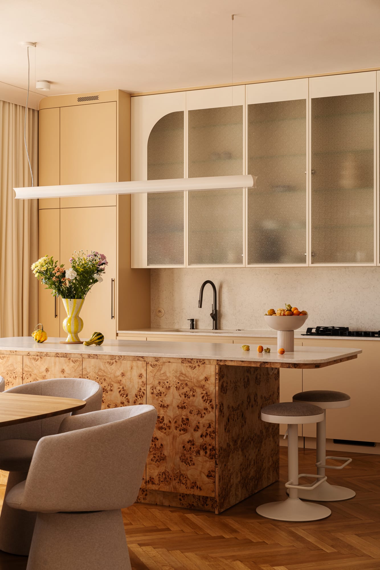 W zaproponowanej aranżacji dominują ciepłe, naturalne odcienie beżu, piasku i miodowego drewna, które podkreślają modernistyczny charakter kamienicy, a jednocześnie wprowadzają atmosferę domowego komfortu. Drewniana podłoga, ułożona w klasyczną jodełkę, nawiązuje do pierwotnego charakteru wnętrza. W zabudowach meblowych wykorzystano matowe wykończenia, które zestawiono z wyrazistym fornirem z czeczoty topoli, który spina poszczególne strefy w spójną kompozycję.