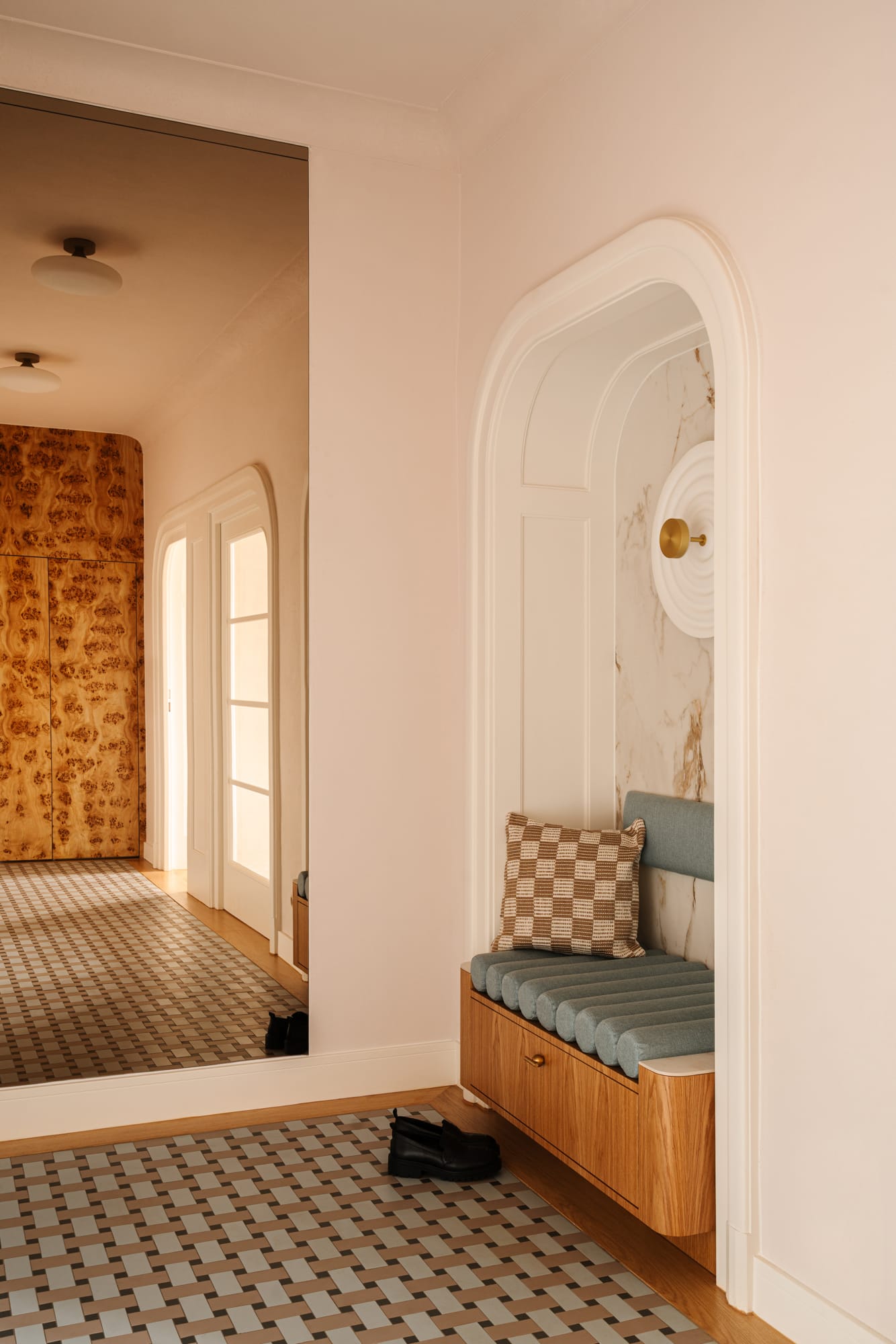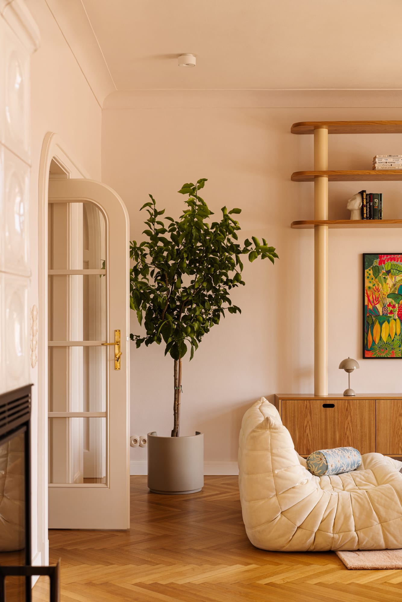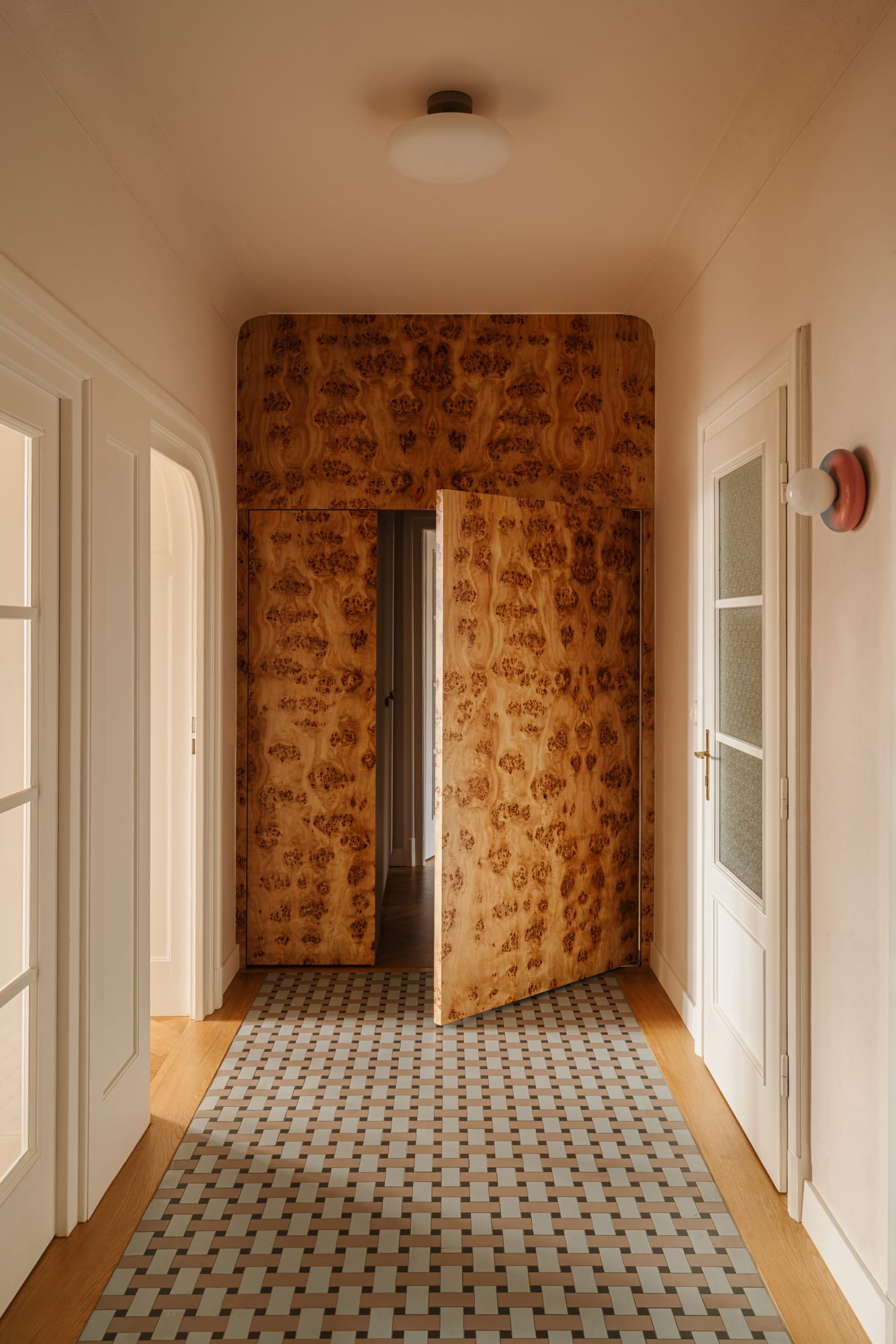 Mieszkanie znajduje się w modernistycznej kamienicy z nurtu czeskiego funkcjonalizmu. Już na wstępie uwagę architektów z pracowni Razoo przyciągnęło wyjątkowe światło oraz zachowane detale architektoniczne: subtelne gzymsy, oryginalna stolarka okienna i drzwiowa, a także drewniany parkiet. – Od początku wiedzieliśmy, że te elementy powinny pozostać integralną częścią projektu – nie tylko zachowane, ale wręcz podkreślone – mówią architekci. Równie ważne było stworzenie komfortowego miejsca do życia, odpowiadającego współczesnym potrzebom mieszkańców.