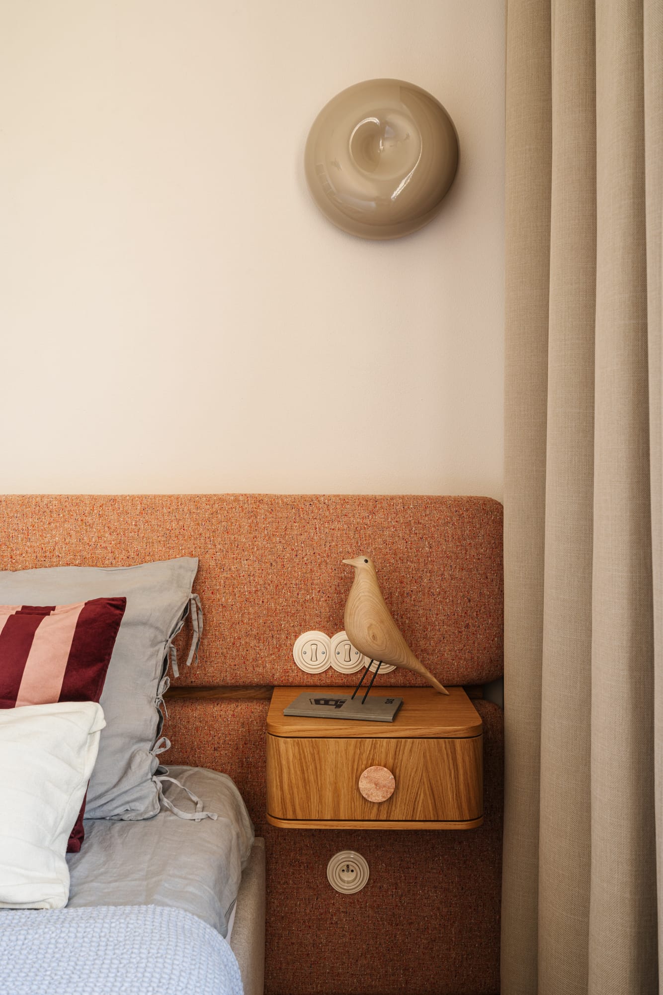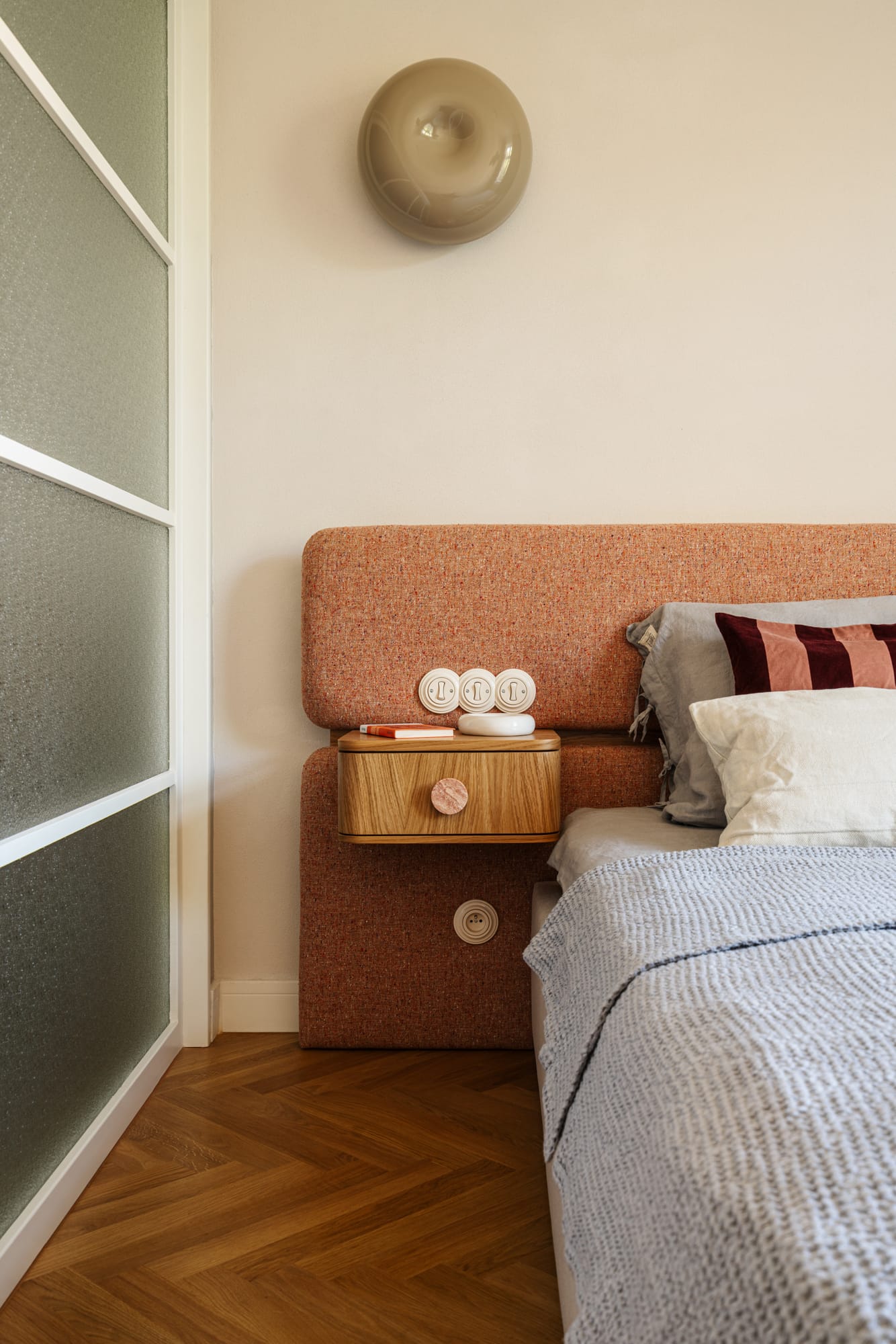 W sypialni jakość wypoczynku zapewnia zagłówek obity tkaniną Dekoma, a nocne szafki uzupełniono o marmurowe uchwyty od Marmurowej Pracowni. W przedpokoju zainstalowano kinkiety polskiej marki Nodi. W całym mieszkaniu pojawiają się również gniazdka i włączniki czeskiej marki Kliklap.
