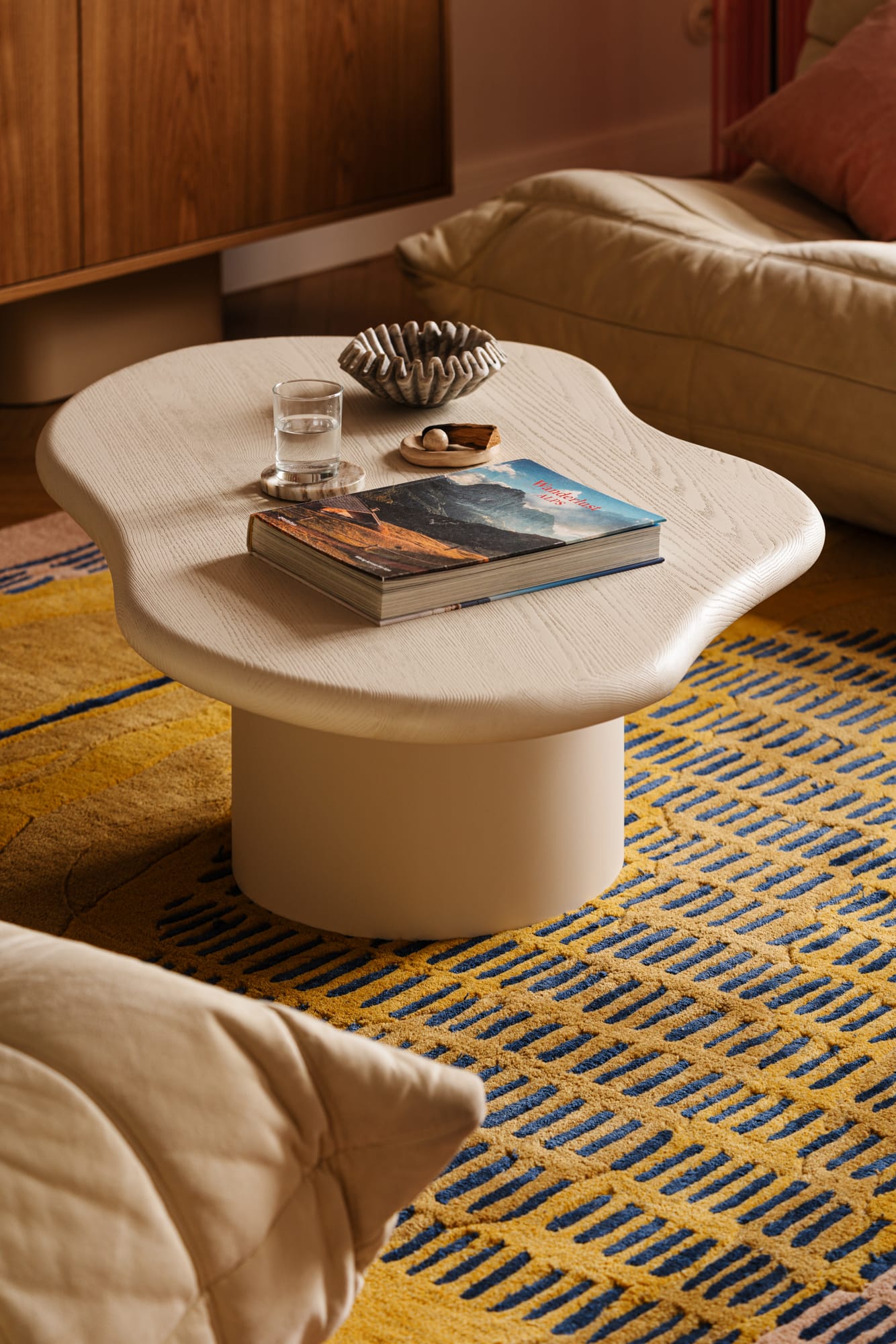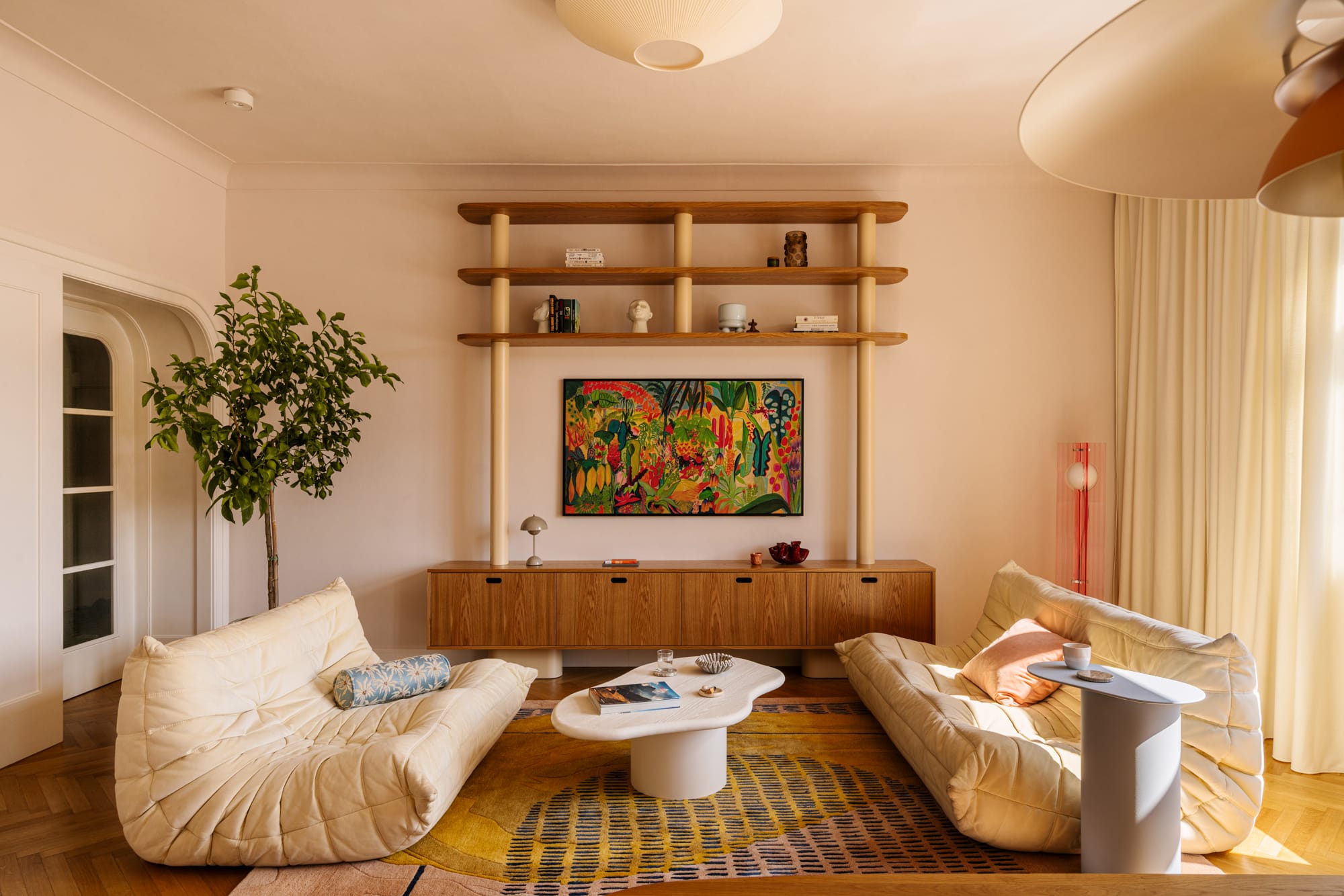 W strefie dziennej ustawiono sofy Togo marki Ligne Roset o organicznych formach, których dopełnieniem jest dywan Rugvista. Wnętrze oświetlają lampy wiszące Louis Poulsen umieszczone nad stołem jadalnianym marki Ton, przy którym stanęły krzesła IWC Home.