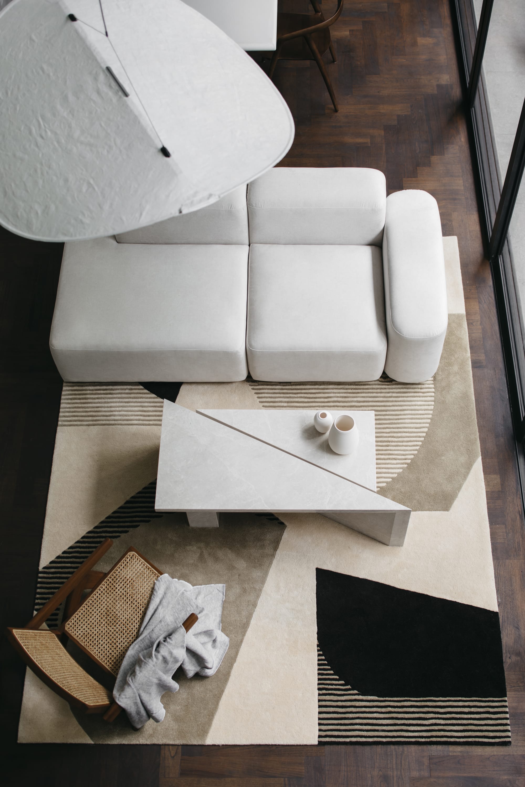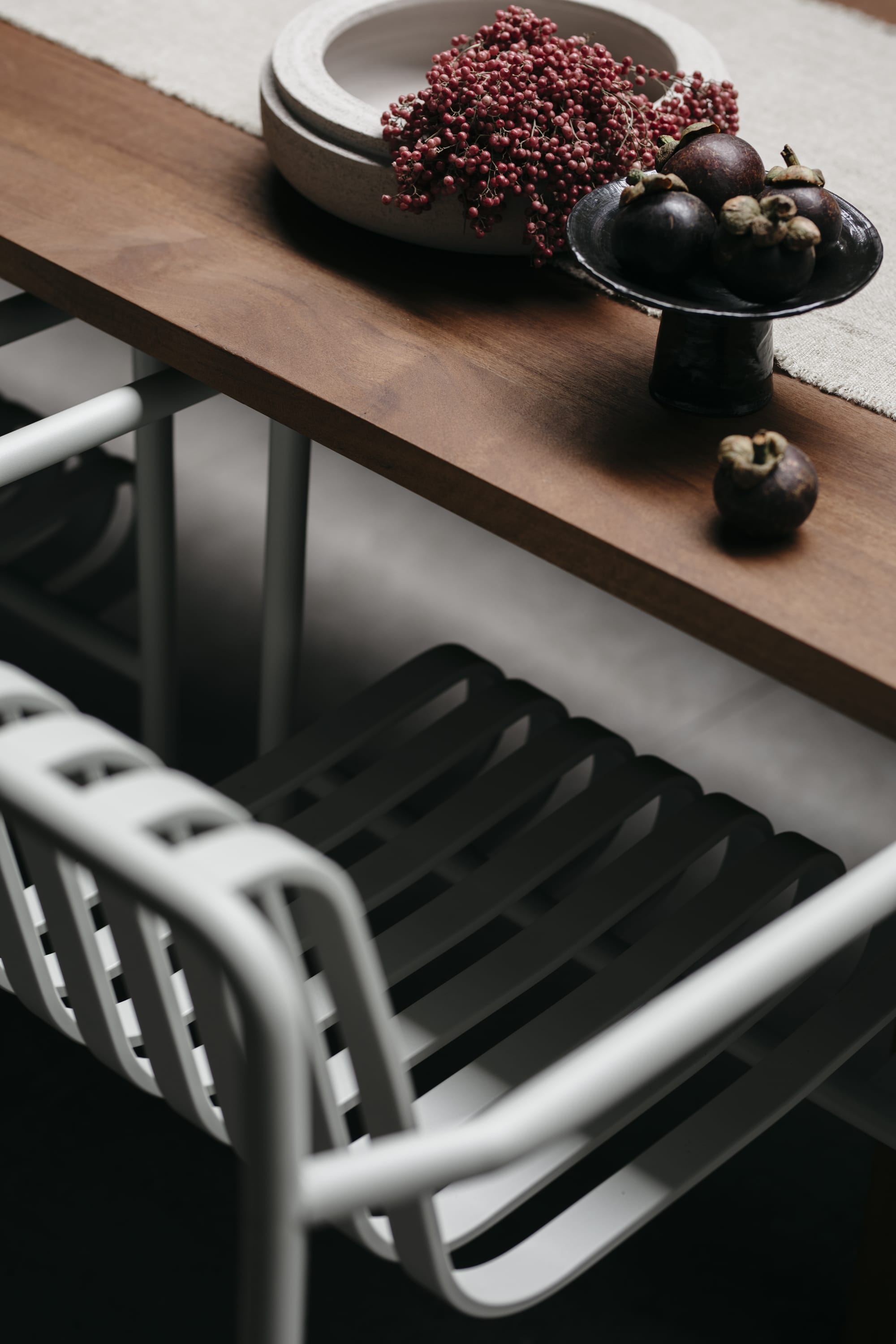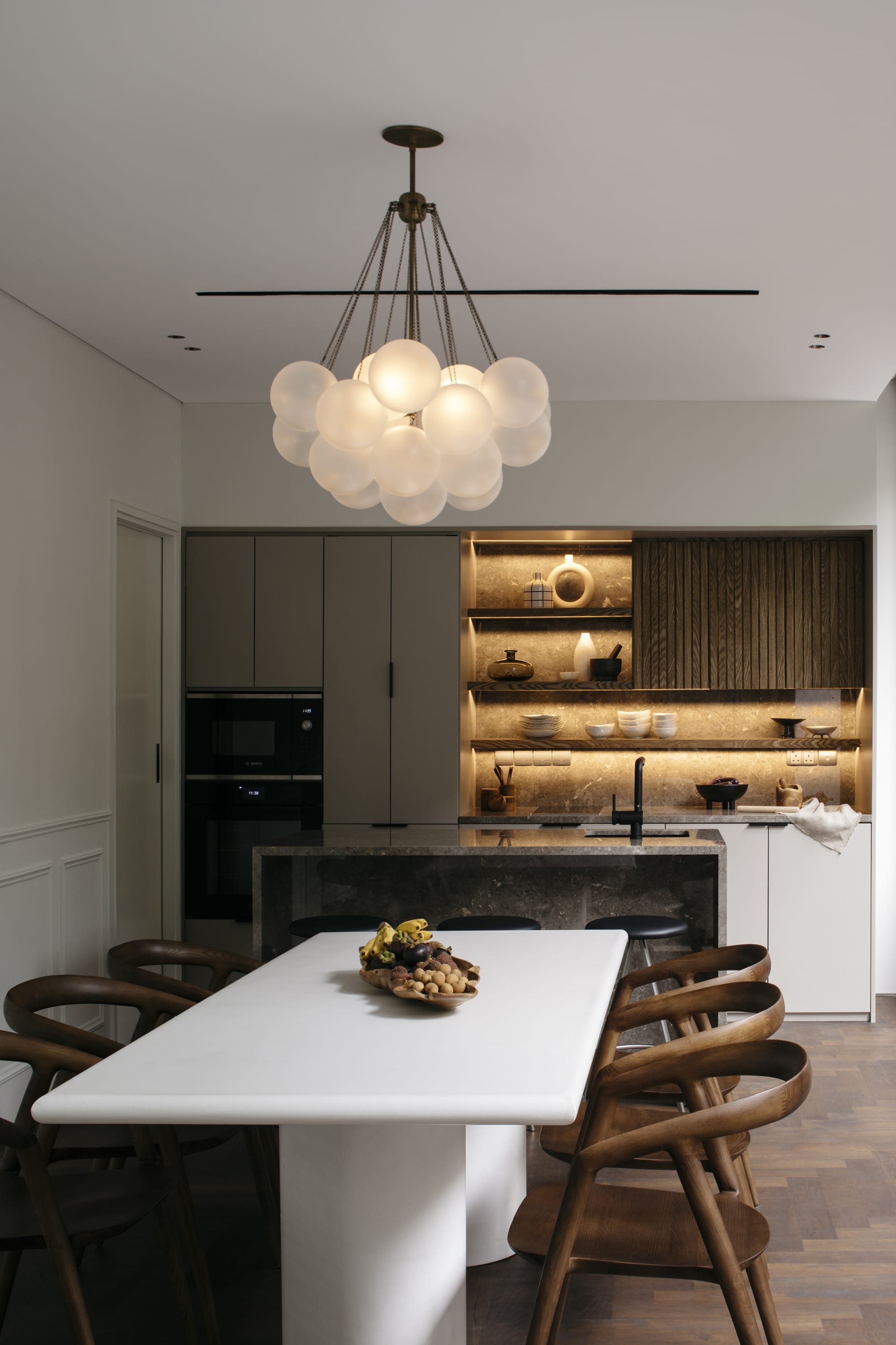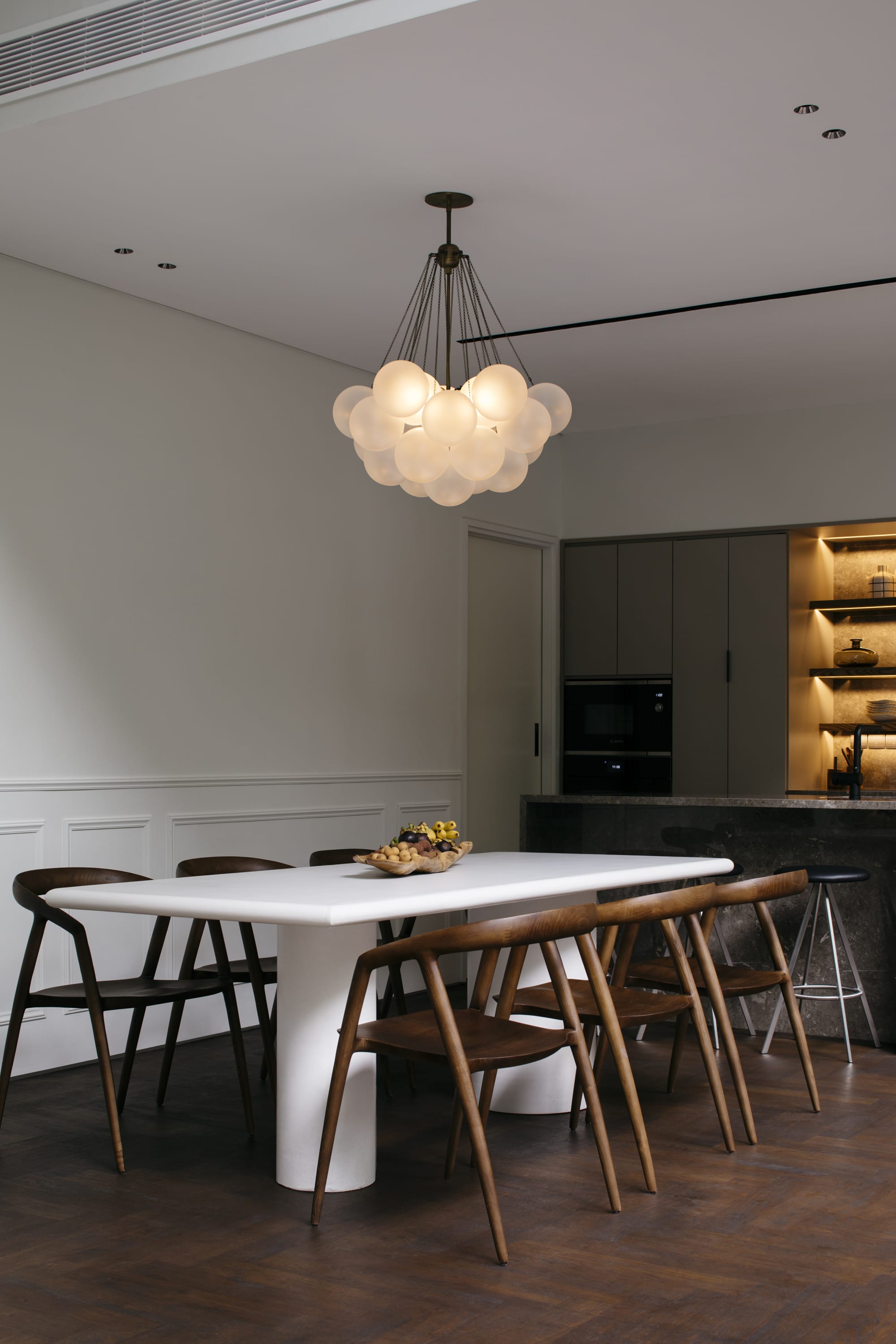 Masywny, wykonany na zamówienie stół jadalniany z betonu wzmacnianego włóknem szklanym zestawiono z eteryczną lampą wiszącą Cloud 19 marki Apparatus. Kanciaste formy stolików kawowych z marmuru spider kontrastują z miękką sylwetką fotela Chandigarh Easy Chair Pierre’a Jeannereta oraz kompaktową sofą w strefie dziennej. Na zewnątrz tę samą filozofię kontynuuje stół ogrodowy z drewna balau.