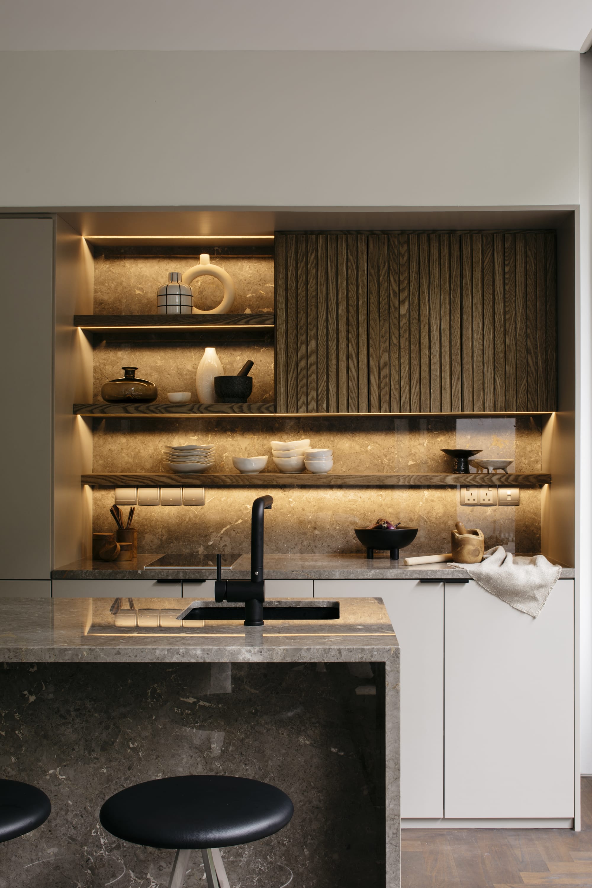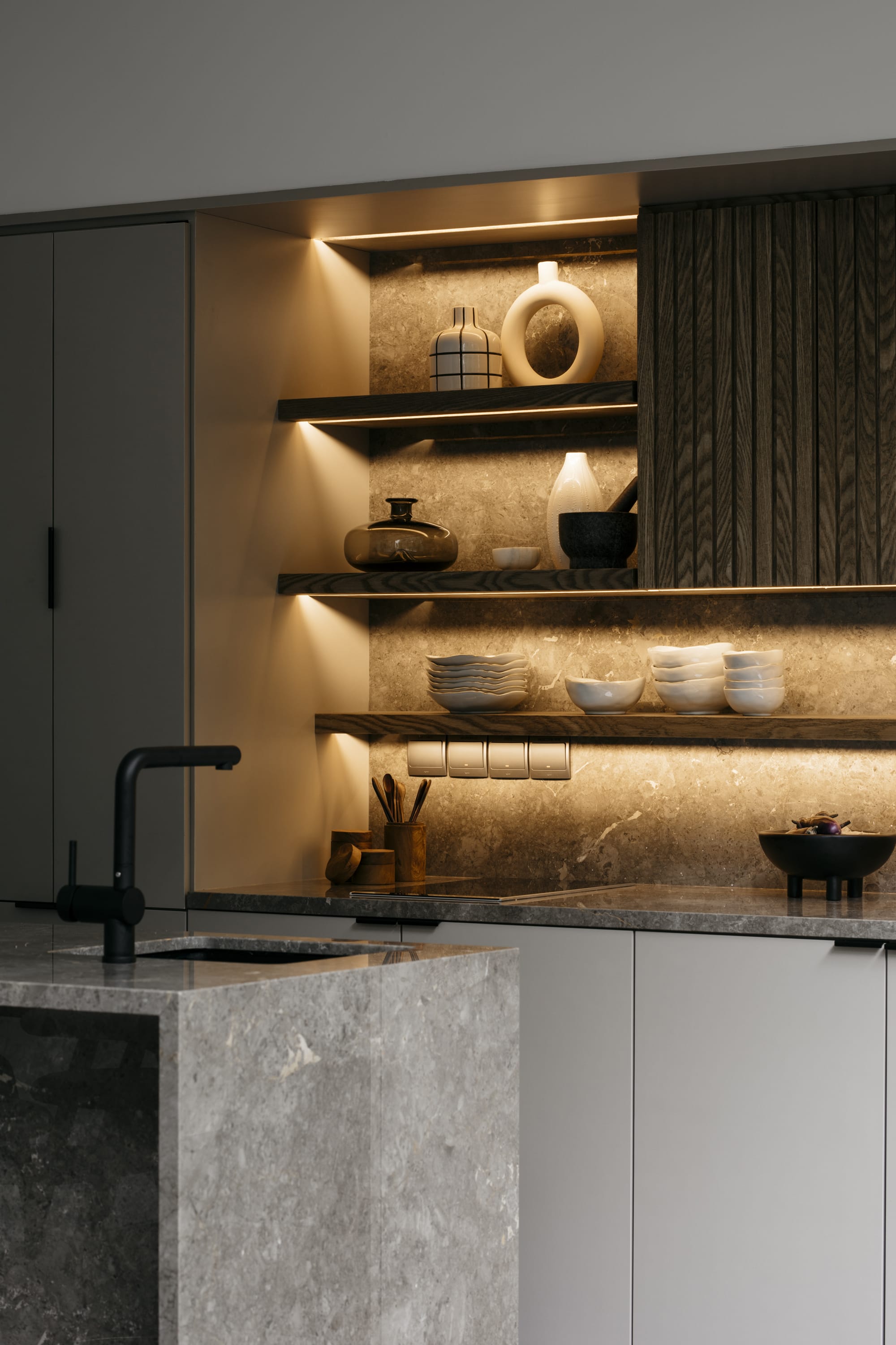 Jako podstawę aranżacji architekci z Pupil Office zaproponowali oszczędną, stonowaną paletę barw zestawioną z naturalnymi materiałami. Kluczową rolę odgrywa birmański teak na podłogach, fornir jesionowy w zabudowie kuchennej i szafach, a także kamień naturalny, beton oraz drewno balau zastosowane w strefie zewnętrznej. Drewniane powierzchnie wykończono produktami Rubio Monocoat. Olej Oil Plus 2C użyty na podłogach z teaku podkreśla naturalny rysunek słojów i głębię koloru, natomiast w kuchni oraz zabudowach z forniru jesionowego pojawia się cieplejszy odcień Castle Brown.