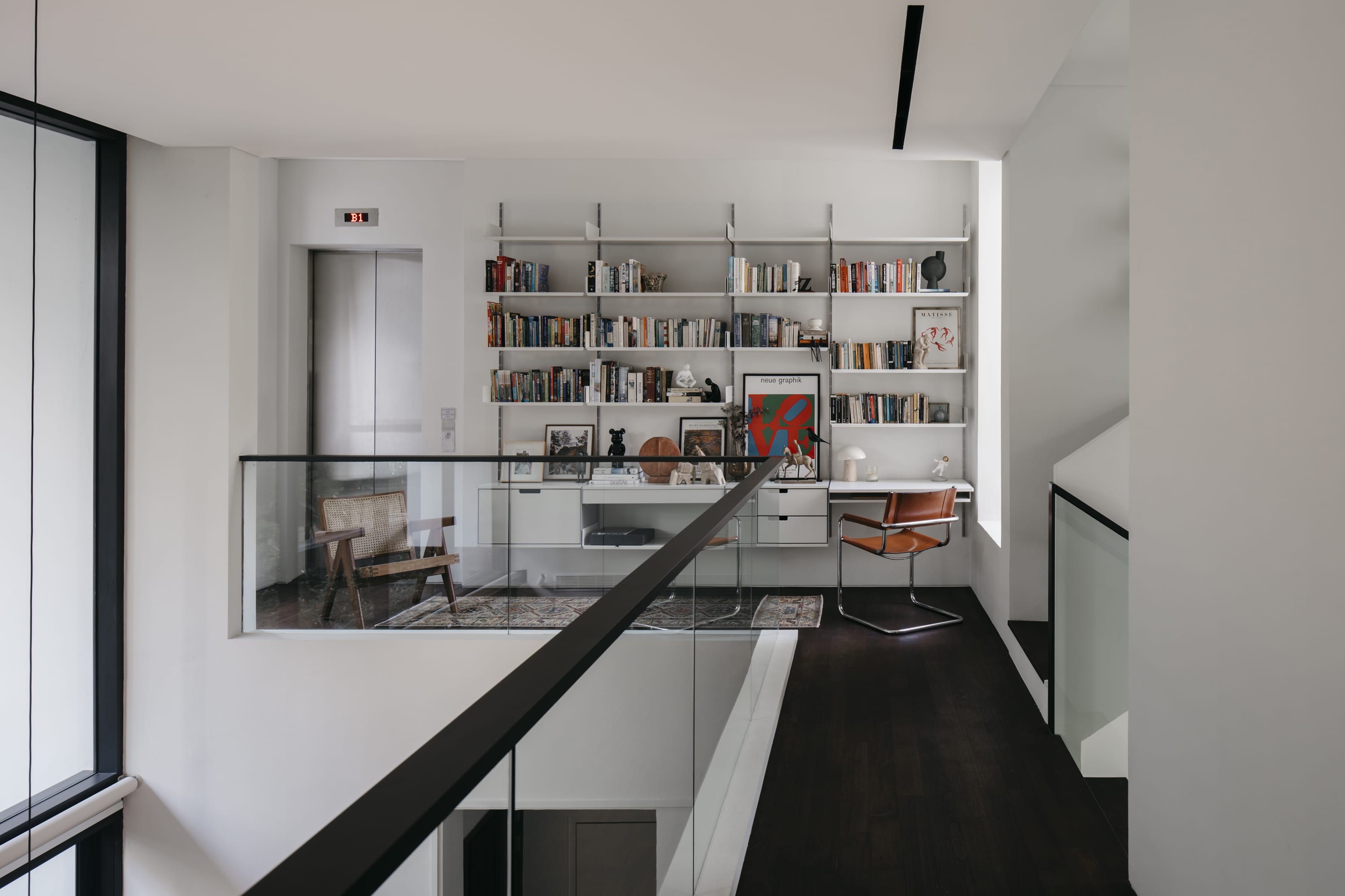 Drugie piętro, z biblioteką i gabinetem, zostało celowo włączone w tę kompozycję. Otwarcie na salon poniżej pozwala zachować wizualny i akustyczny kontakt między kondygnacjami. Układ mebli – zarówno we wnętrzu, jak i na patio – sprzyja rozmowie i współobecności, niezależnie od tego, w której części domu znajdują się domownicy.