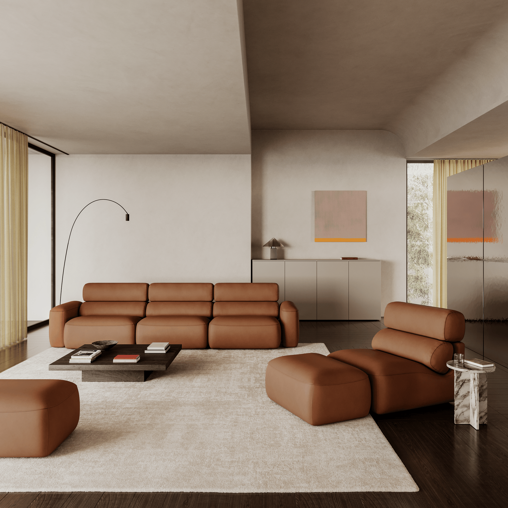 Do wyboru jest ponad 20 modułów – od foteli i puf po szezlongi i kompaktowe sofy – a wszystkie elementy można dowolnie konfigurować. Regulowane poduszki lędźwiowe i zagłówki można ustawiać między pozycją wyprostowaną a odchyloną. Sprężyny kieszeniowe minimalizują punkty nacisku, oferując elastyczne i równomierne podparcie, a pianka o wysokiej gęstości gwarantuje trwałość konstrukcji i miękkość, zachowując kształt i wygodę na lata.
