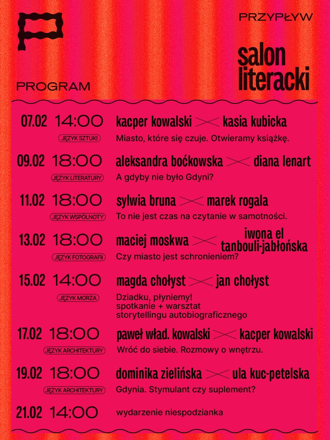 Kontynuacją premiery będzie Salon Literacki, organizowany w dniach 7–21 lutego w galerii Przypływ. Na dwa tygodnie galeria zamieni się w tzw. trzecie miejsce – otwartą, czynną codziennie przestrzeń sprzyjającą nieformalnym interakcjom.