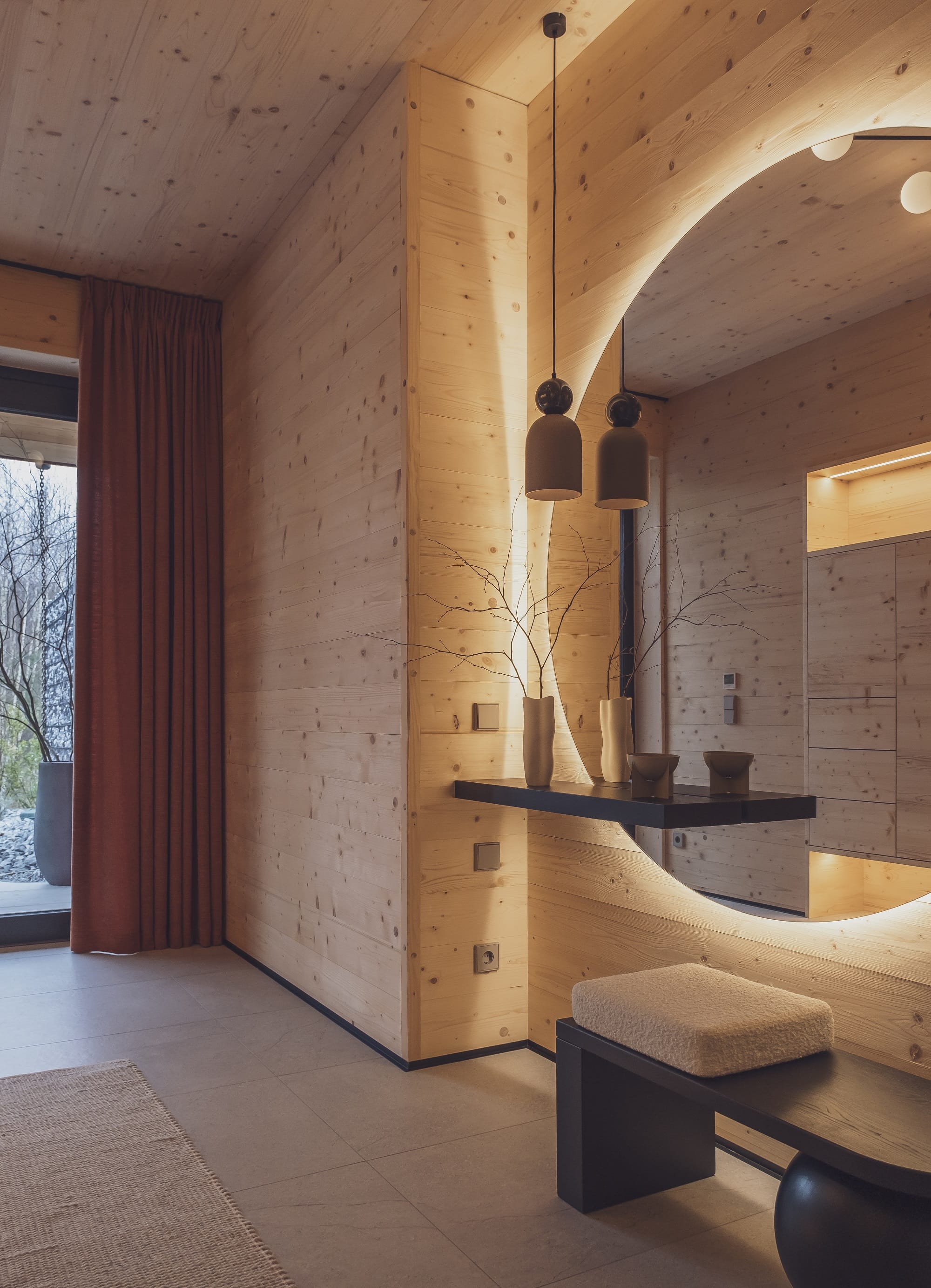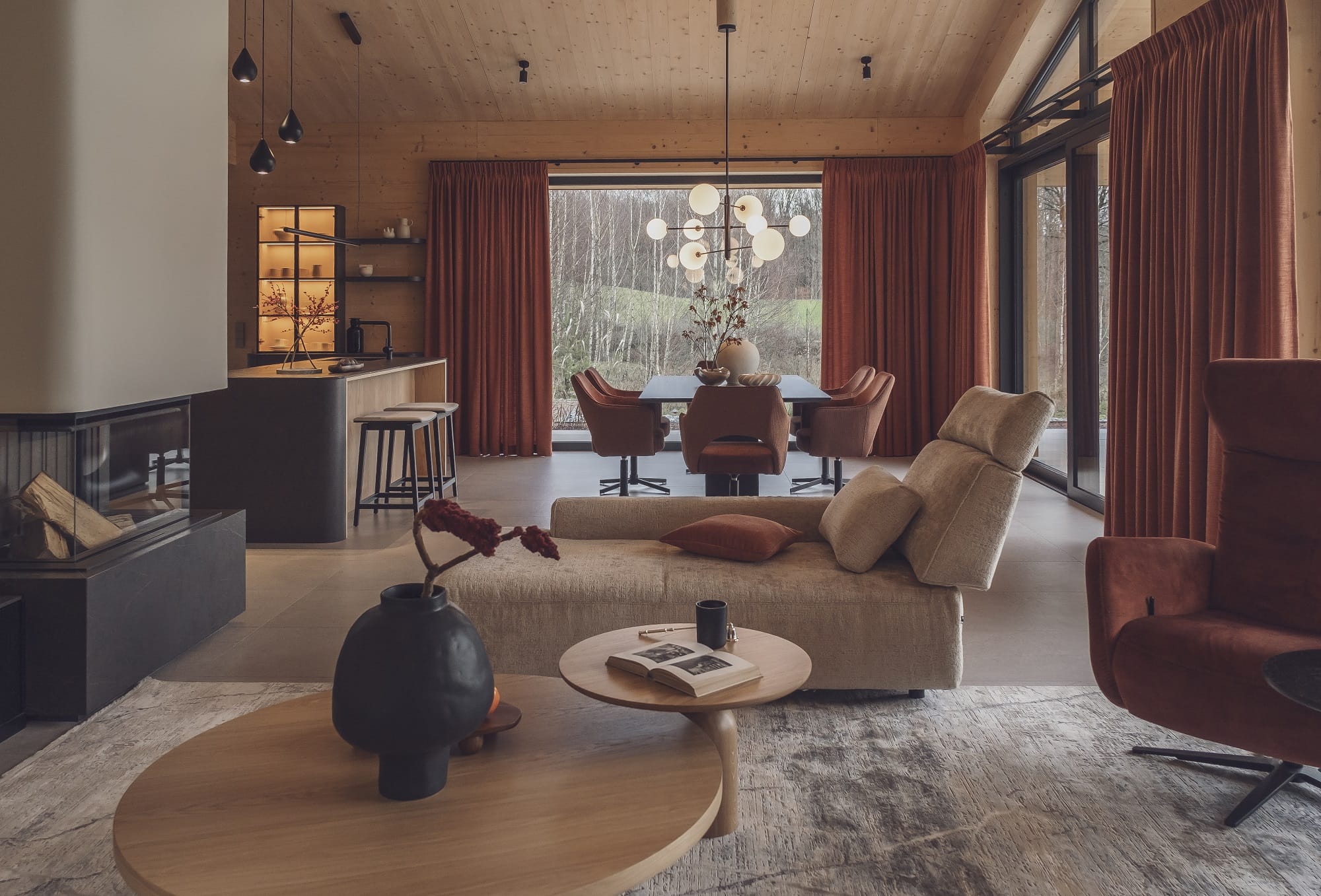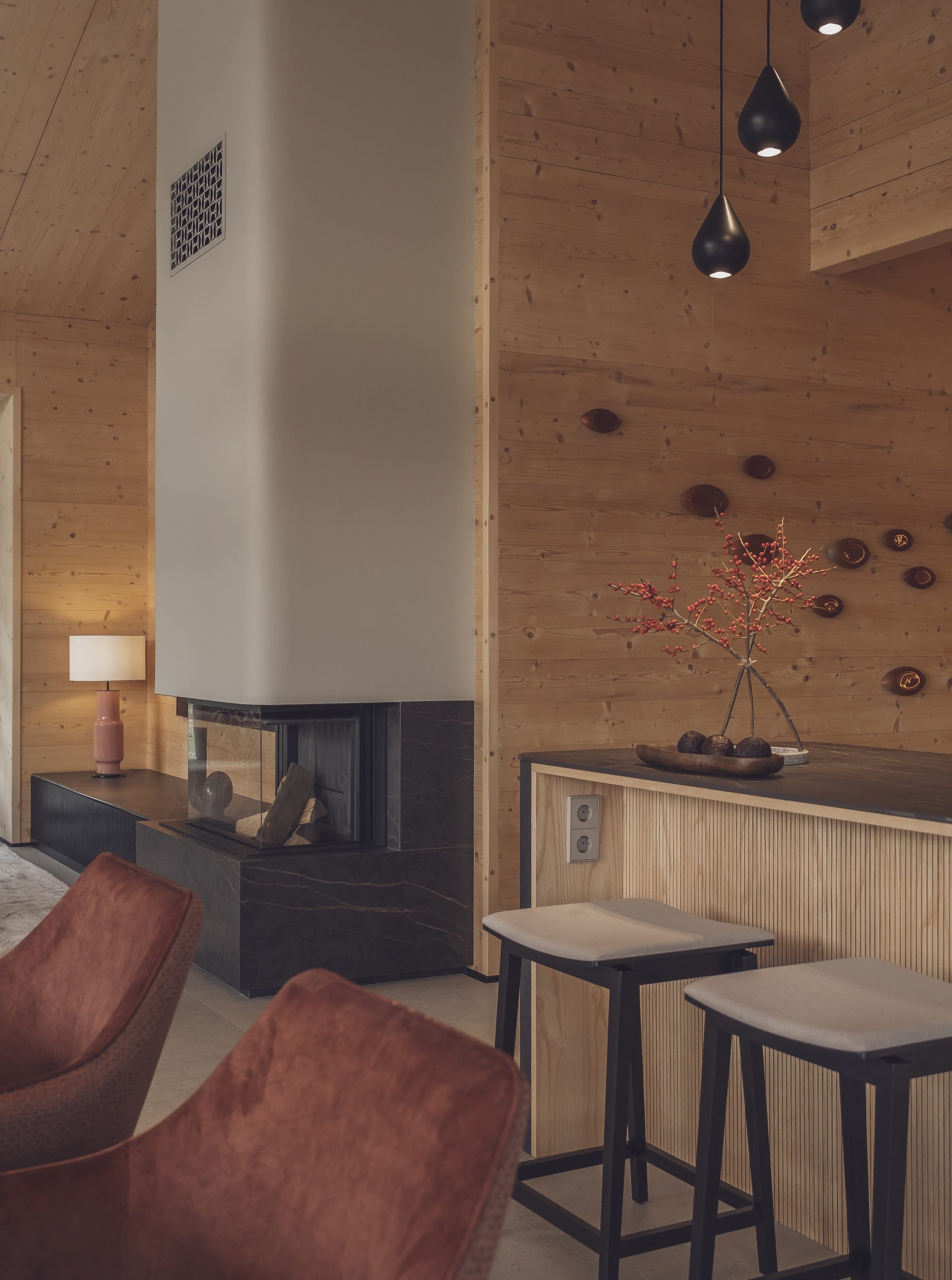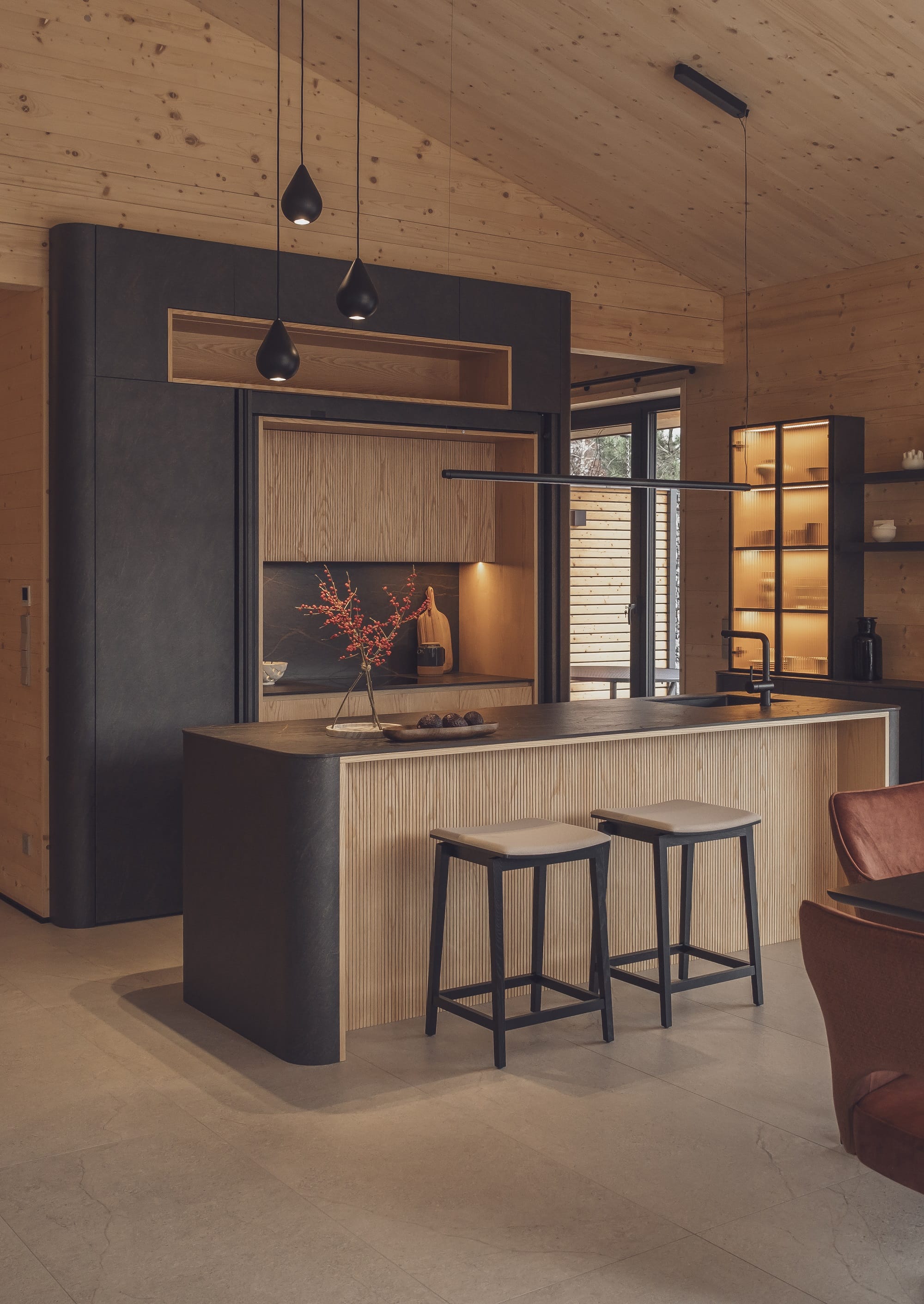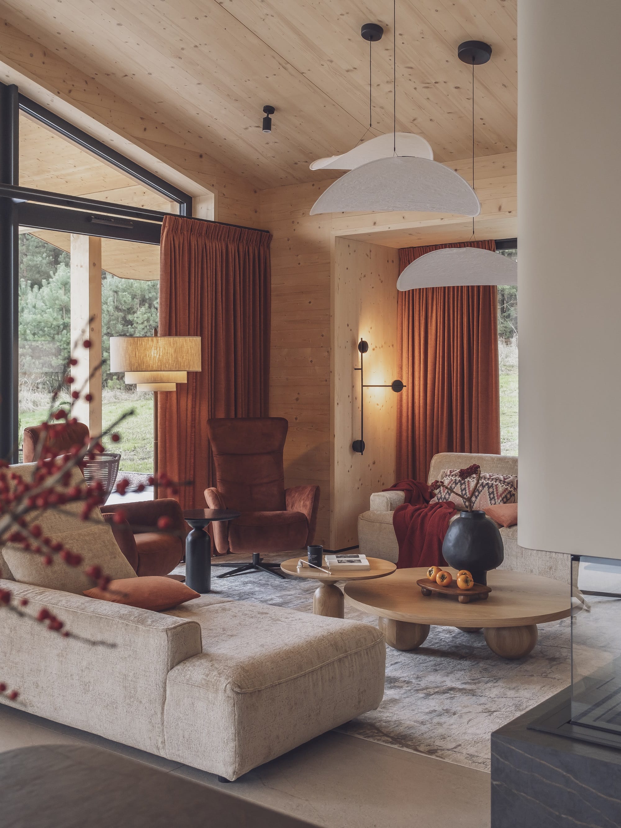 Wizualny charakter wnętrz w dużej mierze zdeterminowała lokalizacja domu na skraju lasu. Duże przeszklenia otwierają budynek na przyrodę, a światło odgrywa kluczową rolę. – Oświetlenie potraktowaliśmy jak narzędzie do budowania nastroju i podkreślania struktury drewna. Zaprojektowaliśmy różne typy światła, od ogólnego po dekoracyjne i nastrojowe. Dzięki temu wnętrze zmienia się w ciągu dnia, a drewno zyskuje głębię i autentyczność – dodaje Monika Jankowiak.