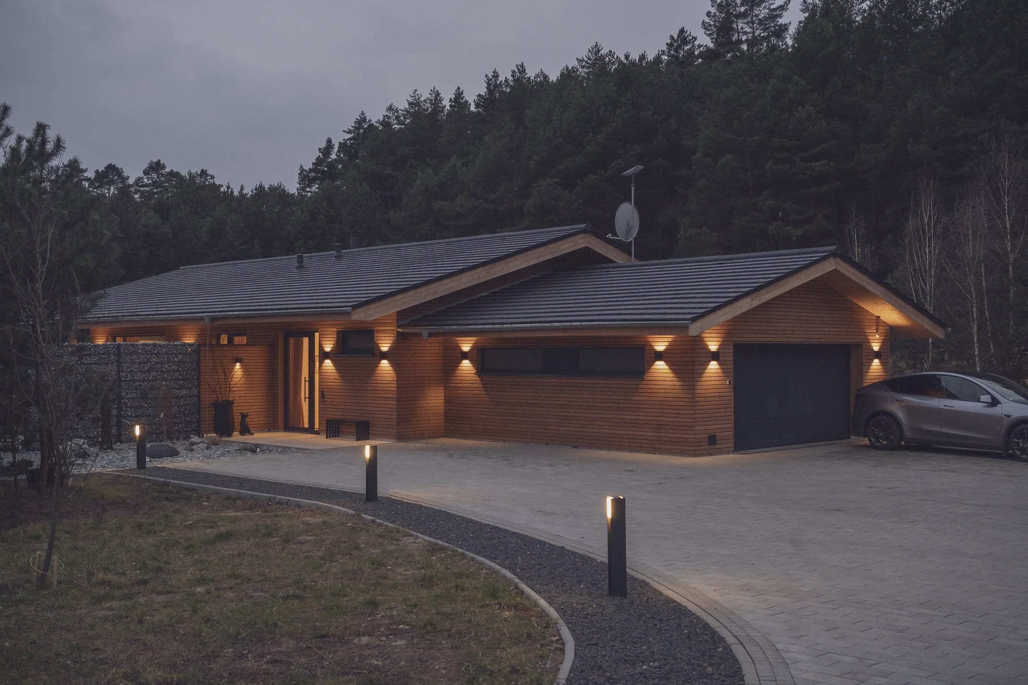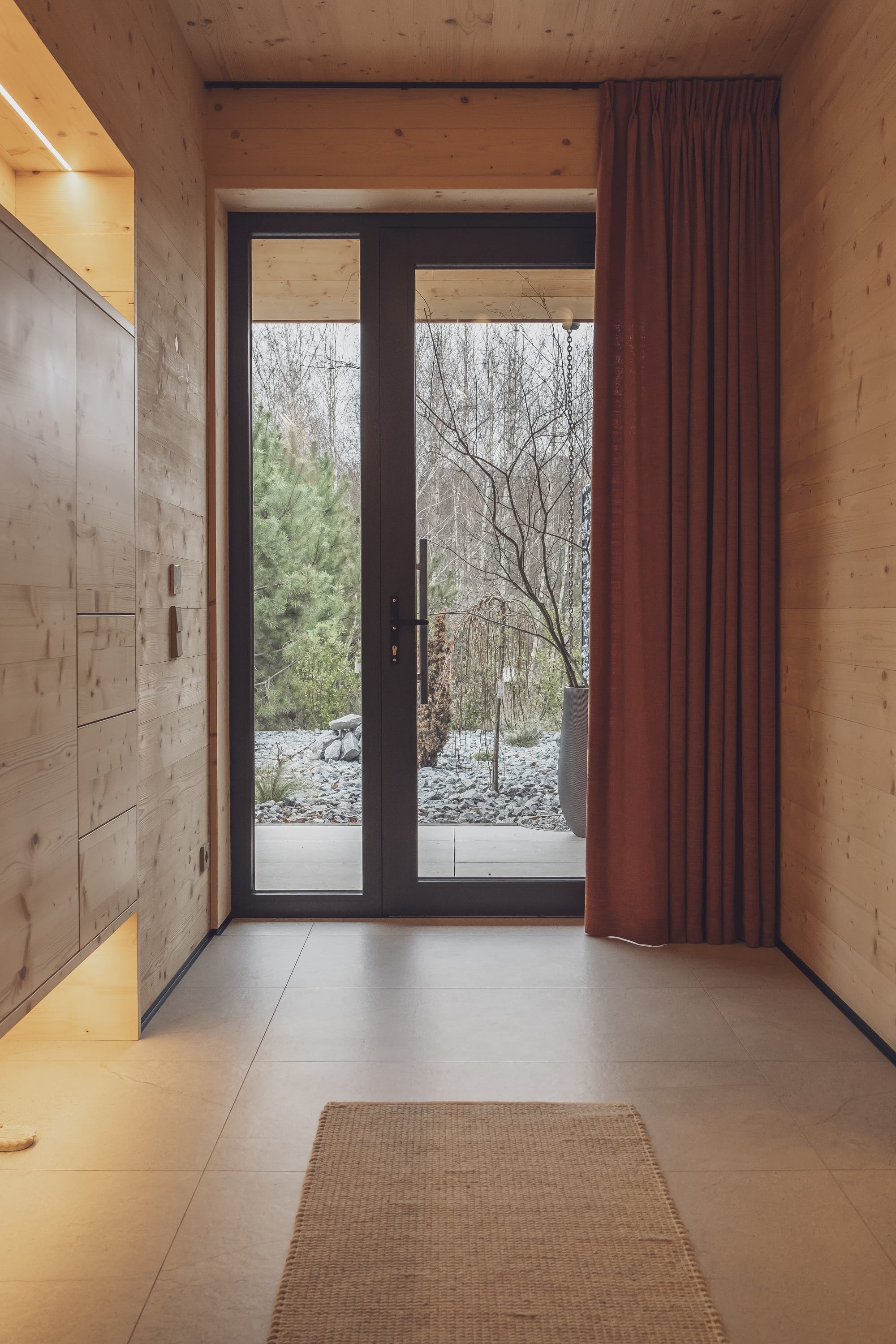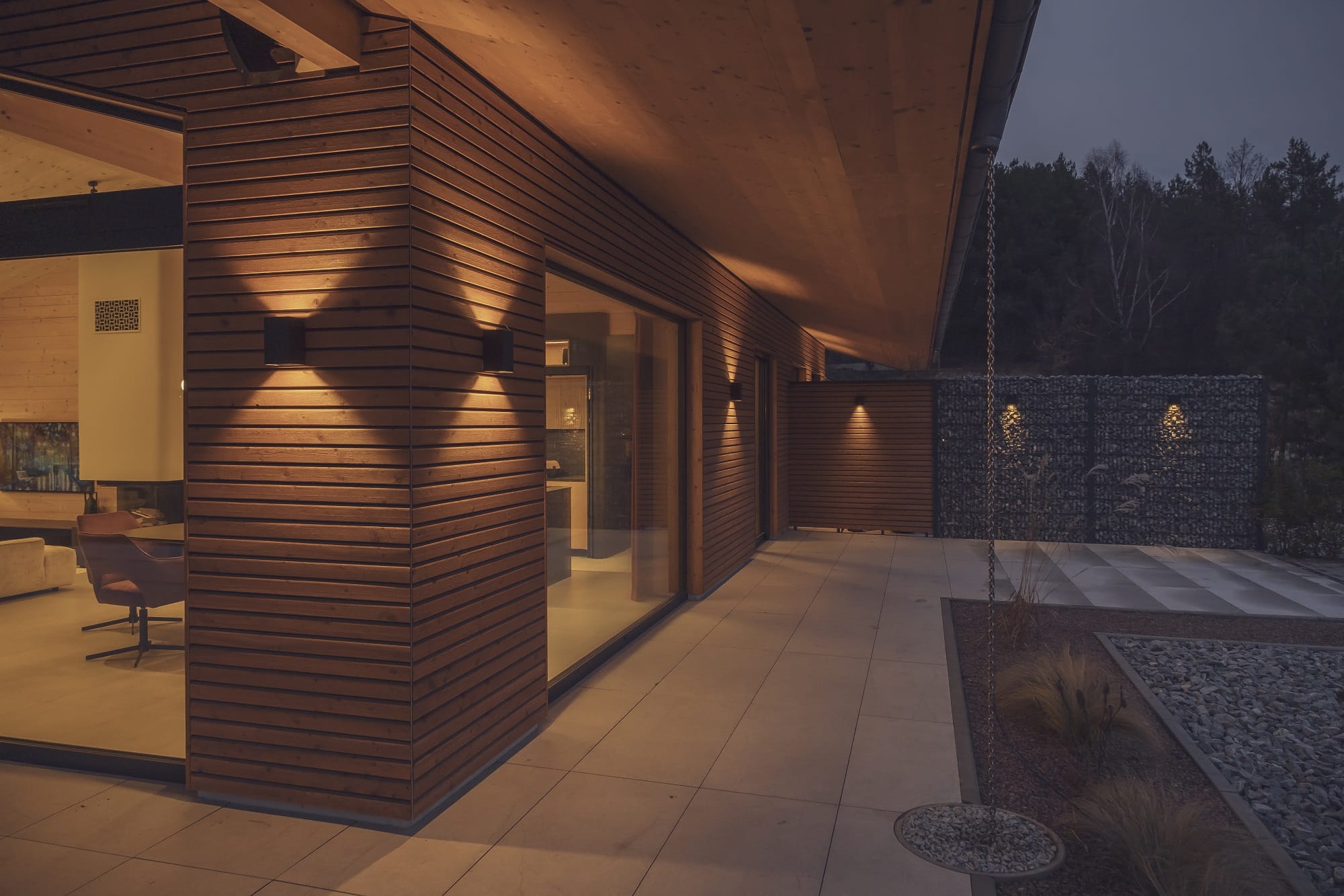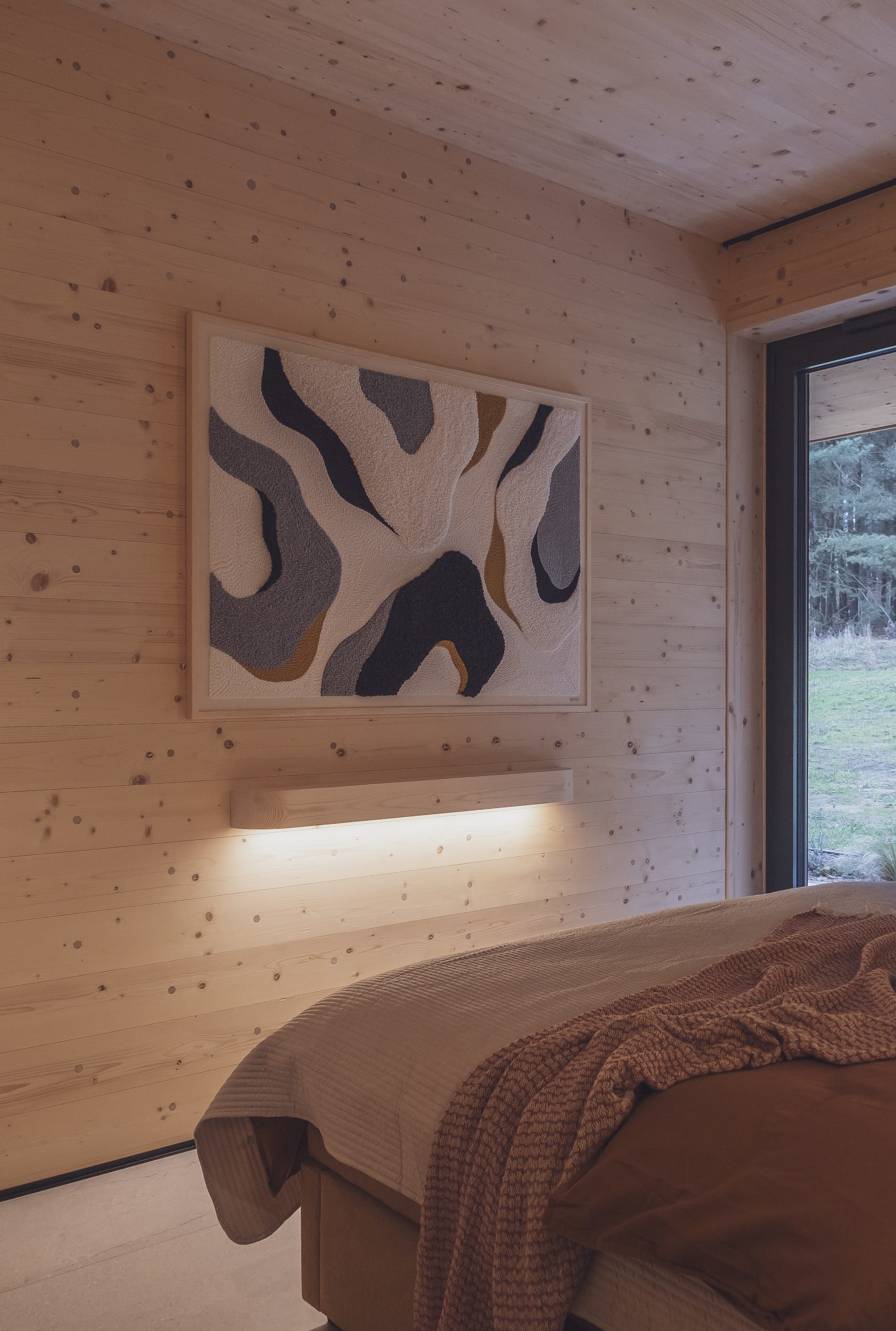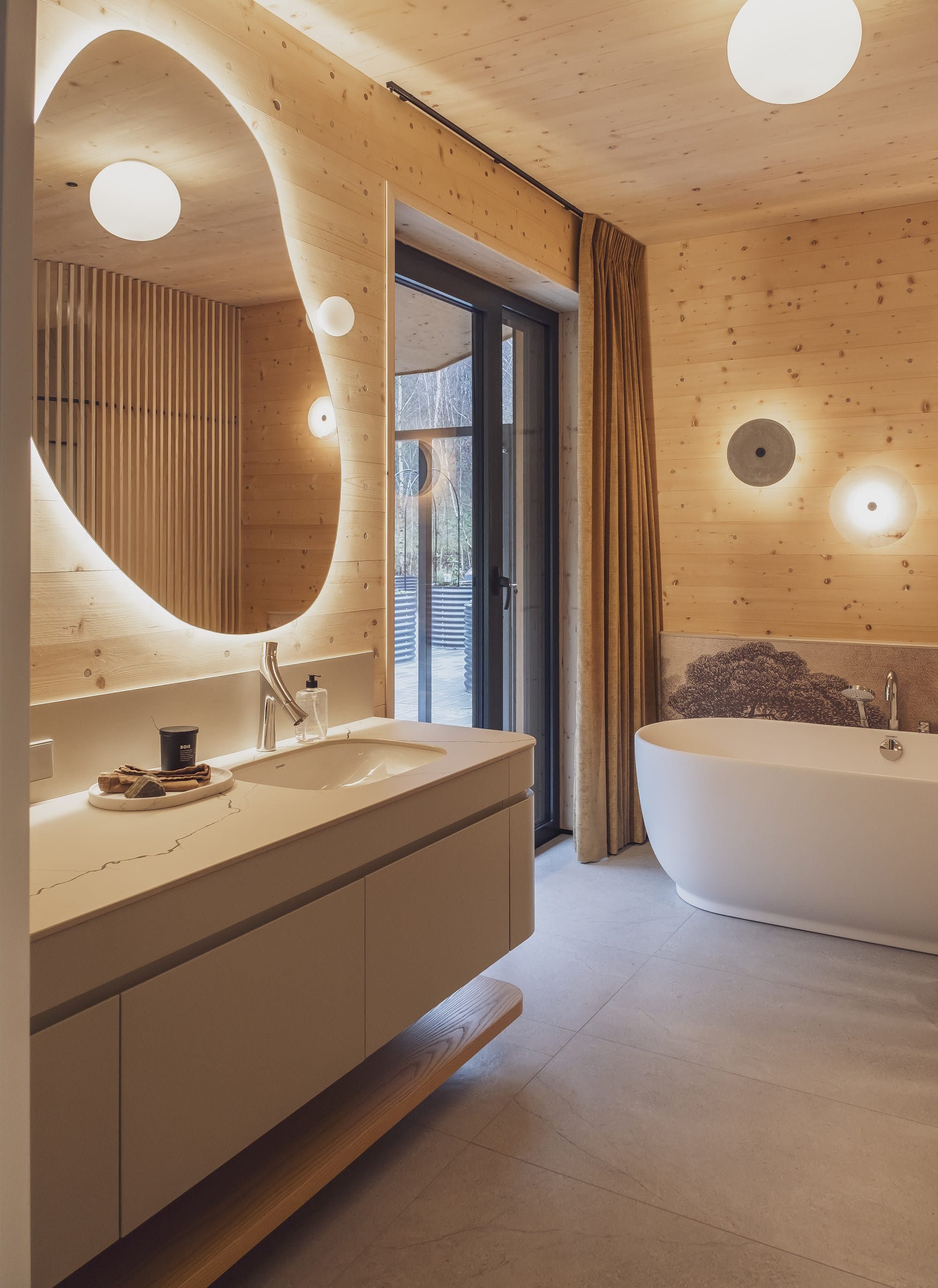 Wizualny charakter wnętrz w dużej mierze zdeterminowała lokalizacja domu na skraju lasu. Duże przeszklenia otwierają budynek na przyrodę, a światło odgrywa kluczową rolę. – Oświetlenie potraktowaliśmy jak narzędzie do budowania nastroju i podkreślania struktury drewna. Zaprojektowaliśmy różne typy światła, od ogólnego po dekoracyjne i nastrojowe. Dzięki temu wnętrze zmienia się w ciągu dnia, a drewno zyskuje głębię i autentyczność – dodaje Monika Jankowiak.