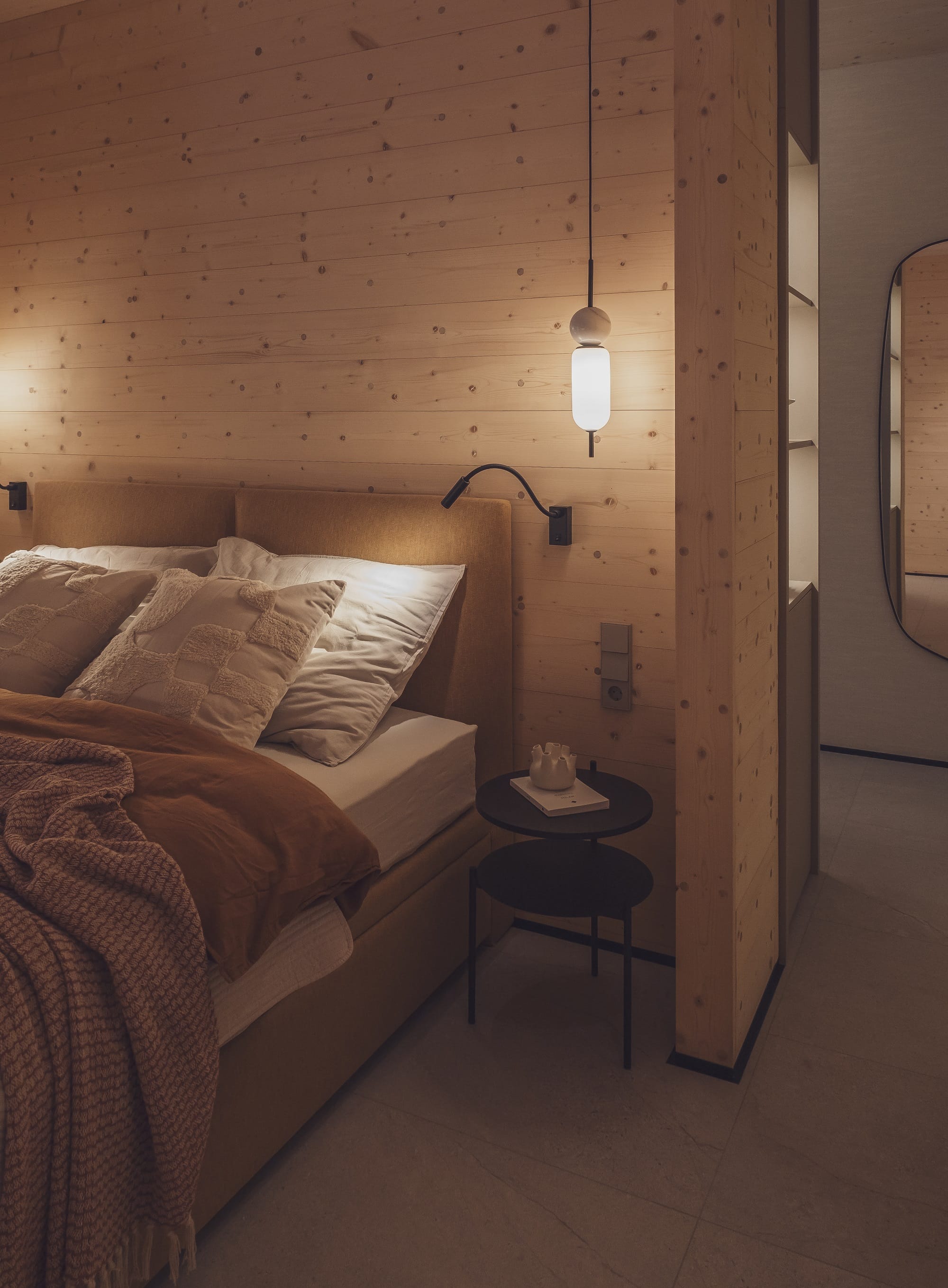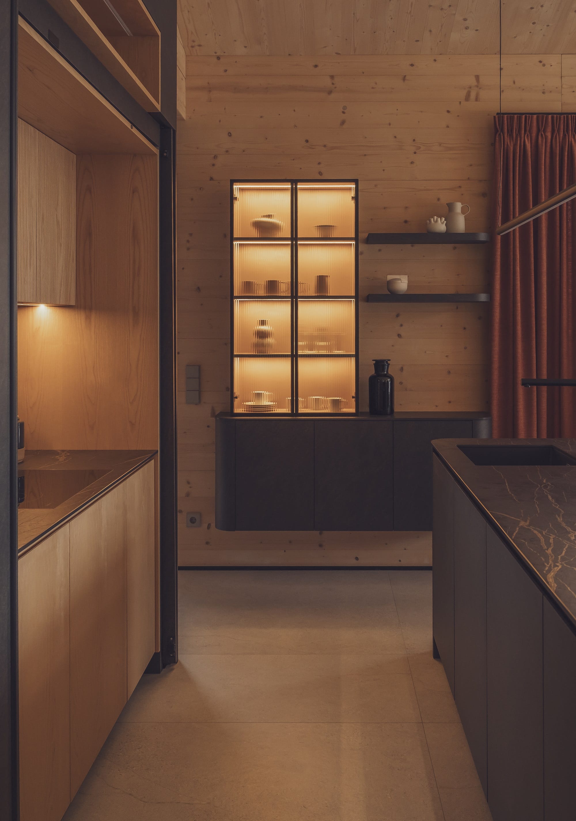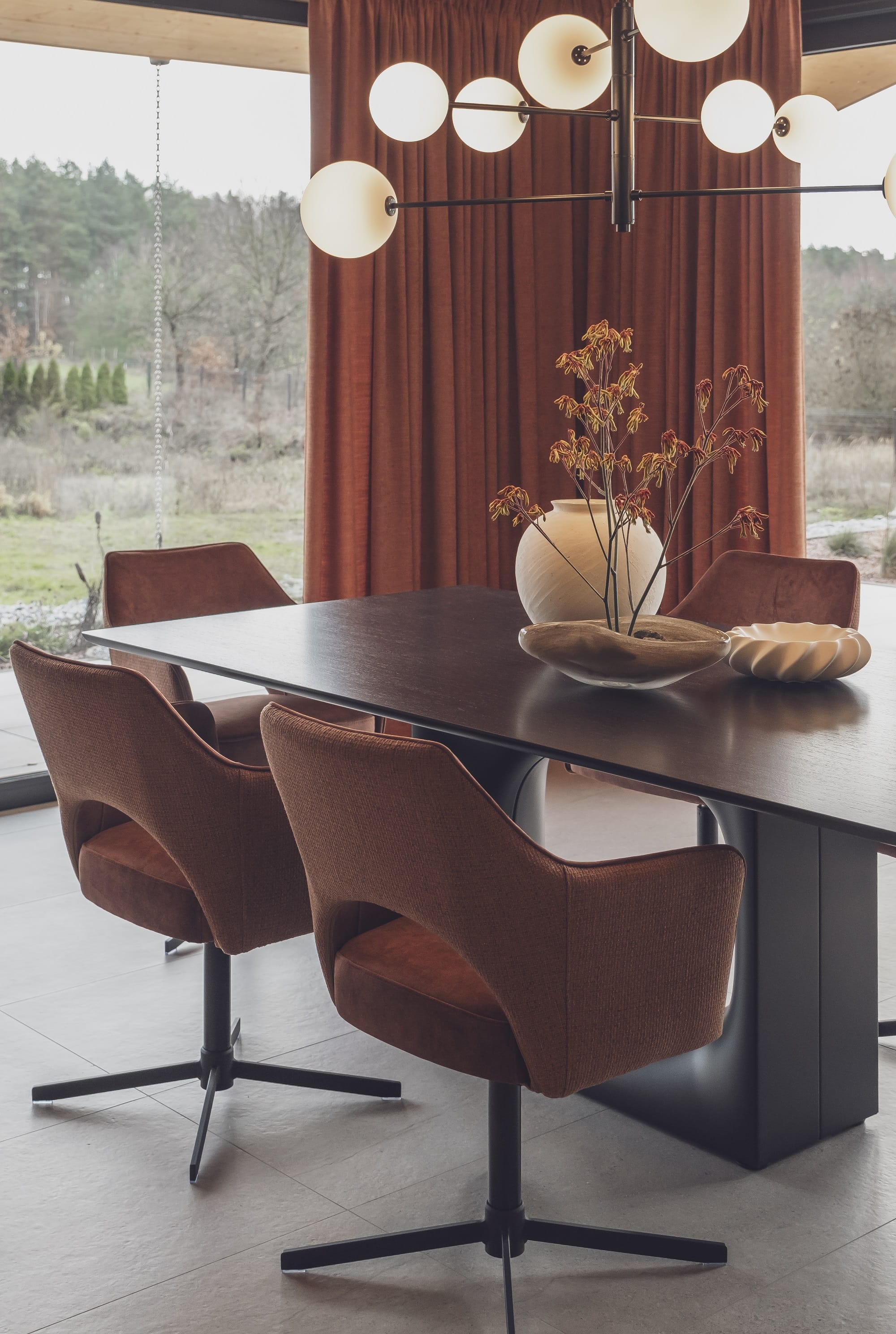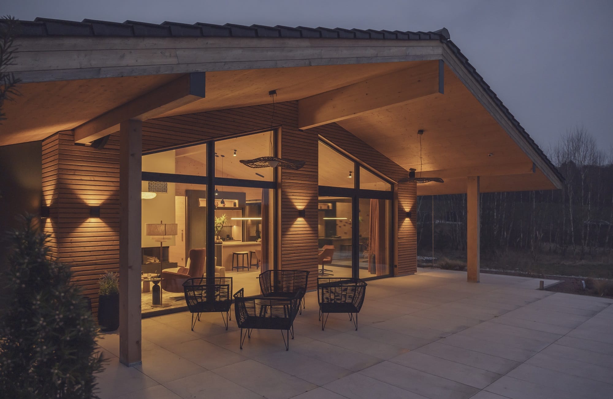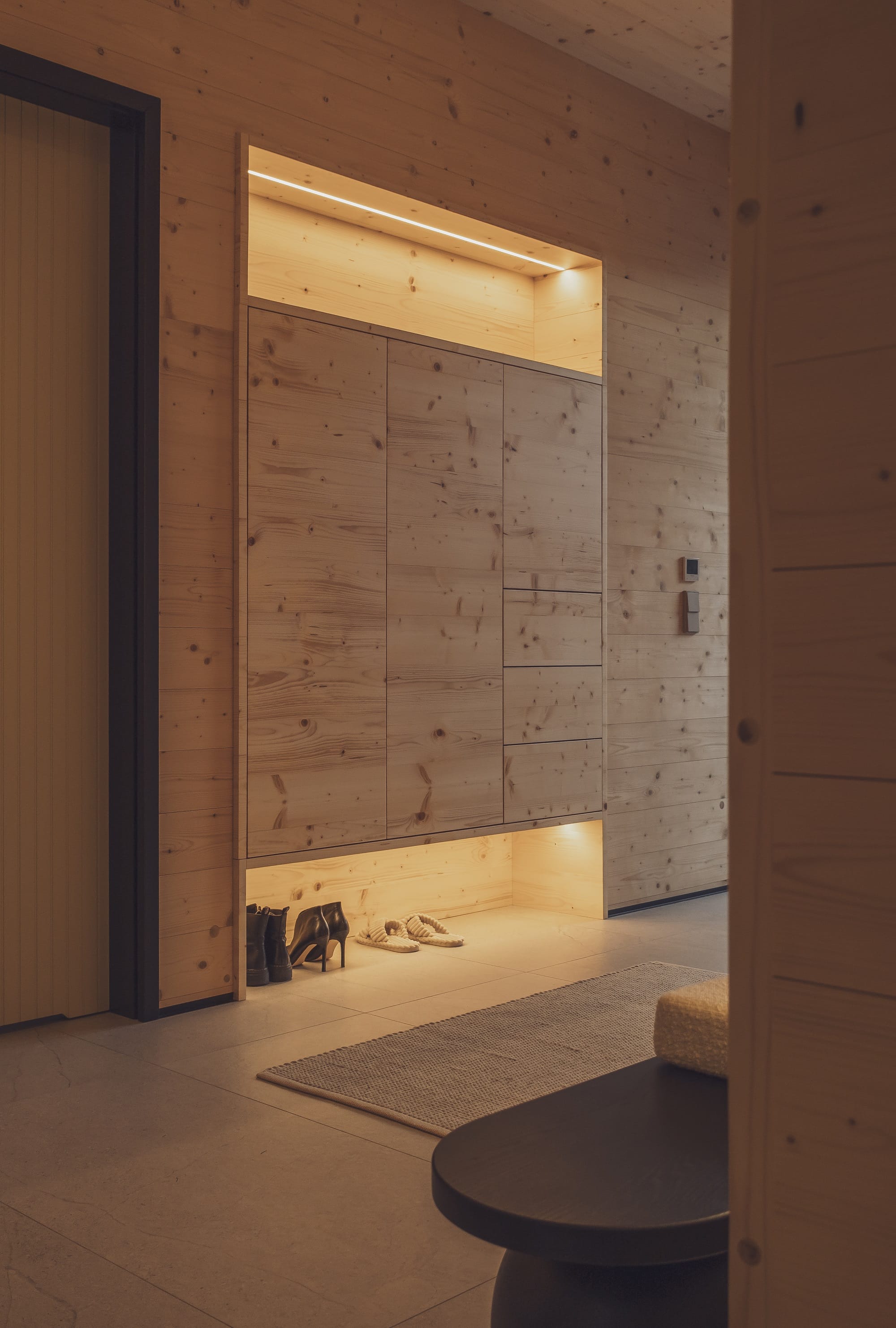 Wizualny charakter wnętrz w dużej mierze zdeterminowała lokalizacja domu na skraju lasu. Duże przeszklenia otwierają budynek na przyrodę, a światło odgrywa kluczową rolę. – Oświetlenie potraktowaliśmy jak narzędzie do budowania nastroju i podkreślania struktury drewna. Zaprojektowaliśmy różne typy światła, od ogólnego po dekoracyjne i nastrojowe. Dzięki temu wnętrze zmienia się w ciągu dnia, a drewno zyskuje głębię i autentyczność – dodaje Monika Jankowiak.
