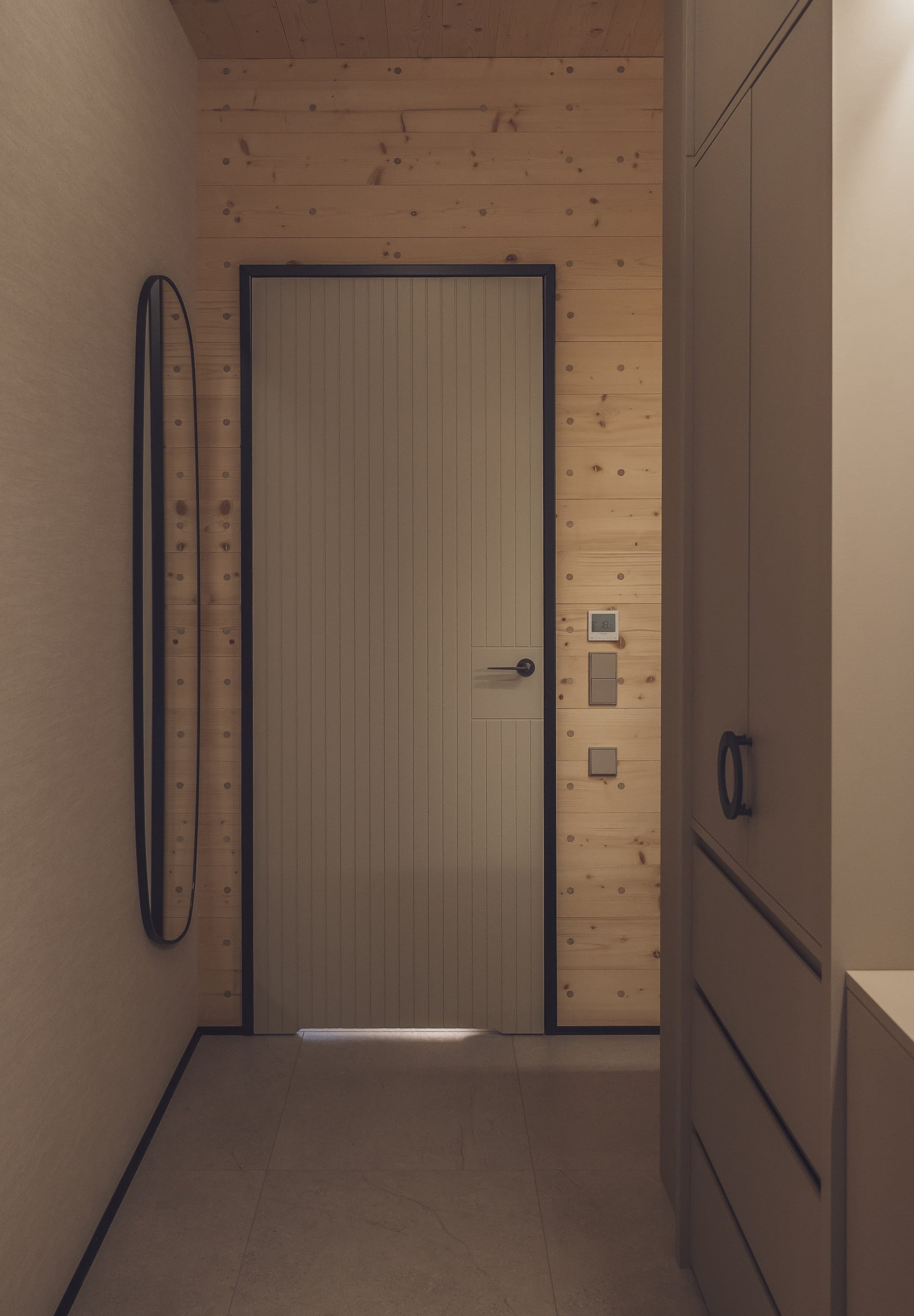 We wnętrzu zaplanowano wysoki salon z kuchnią i jadalnią, prywatną strefę z sypialnią, garderobą, łazienką z sauną oraz pomieszczenia gospodarcze i garaż. Sporym wyzwaniem okazało się połączenie drewnianych ścian i sufitów z pozostałymi elementami wykończenia.