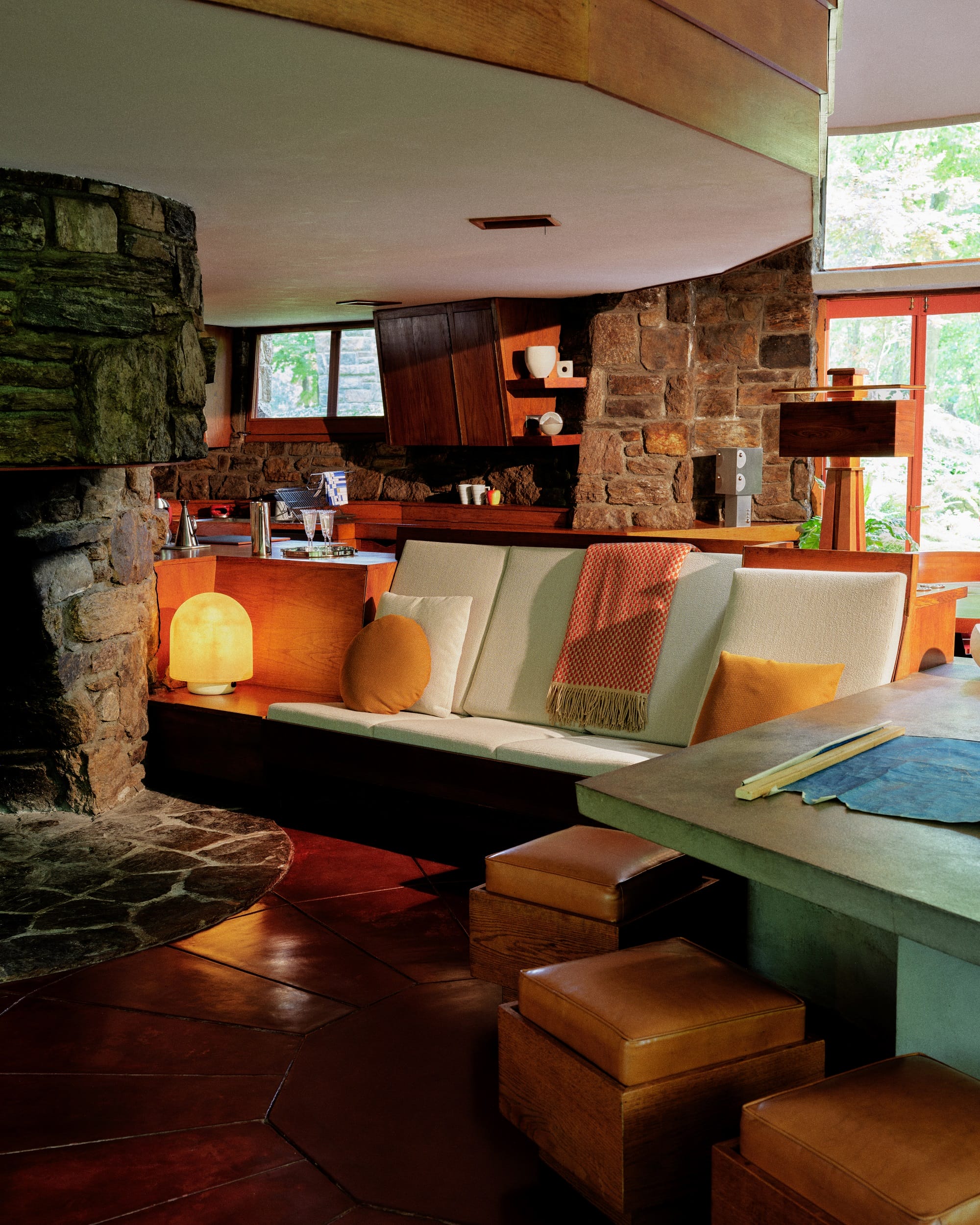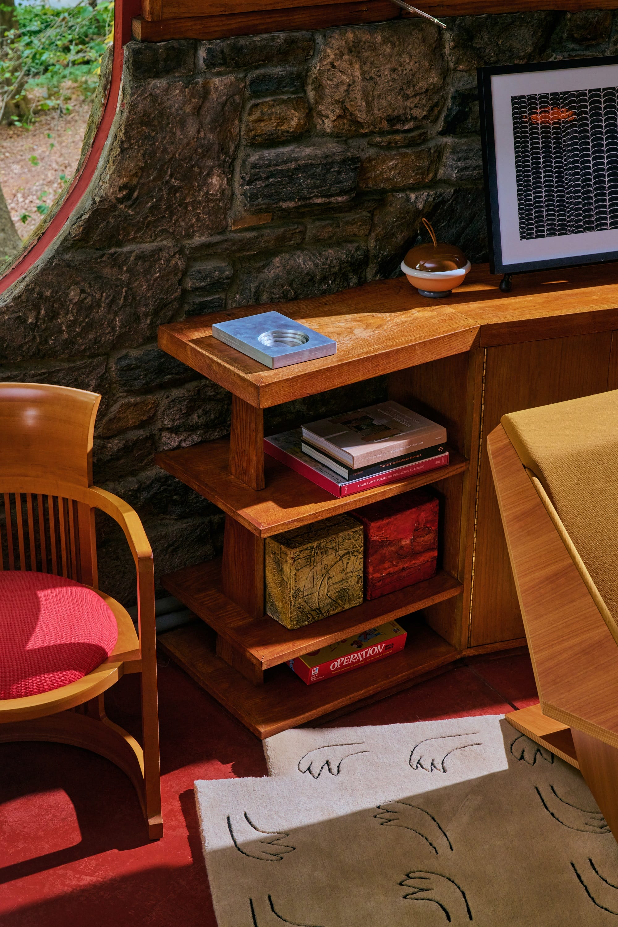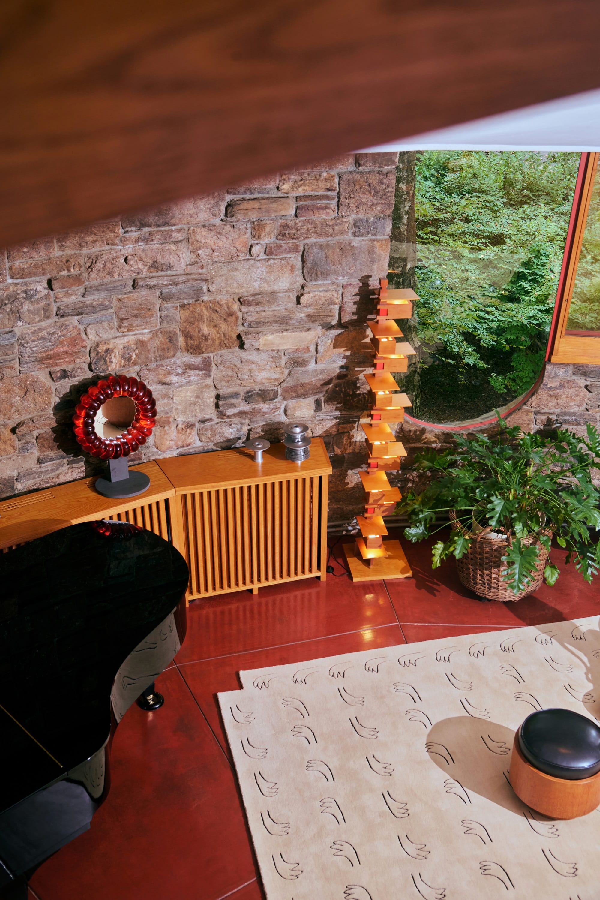 Znajdziemy tu także obiekty zaprojektowane przez Farrah Sit, Fort Standard, Faye Toogood, Sophie Lou Jacobsen i wielu innych. Większe elementy – marek Cassina, Poltrona Frau i Gohar World – uzupełniają modernistyczną estetykę oryginalnych mebli, od regałów po łóżka, z których wiele zostało zaprojektowanych specjalnie z myślą o nietypowym układzie domu. Miejsce nie jest otwarte do zwiedzania, choć co jakiś czas odwiedzają je ciekawscy miłośnicy architektury Wrighta. – Zawsze znajdzie się ktoś, znajomy znajomego z sąsiedztwa, kto chce wpaść do nas i zobaczyć, jak dom wygląda w środku – wyjaśnia Jeffrey Renz.