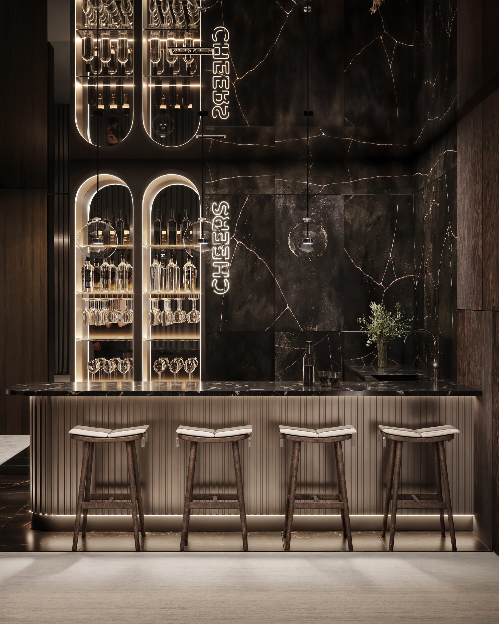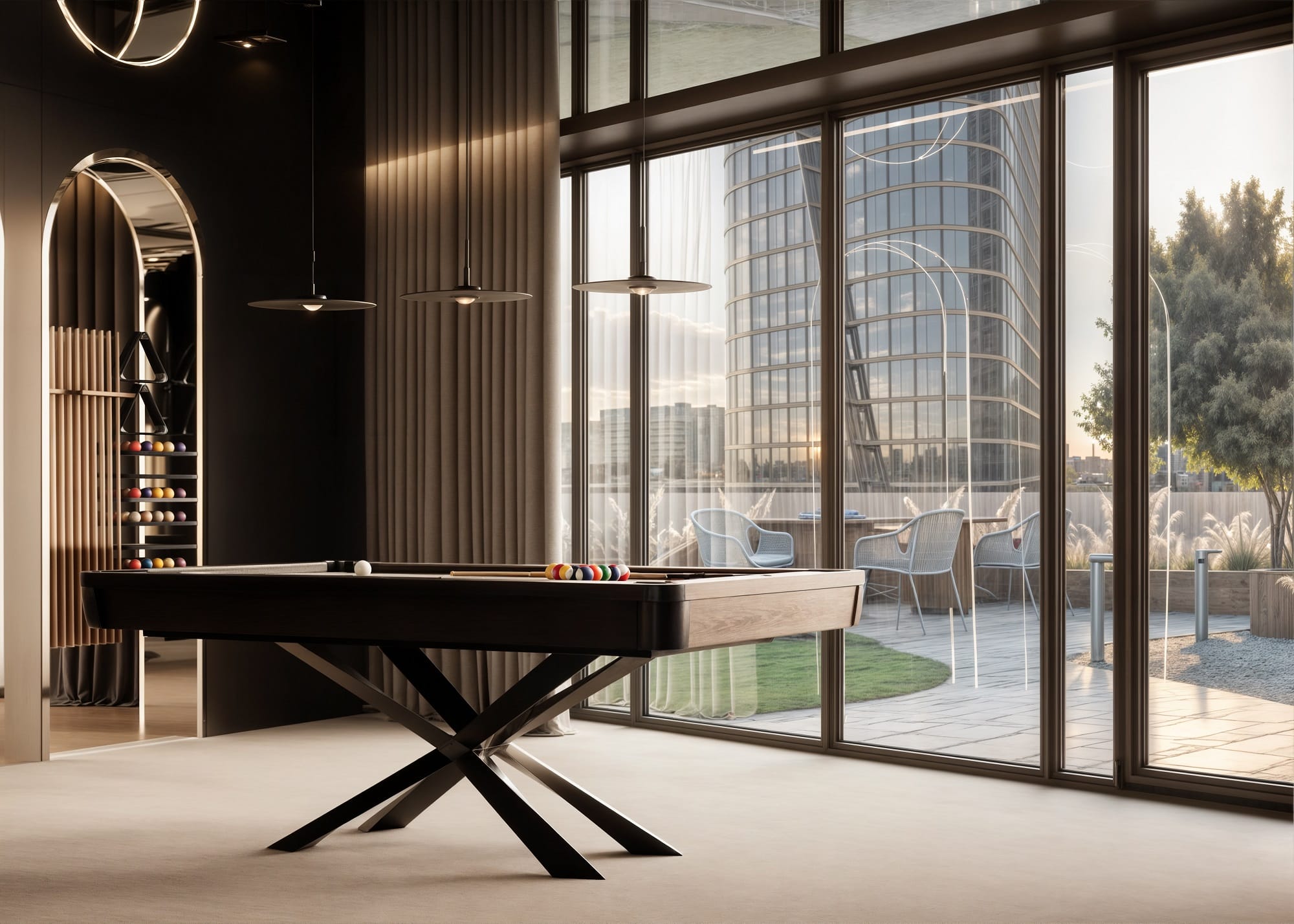 Zanim jednak wybierzemy dedykowaną windę dostępną tylko dla mieszkańców, która dowiezie nas na sam szczyt, warto zatrzymać się znacznie niżej, na szóstej kondygnacji, na której Dawid Woliński zaaranżował klub mieszkańca z cocktail barem, strefą wellness z tężnią solankową i sauną. Na tym samym piętrze projektant urządził również strefę coworkingową dla osób pracujących zdalnie, bez rezygnacji z komfortu przemyślanej infrastruktury biurowej.