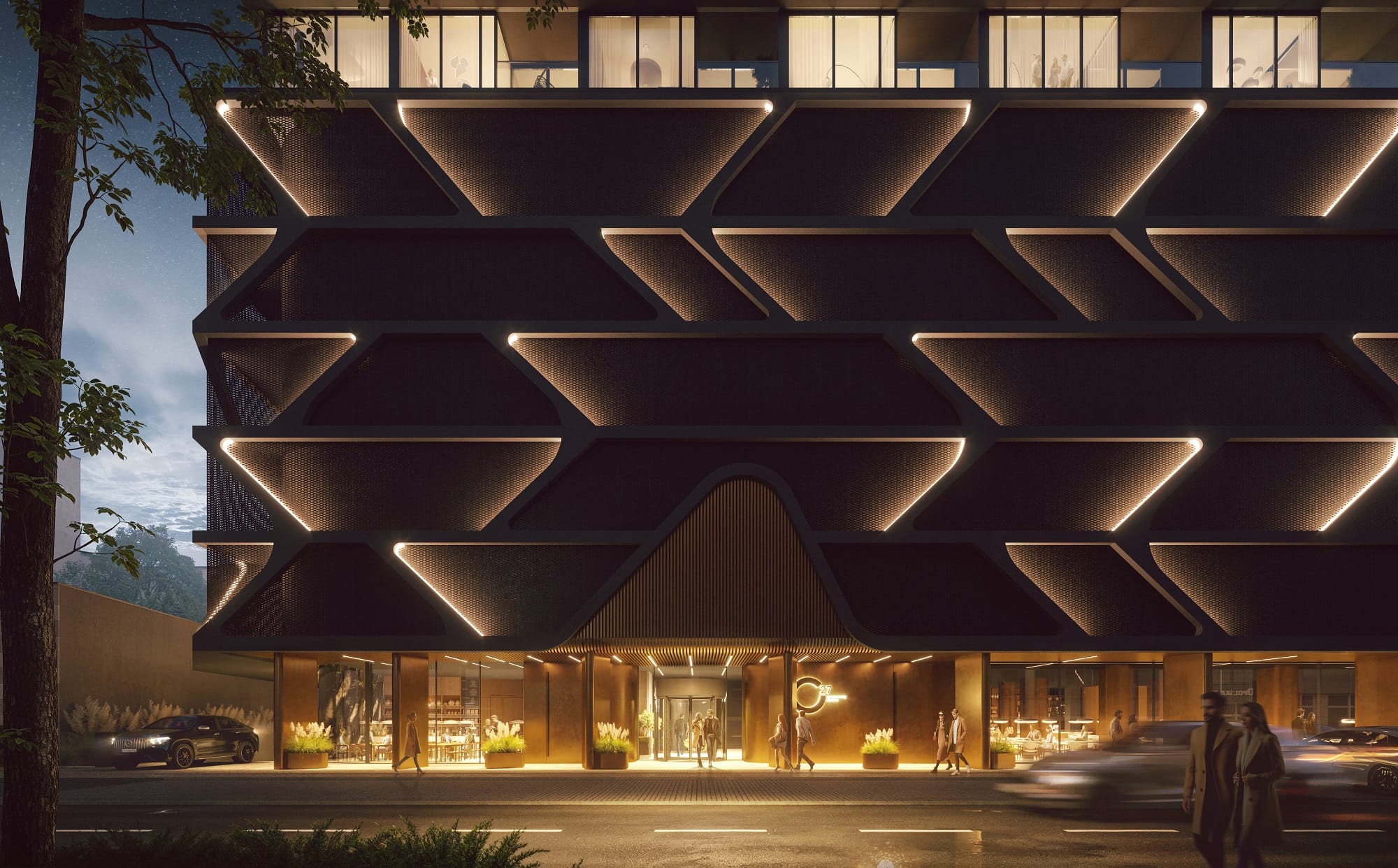 Już wejście do lobby zapowiada, że wizyta w O27 to doświadczenie zaprojektowane od pierwszego kroku. Mieszkańców wita instalacja artystyczna ze ścianą wodną oraz specjalnie zaprojektowana kompozycja dźwięków i zapachów, a windę przywołuje aplikacja na smartfonie.
