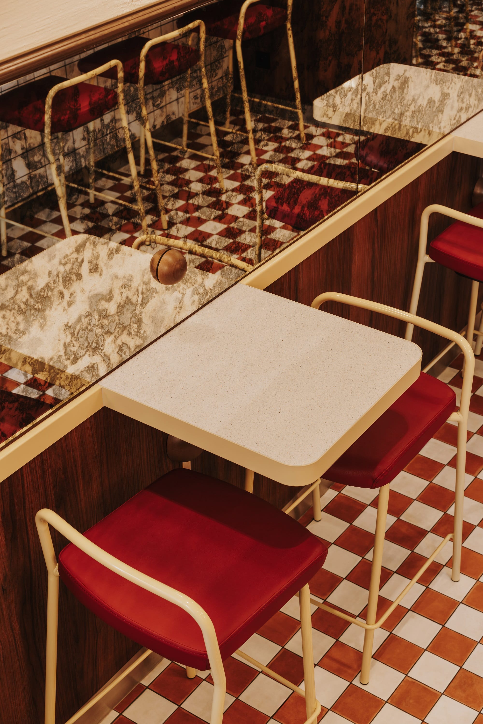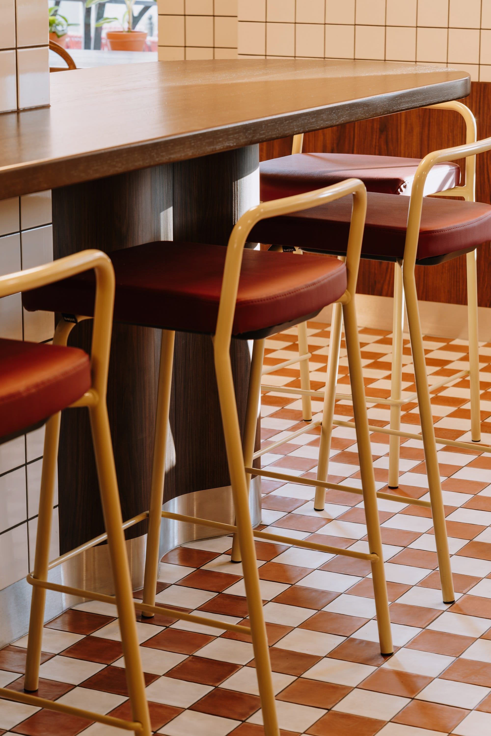 – Jednym z wymogów inwestorów było przygotowanie wnętrza na funkcjonalną obsługę dużego ruchu w możliwie krótkim czasie. W połączeniu z niewielkim metrażem skłoniło nas to do propozycji wysokich siedzisk przy większości stolików – pozwalają one na wygodną obsługę większej liczby osób naraz. Większość stolików posiada montowane na ścianie blaty bez podparcia, dzięki czemu uwolniliśmy więcej miejsca na posadzce, poprawiając komfort gości bez konieczności rezygnacji z części miejsc – tłumaczą projektanci.