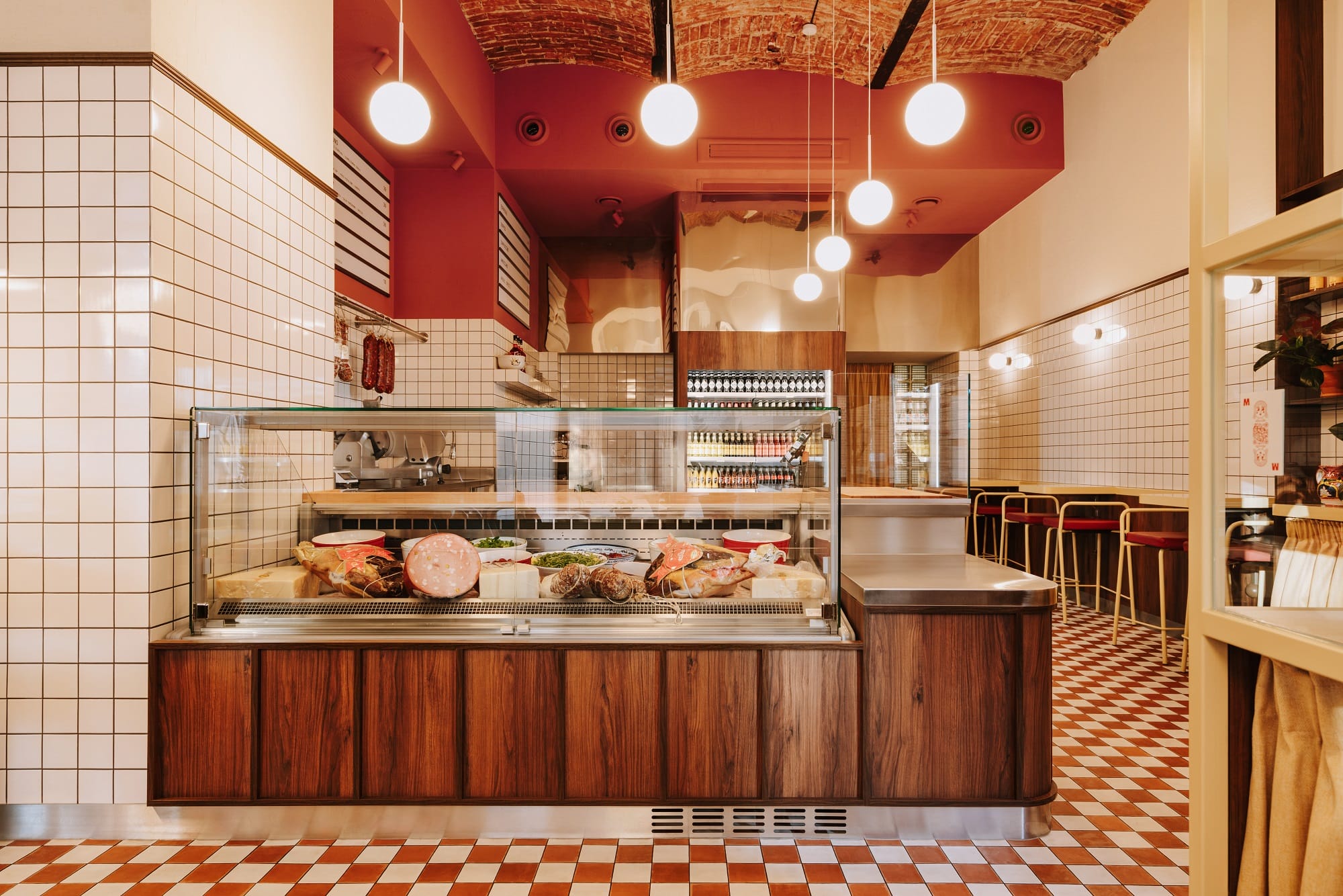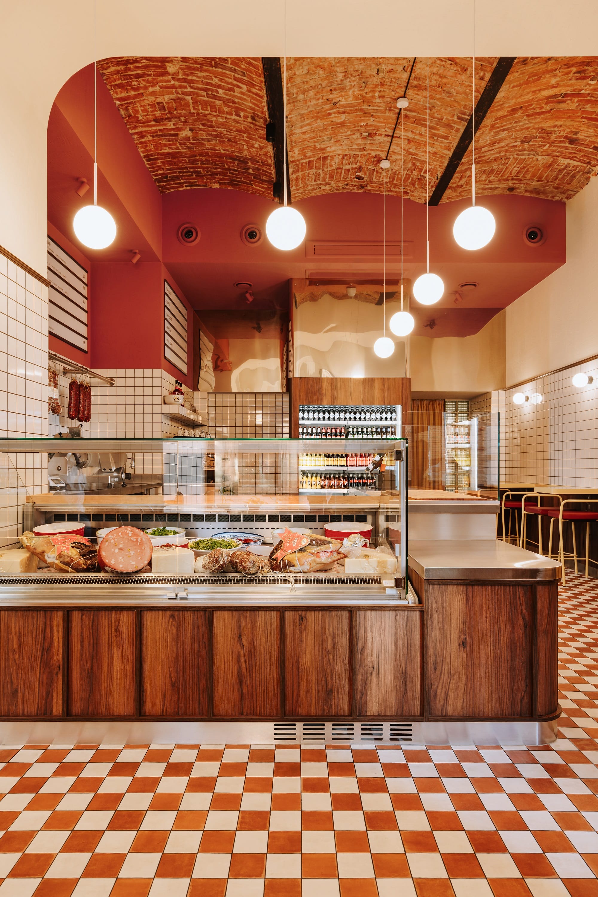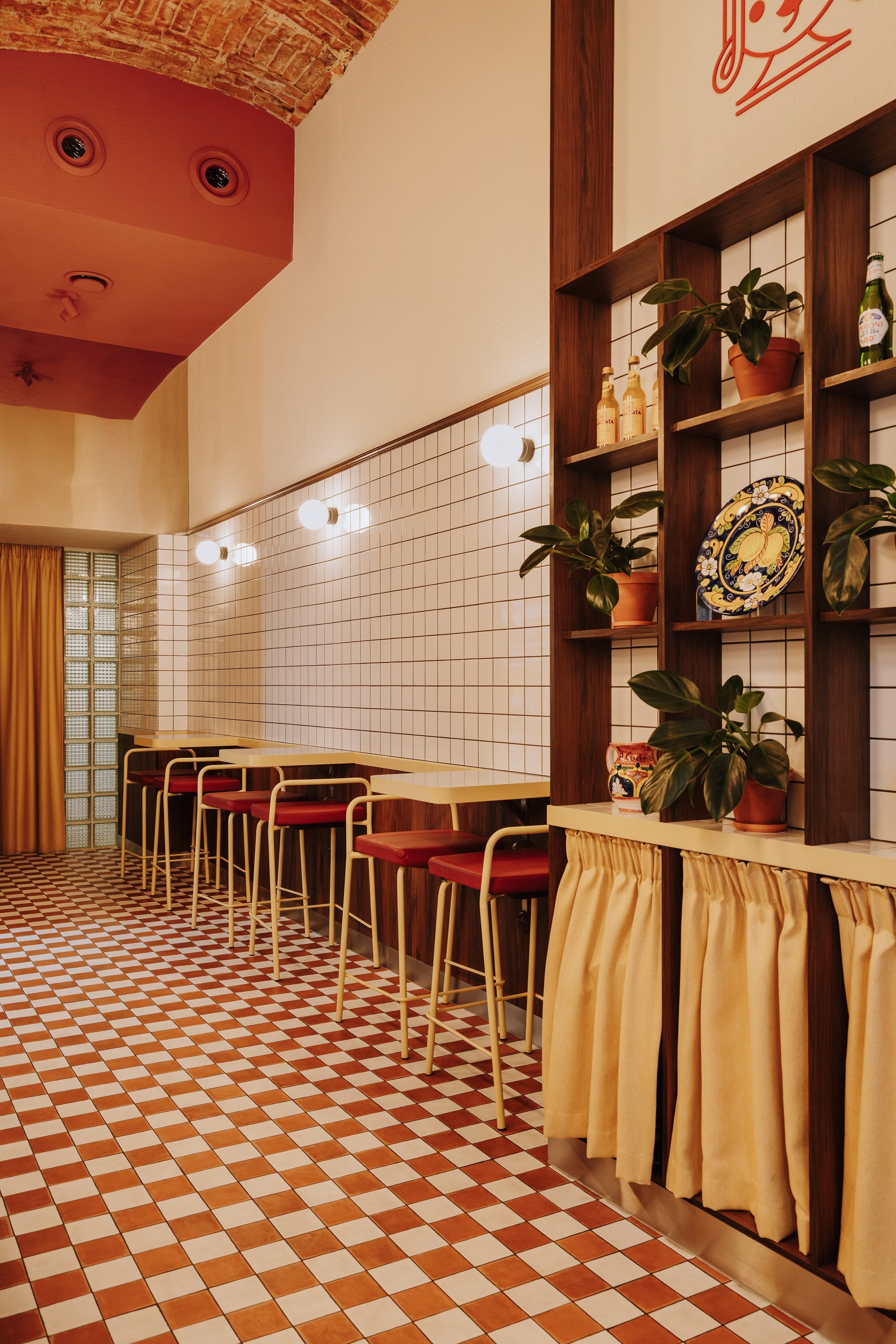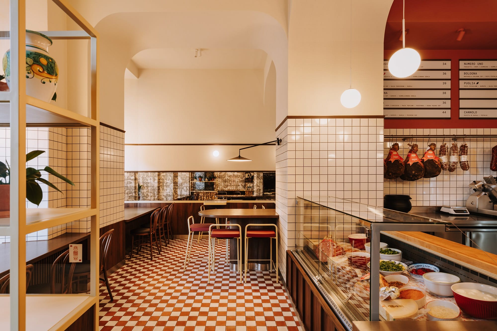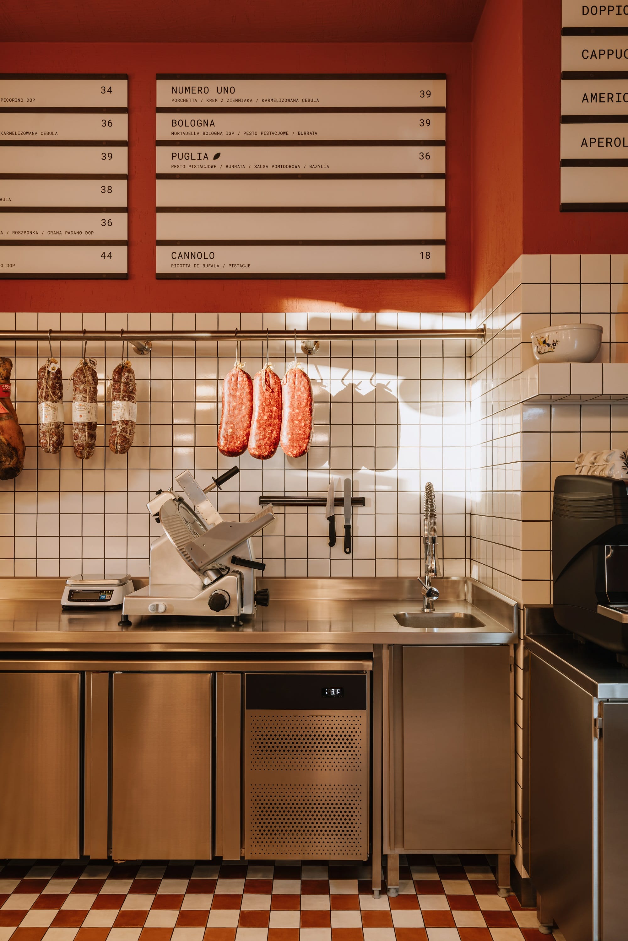 Biel i czerwień szachownicowej posadzki, ciemne drewno i przełamujące tonację piaskowe żółcie uzupełnione stalą nierdzewną opowiadają historię o tej odsłonie włoskiej kuchni, w której nie każdy posiłek musi być wyszukany i skomplikowany. Oszczędna forma białych płytek, przywołująca na myśl lokalne masarnie, przełamana jest czerwienią na ścianach i suficie oraz ocieplona drewnem sztukaterii.