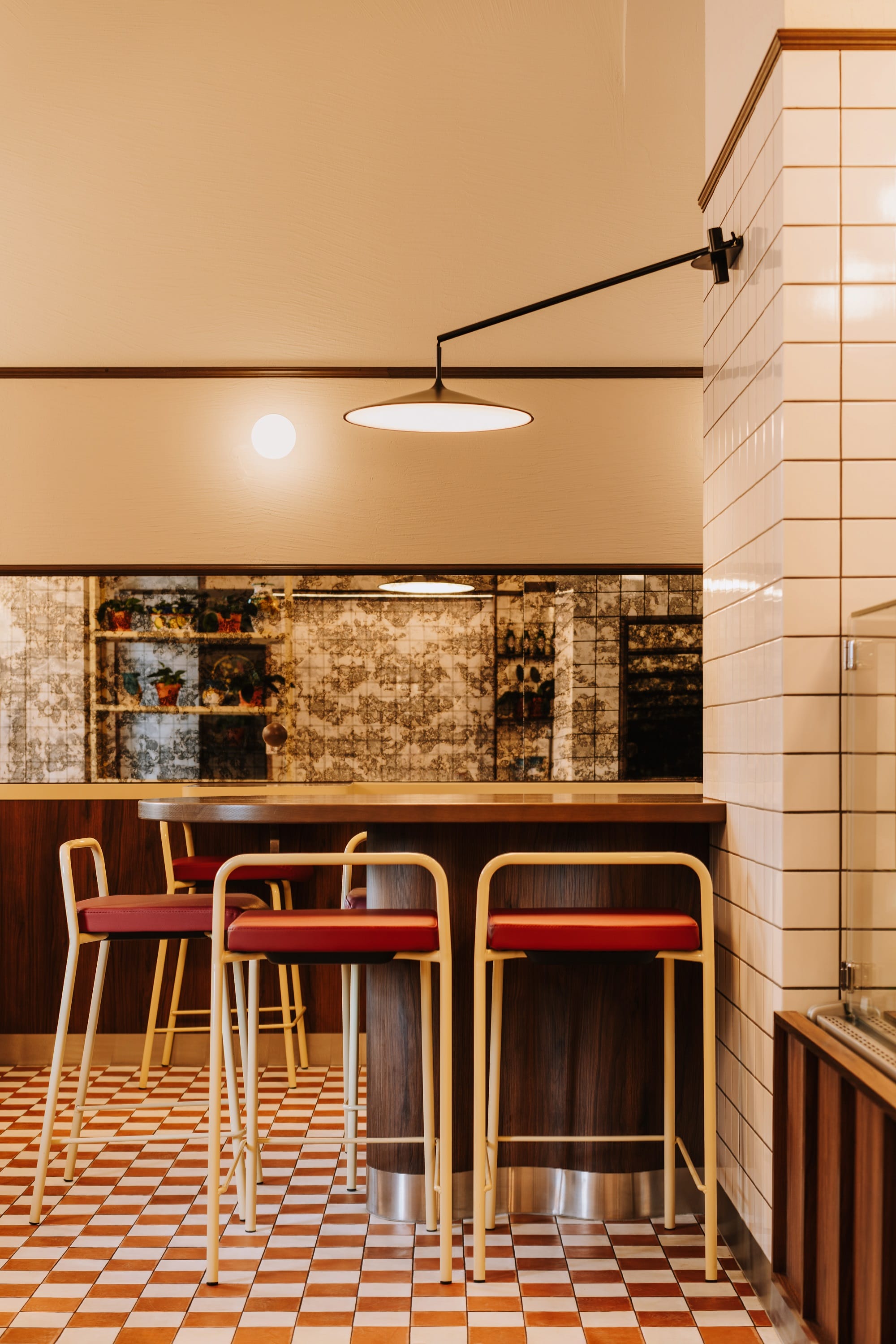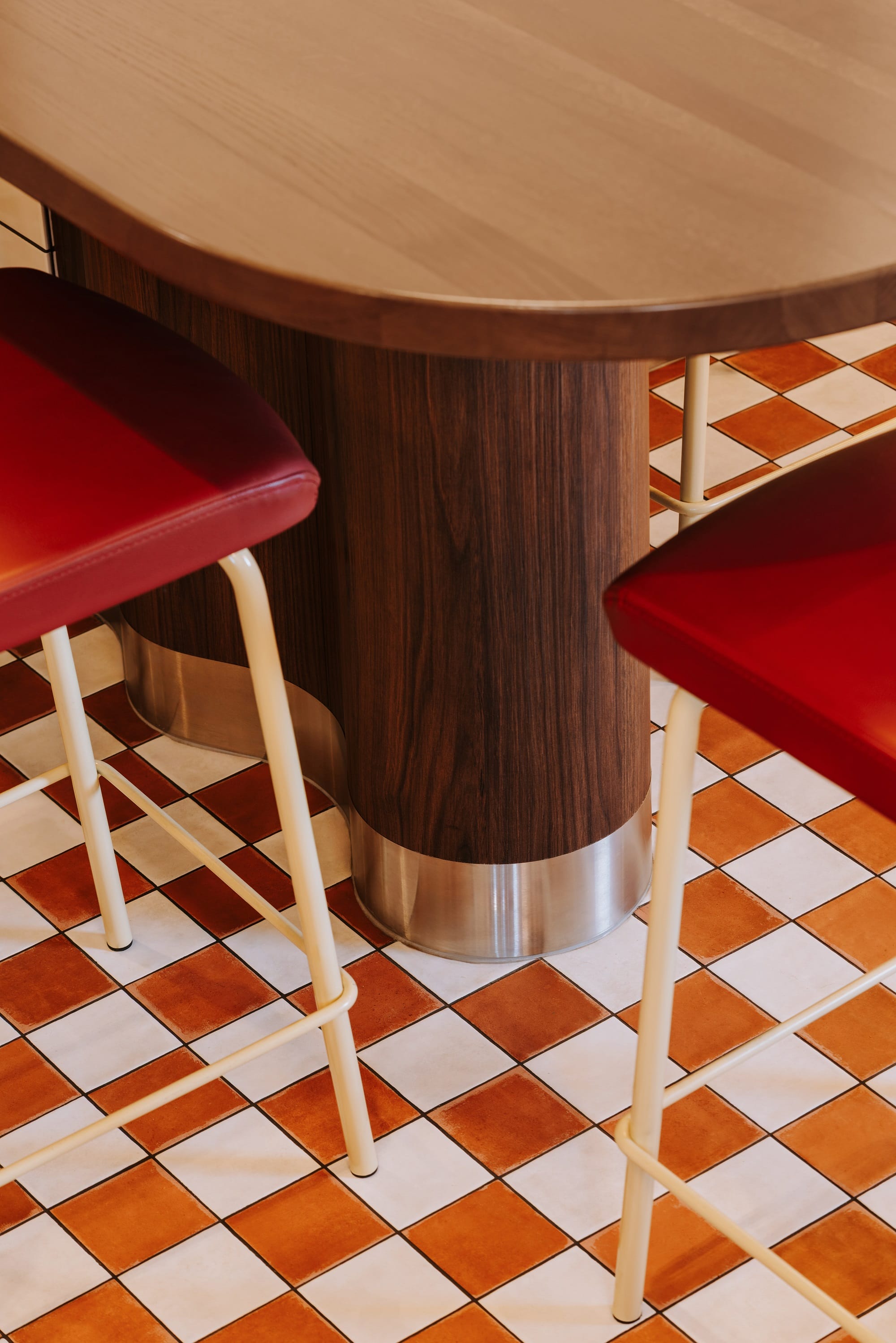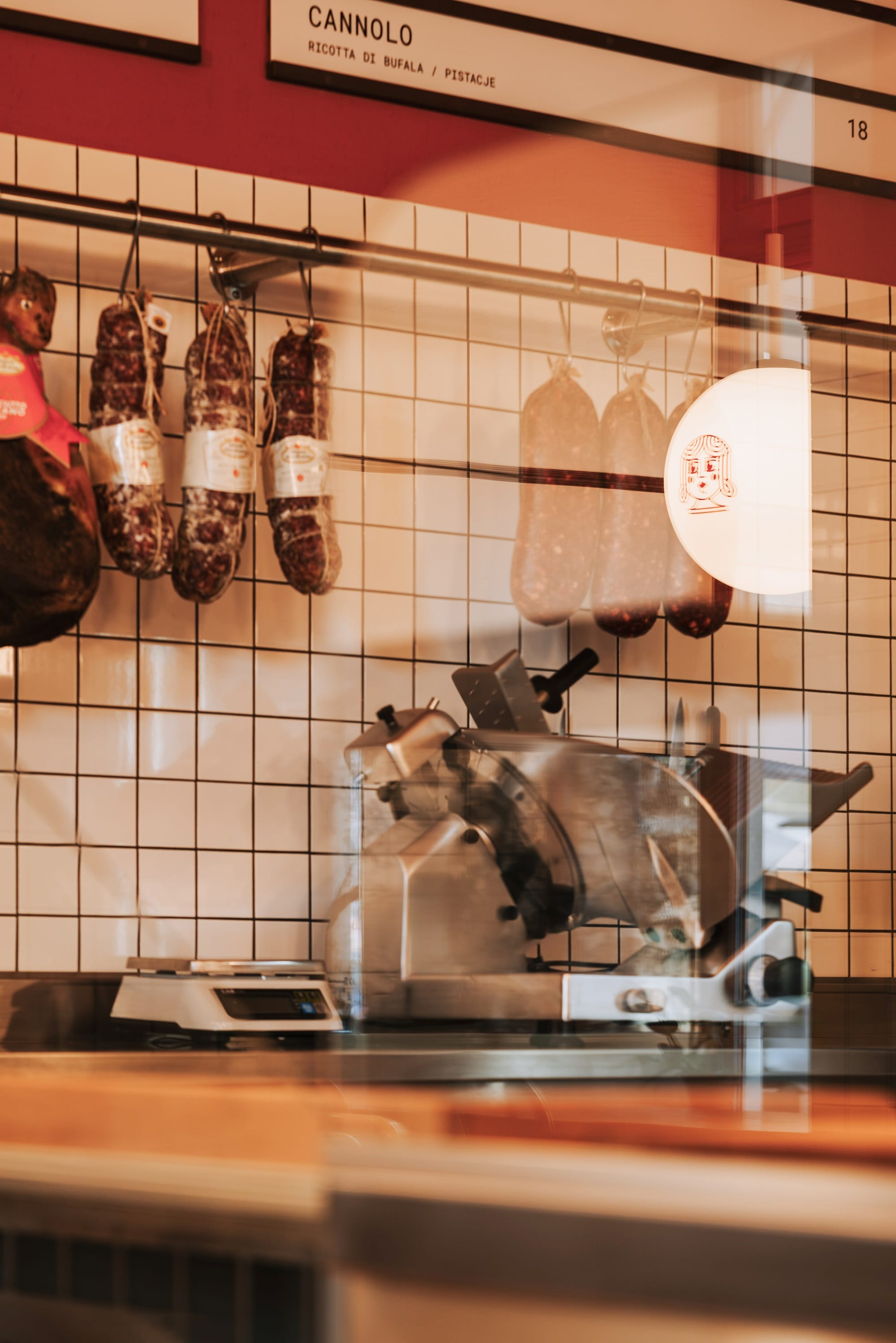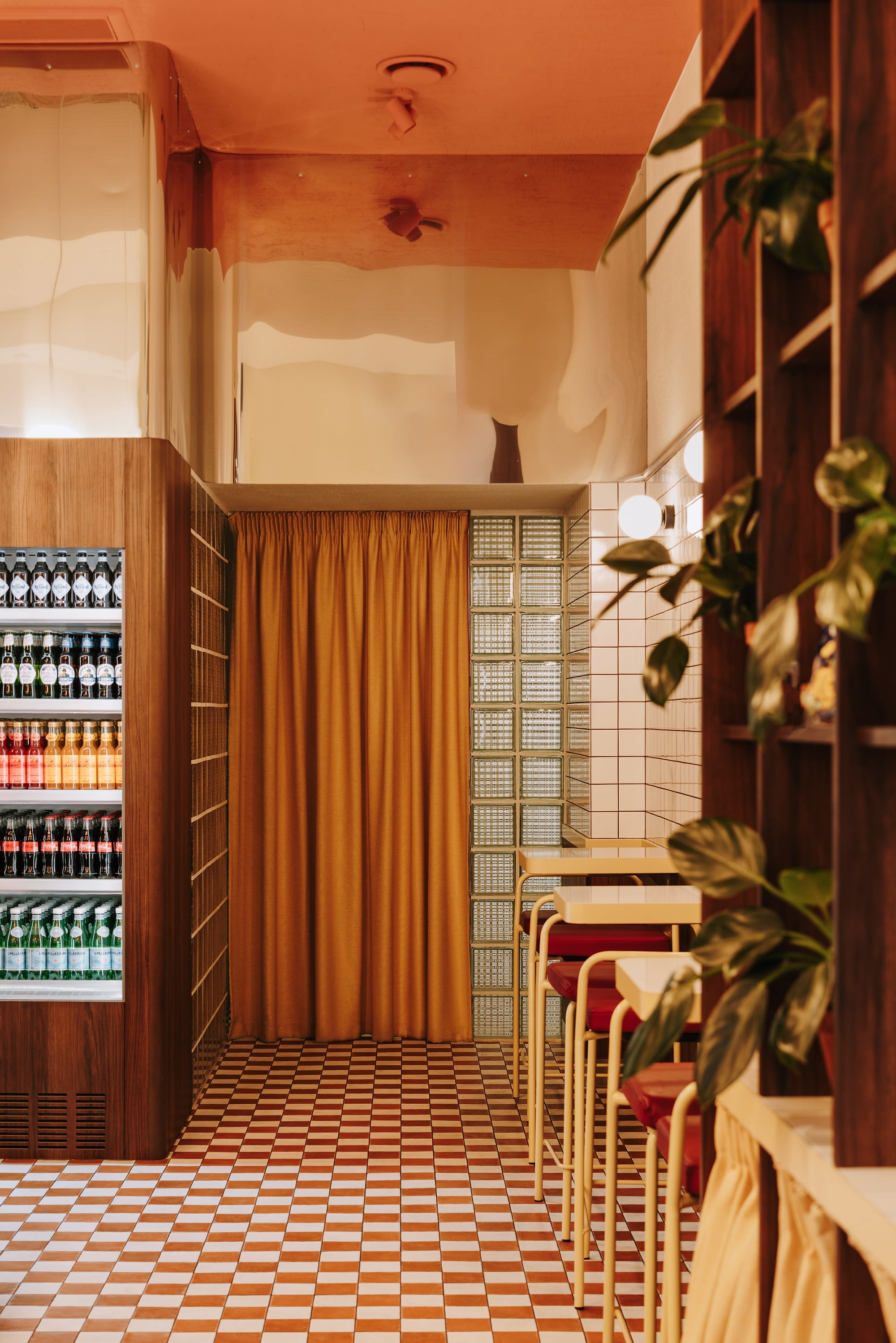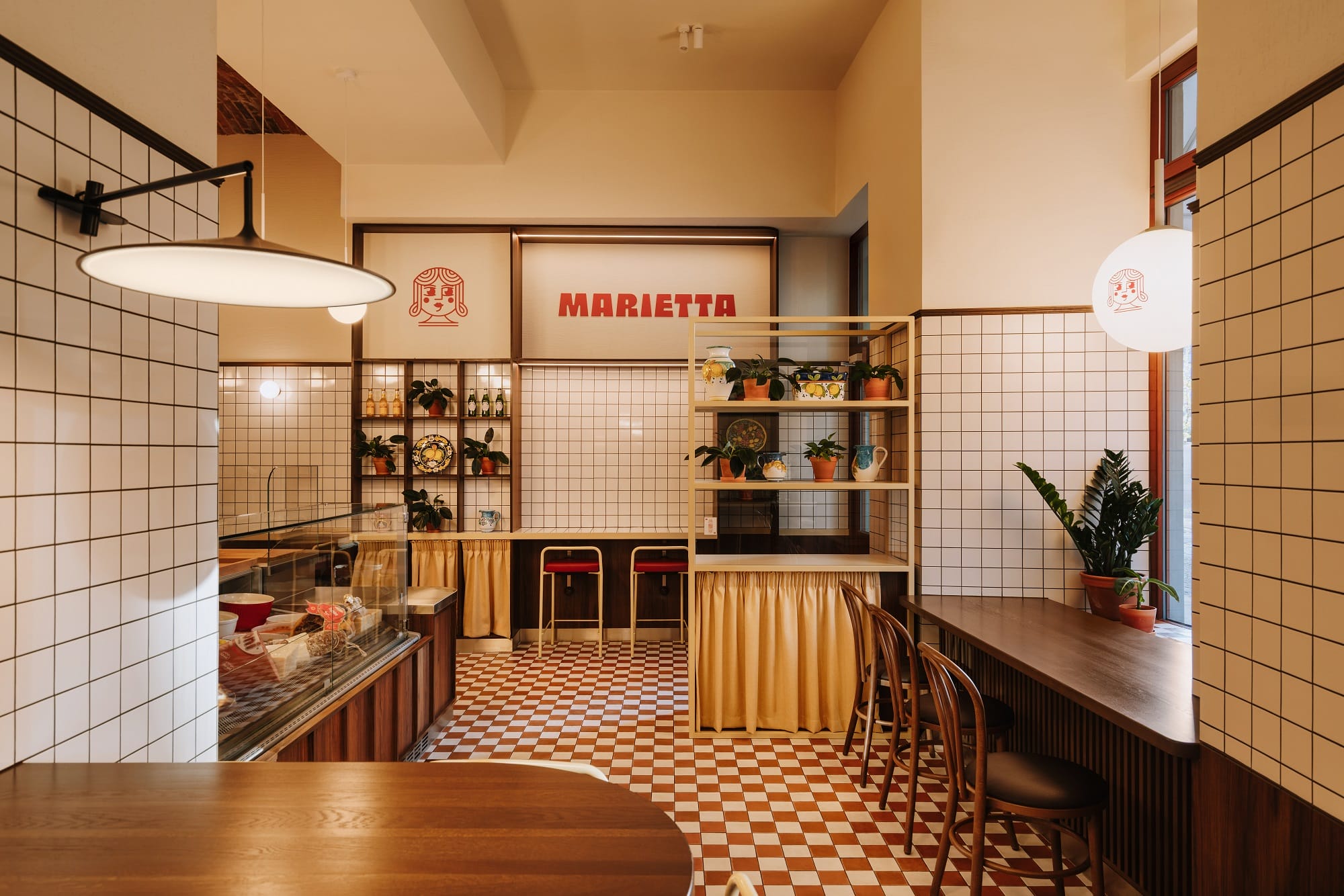 Biel i czerwień szachownicowej posadzki, ciemne drewno i przełamujące tonację piaskowe żółcie uzupełnione stalą nierdzewną opowiadają historię o tej odsłonie włoskiej kuchni, w której nie każdy posiłek musi być wyszukany i skomplikowany. Oszczędna forma białych płytek, przywołująca na myśl lokalne masarnie, przełamana jest czerwienią na ścianach i suficie oraz ocieplona drewnem sztukaterii.