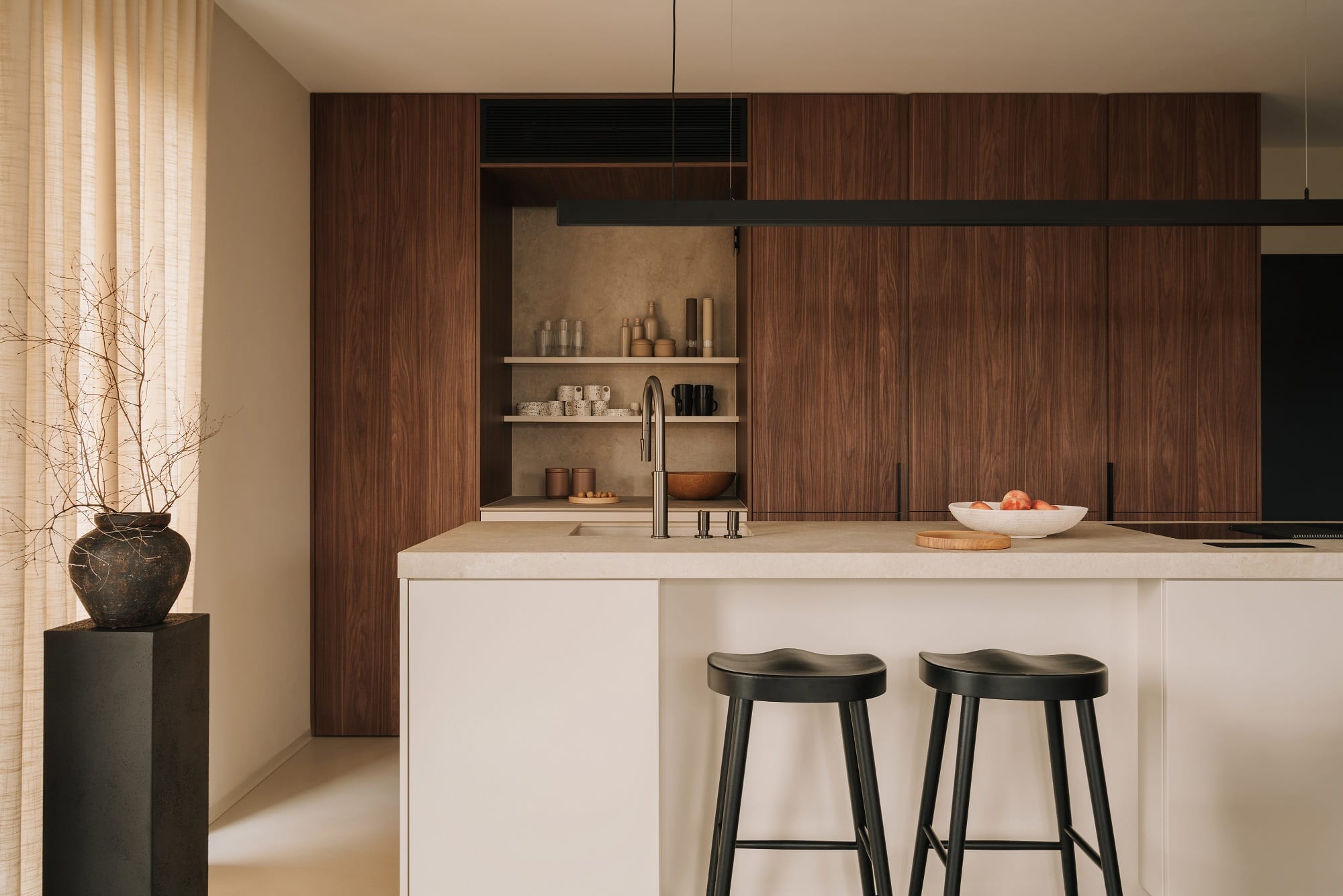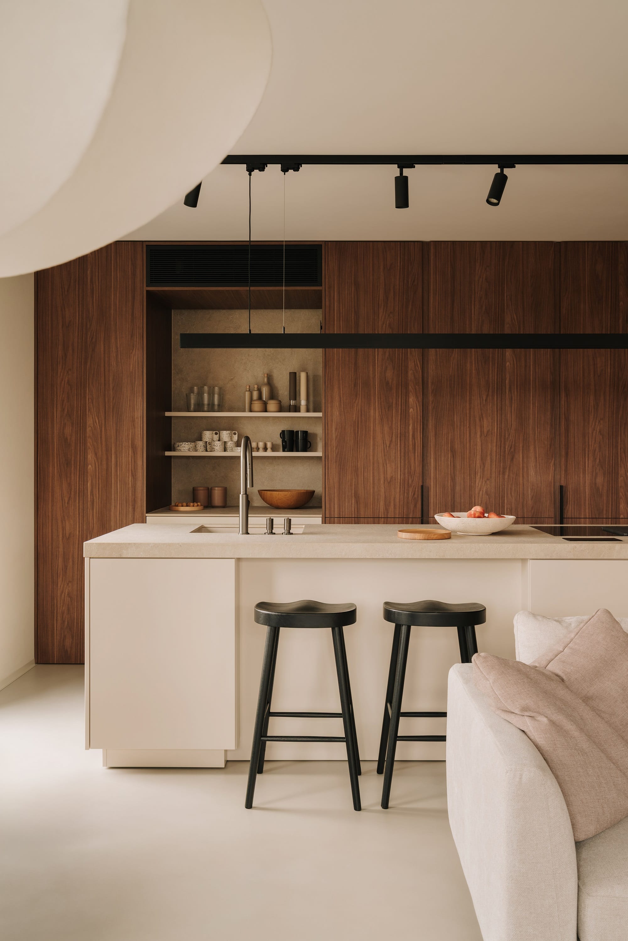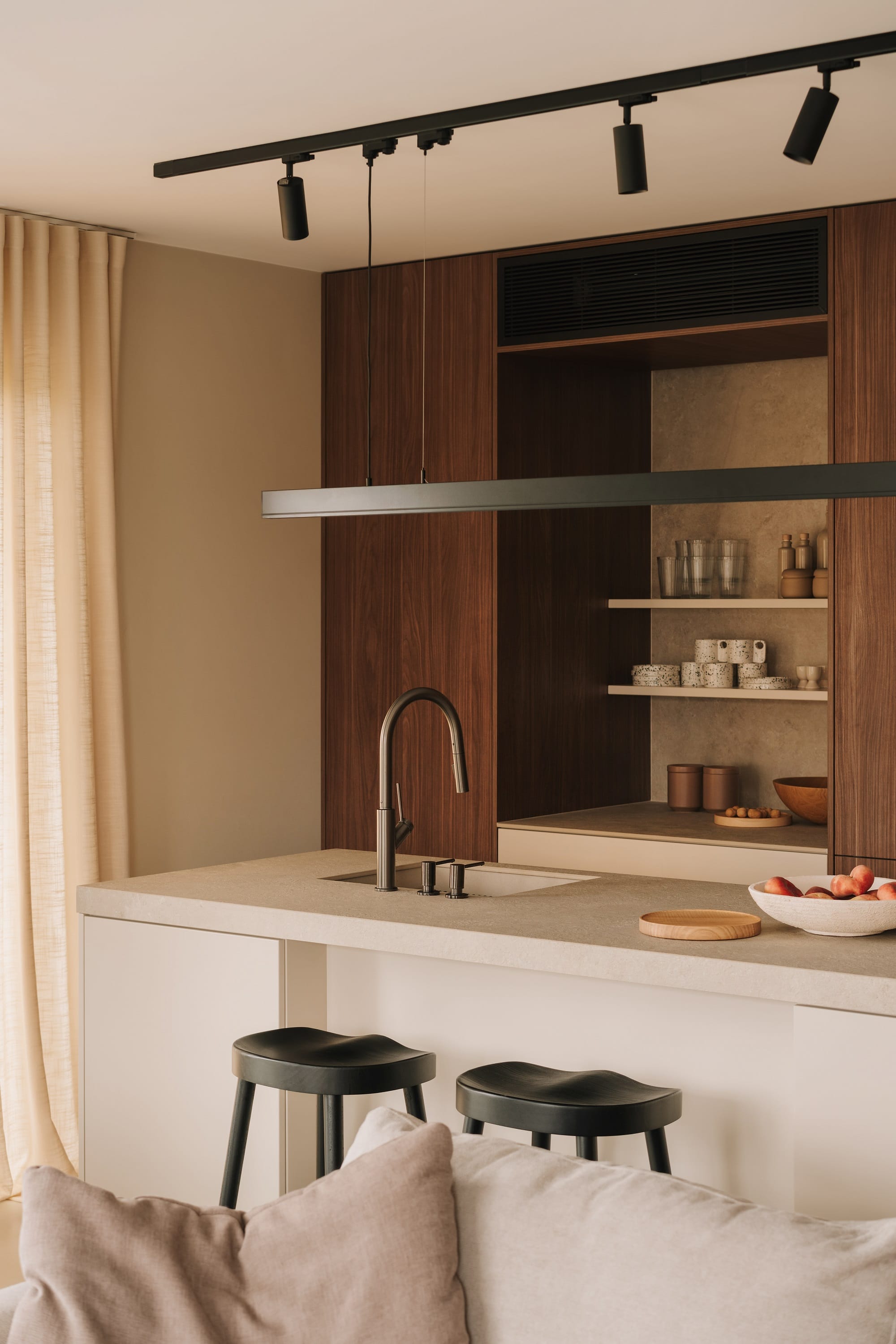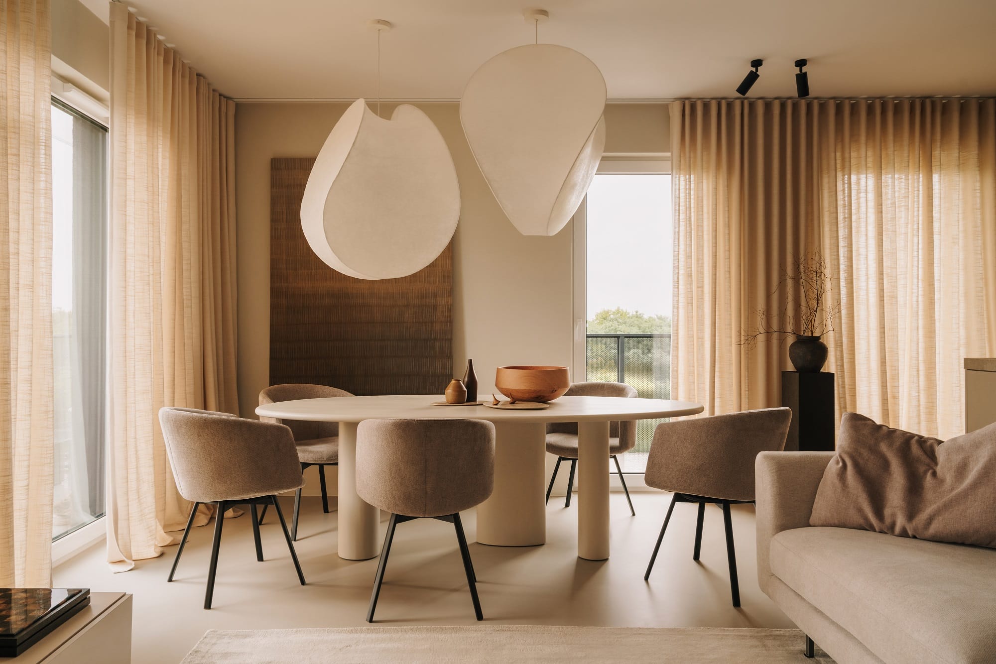 Centralnym punktem części dziennej jest rzeźbiarska kompozycja lamp z włókna szklanego marki Tacchini, których forma koresponduje z falującą linią wykończonego mikrocementem stołu, nad którym zawisły. Aranżację dopełnia obraz Marty Rószczki, stworzony na indywidualne zamówienie oraz drewniane detale i elementy zabudowy wykonane przez Stolarnię Dęborzyce. Klimatyzacja, wentylacja i sprzęt AGD zostały ukryte w zabudowach, dzięki czemu przestrzeń pozostaje wizualnie „czysta”.
