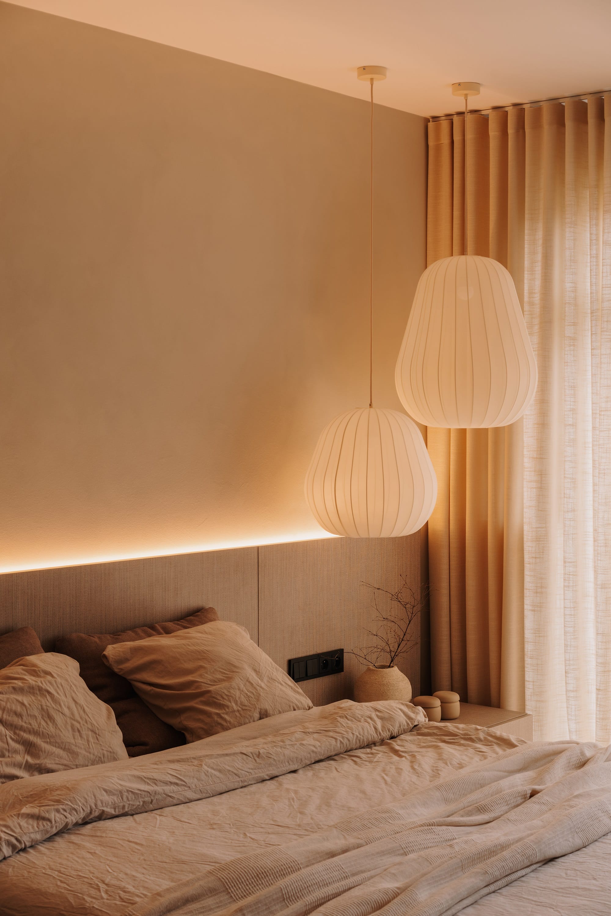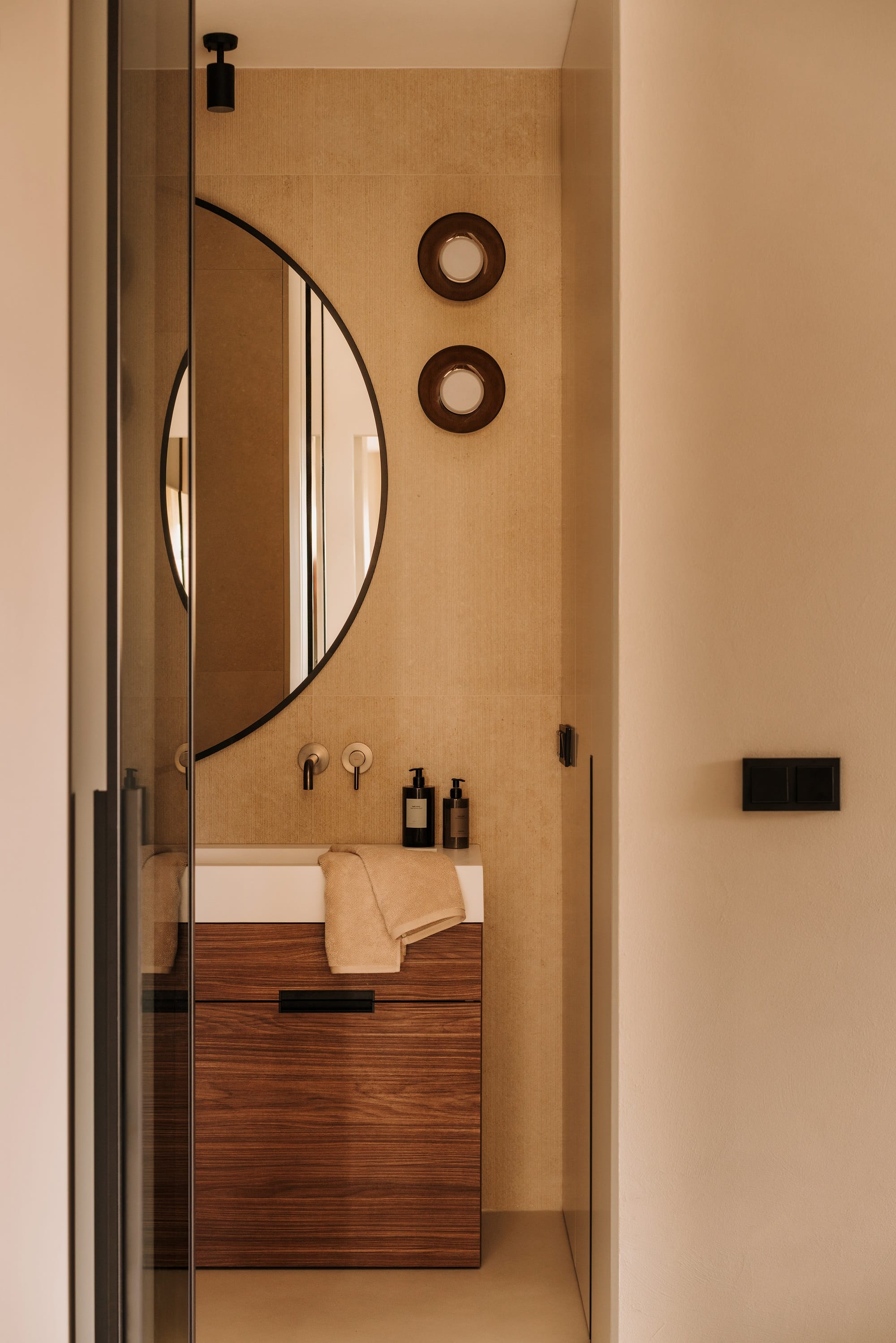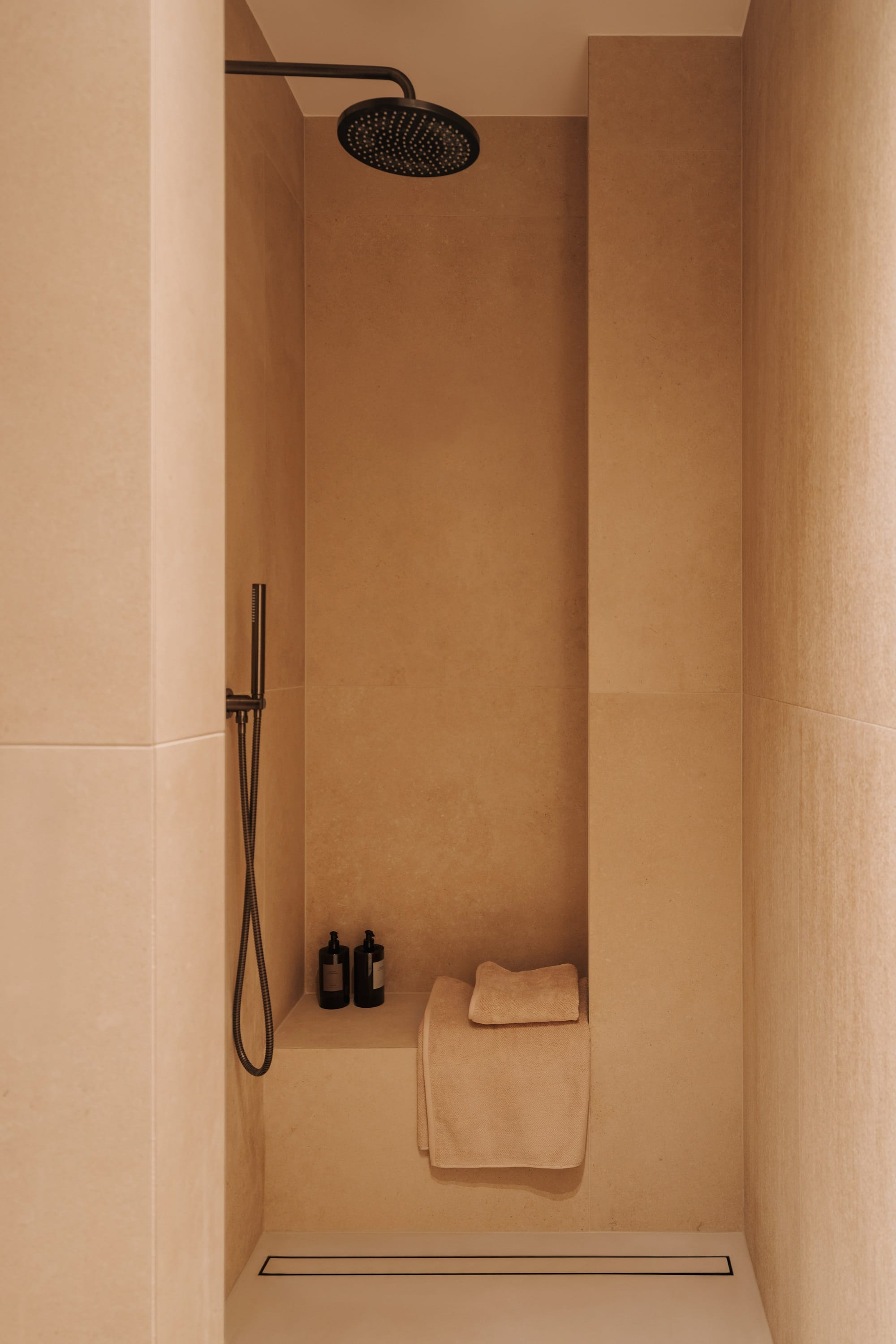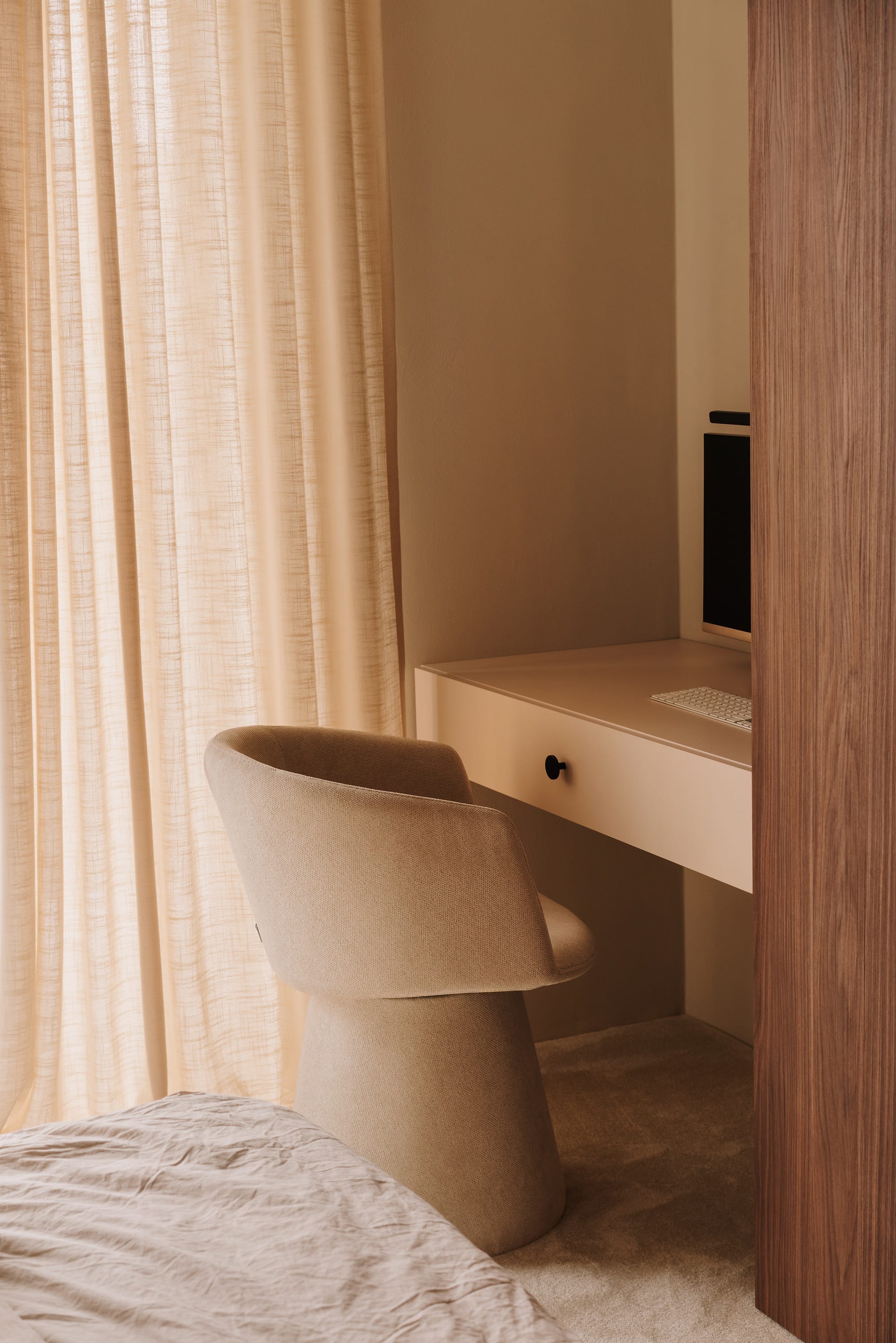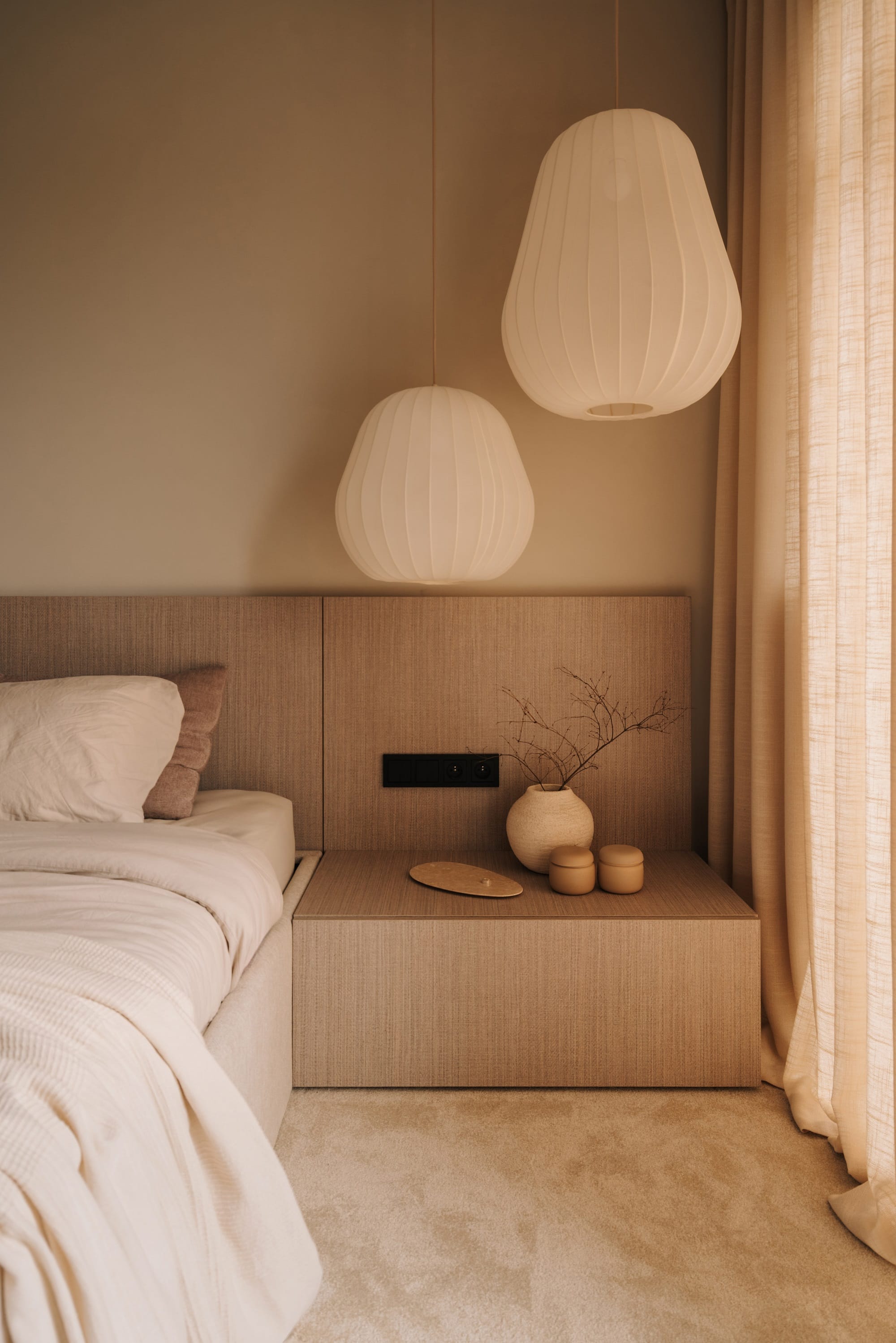 Sypialnia kontynuuje przyjętą stylistykę, ciepłe tonacje beżu i piasku, sprzyjają wyciszeniu. Za przeszklonymi drzwiami ukryto łazienkę master, gdzie kompozycję naturalnego drewna i ryflowanych płytek, dopełnia oświetlenie marki Aromas i prysznic z wygodnym siedziskiem.