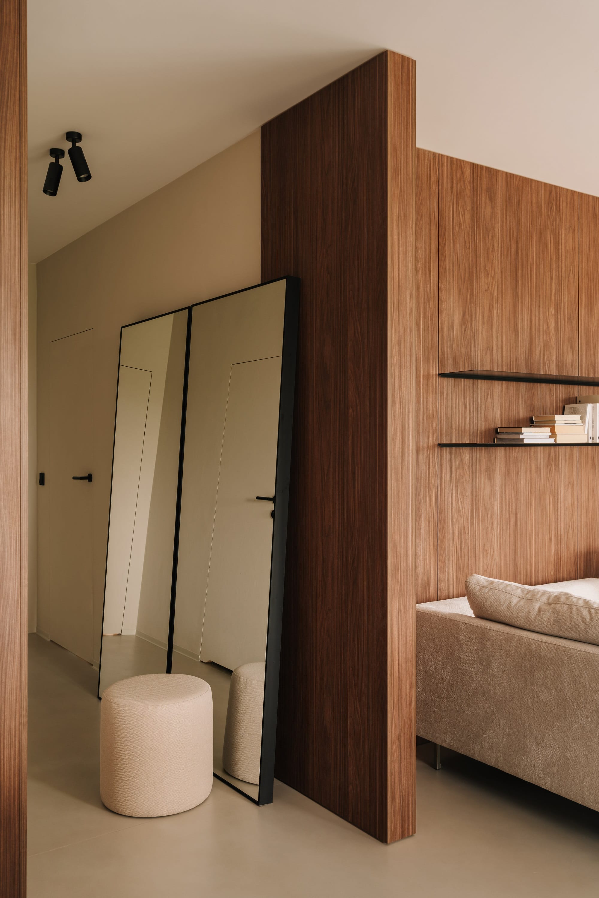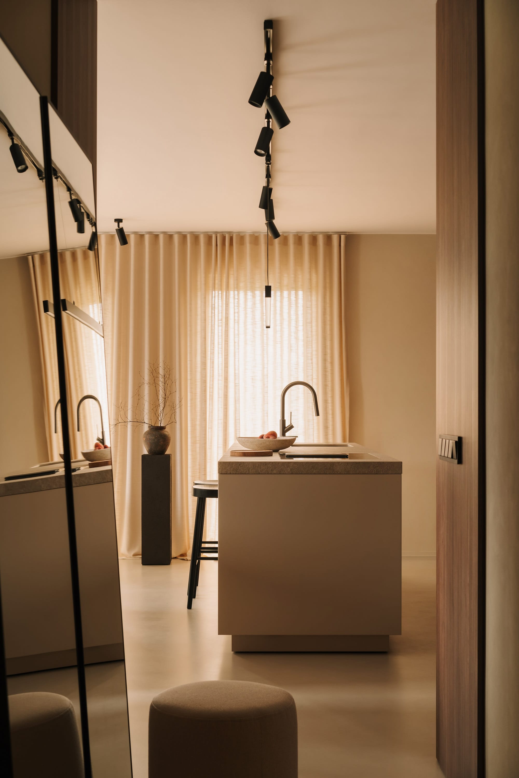 Spokojną atmosferę, na której zależało właścicielom, buduje połączenie matowego mikrocementu na podłogach, drewnianej zabudowy oraz farby strukturalnej, której subtelna faktura rozprasza światło.