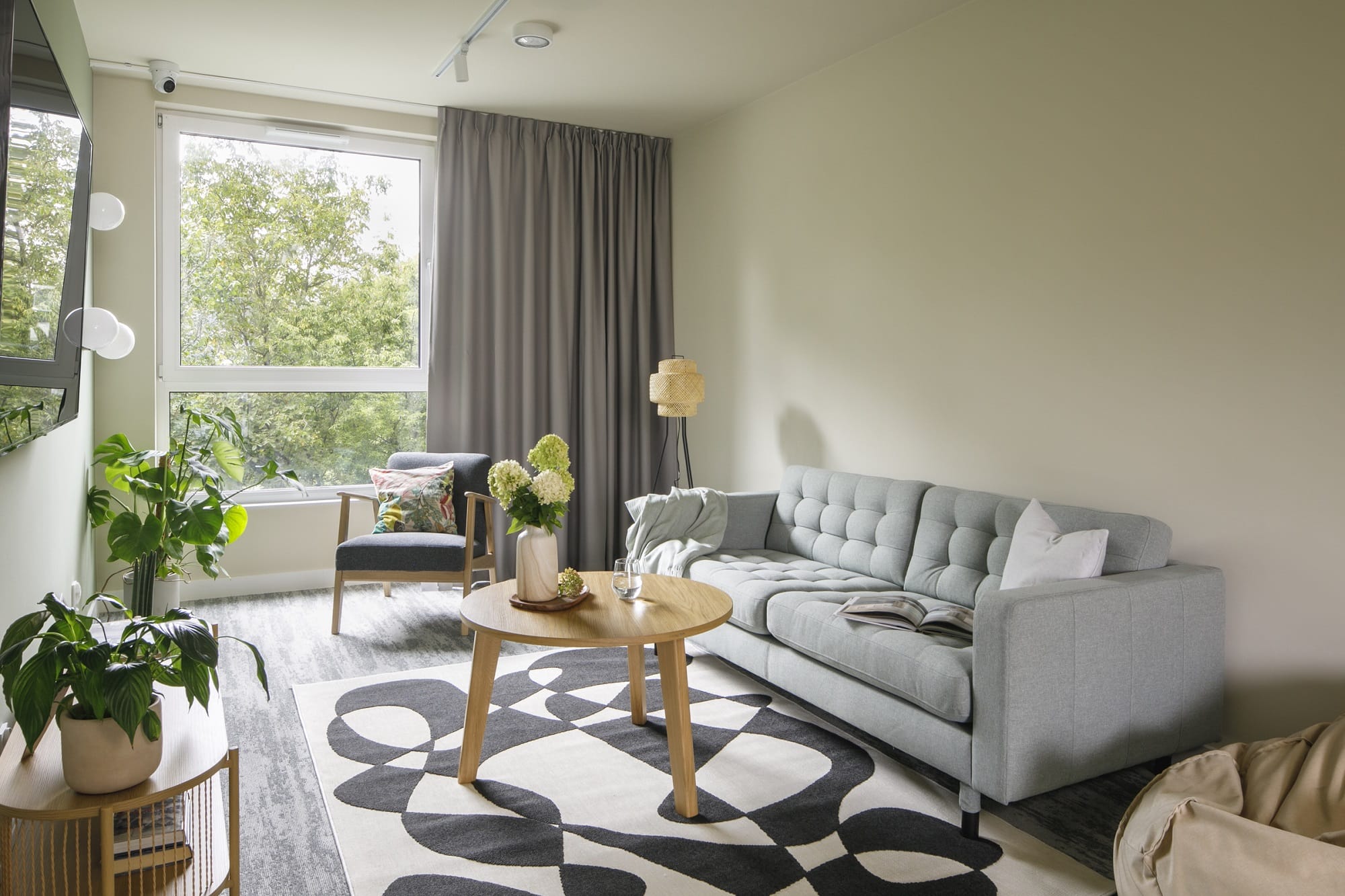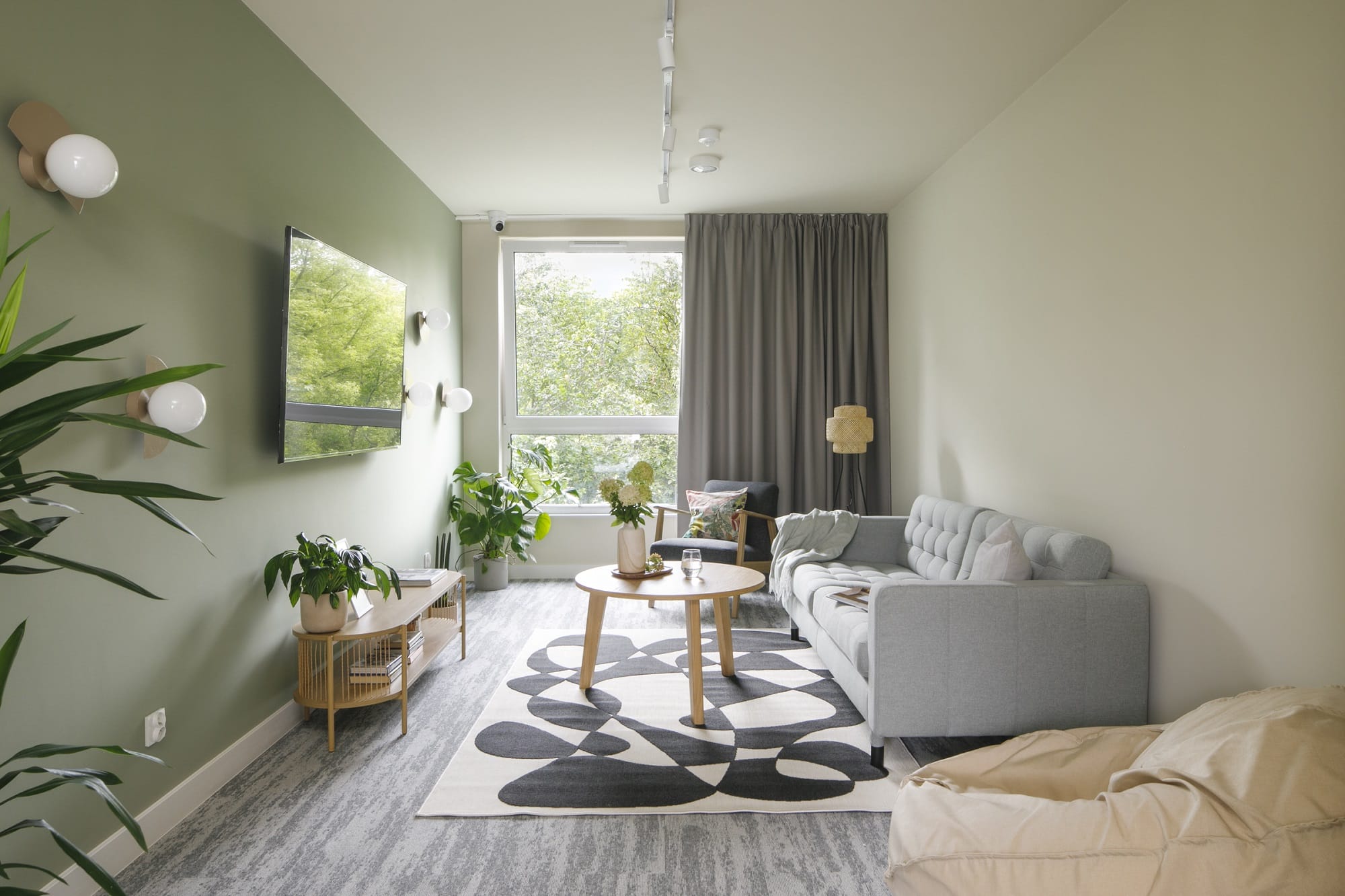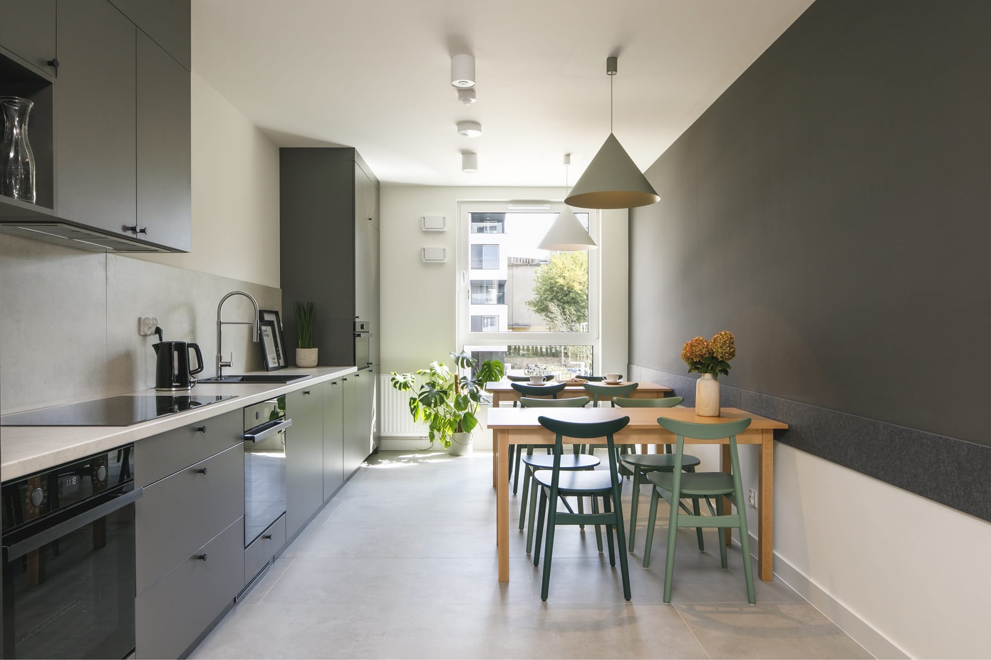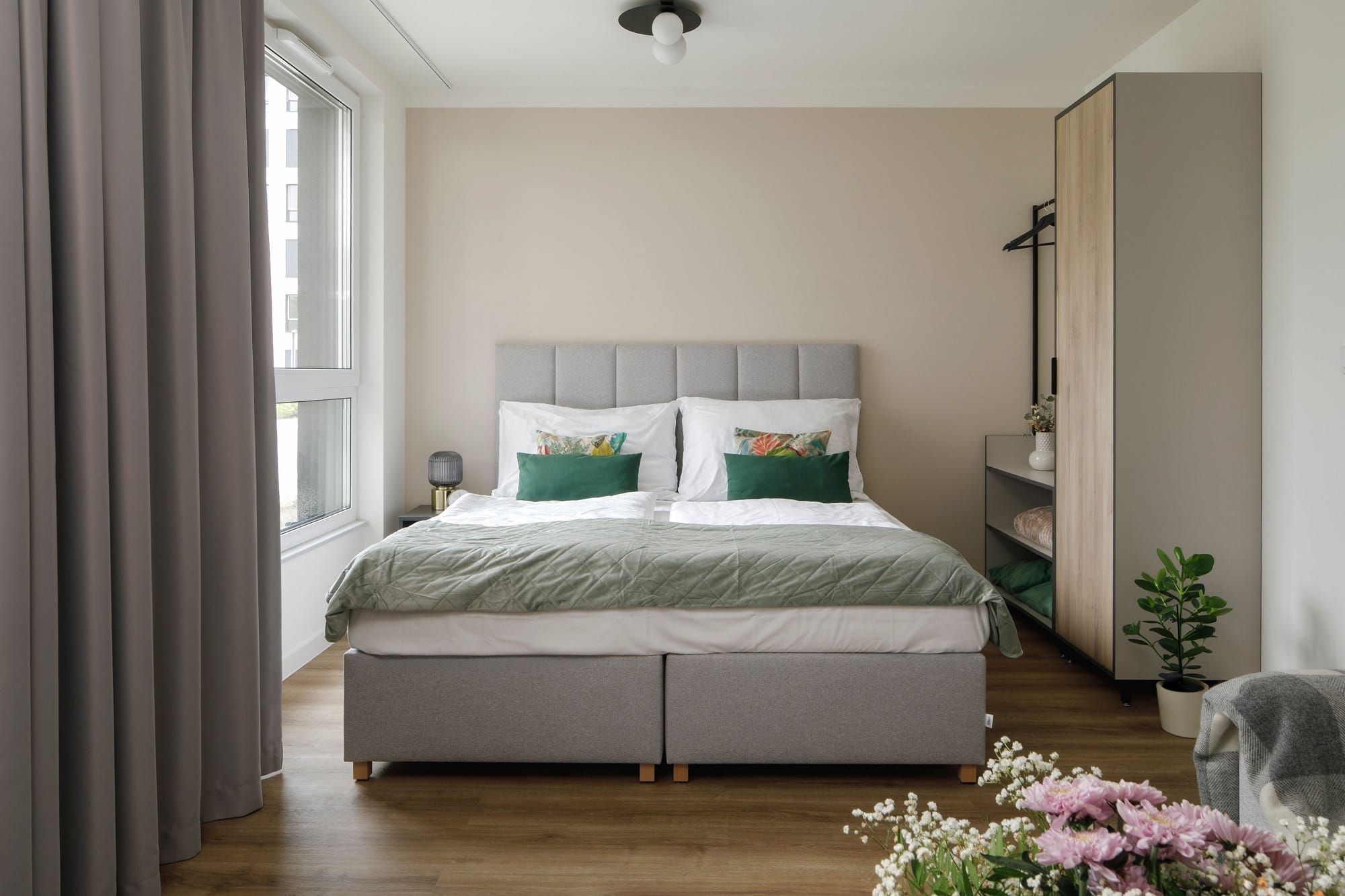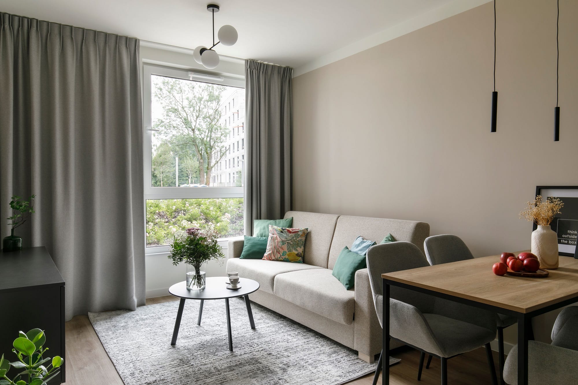 Budynek o bryle w kształcie podkowy mieści w prawym skrzydle 189 w pełni umeblowanych kawalerek i mieszkań typu studio. Lokale wyróżnia hotelowy standard wykończenia – są wyposażone w pościel, ręczniki, naczynia, a nawet drobne udogodnienia, jak zestaw przypraw. Dzięki temu wprowadzić się można praktycznie od zaraz. Co więcej, model najmu pozostaje elastyczny: do wyboru jest opcja krótkoterminowa z pełnym serwisem – w tym sprzątaniem i wymianą tekstyliów – albo standardowa umowa długoterminowa, korzystniejsza cenowo.