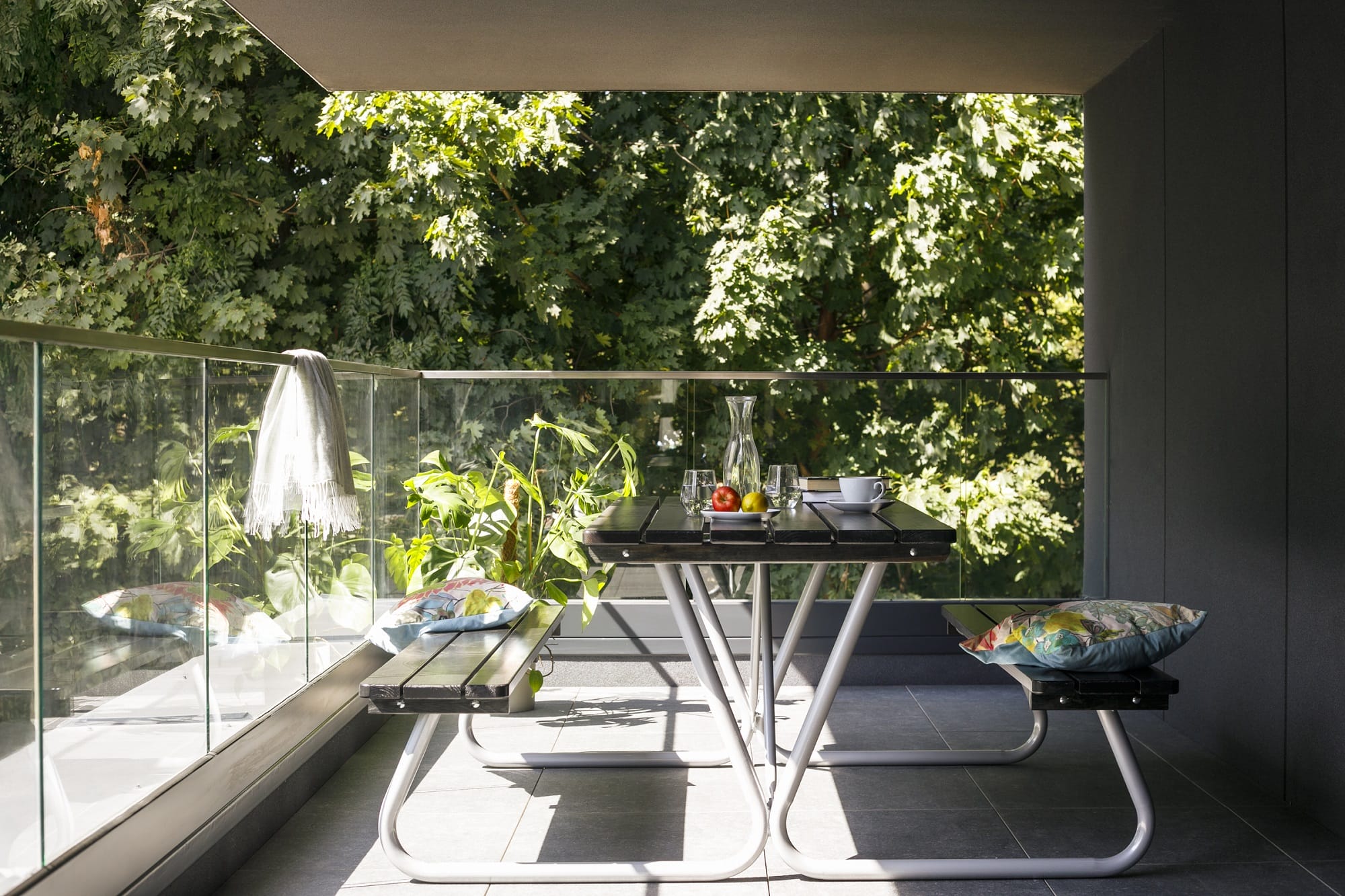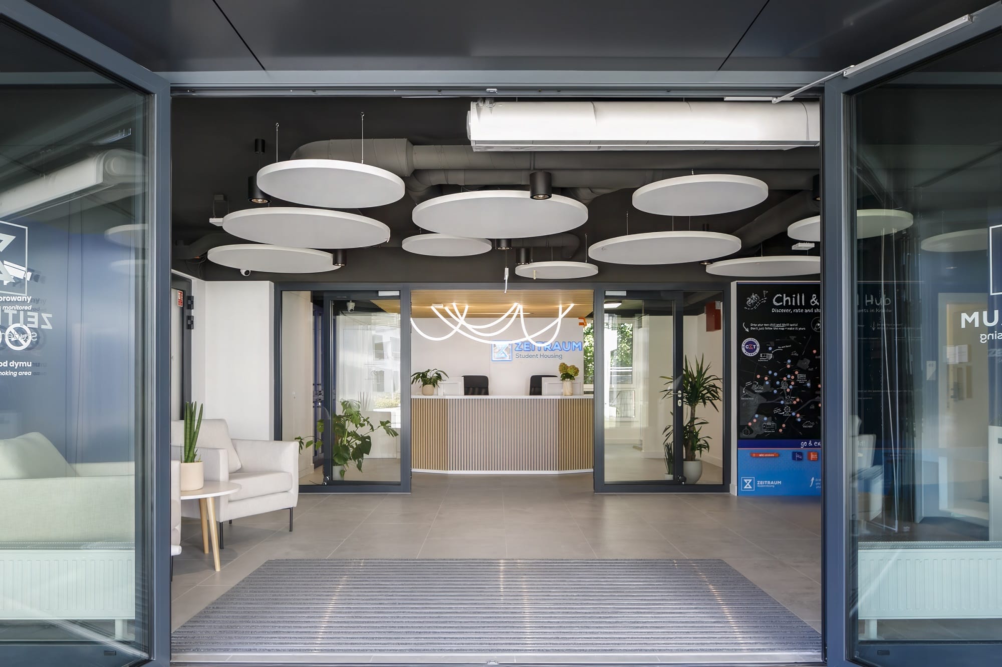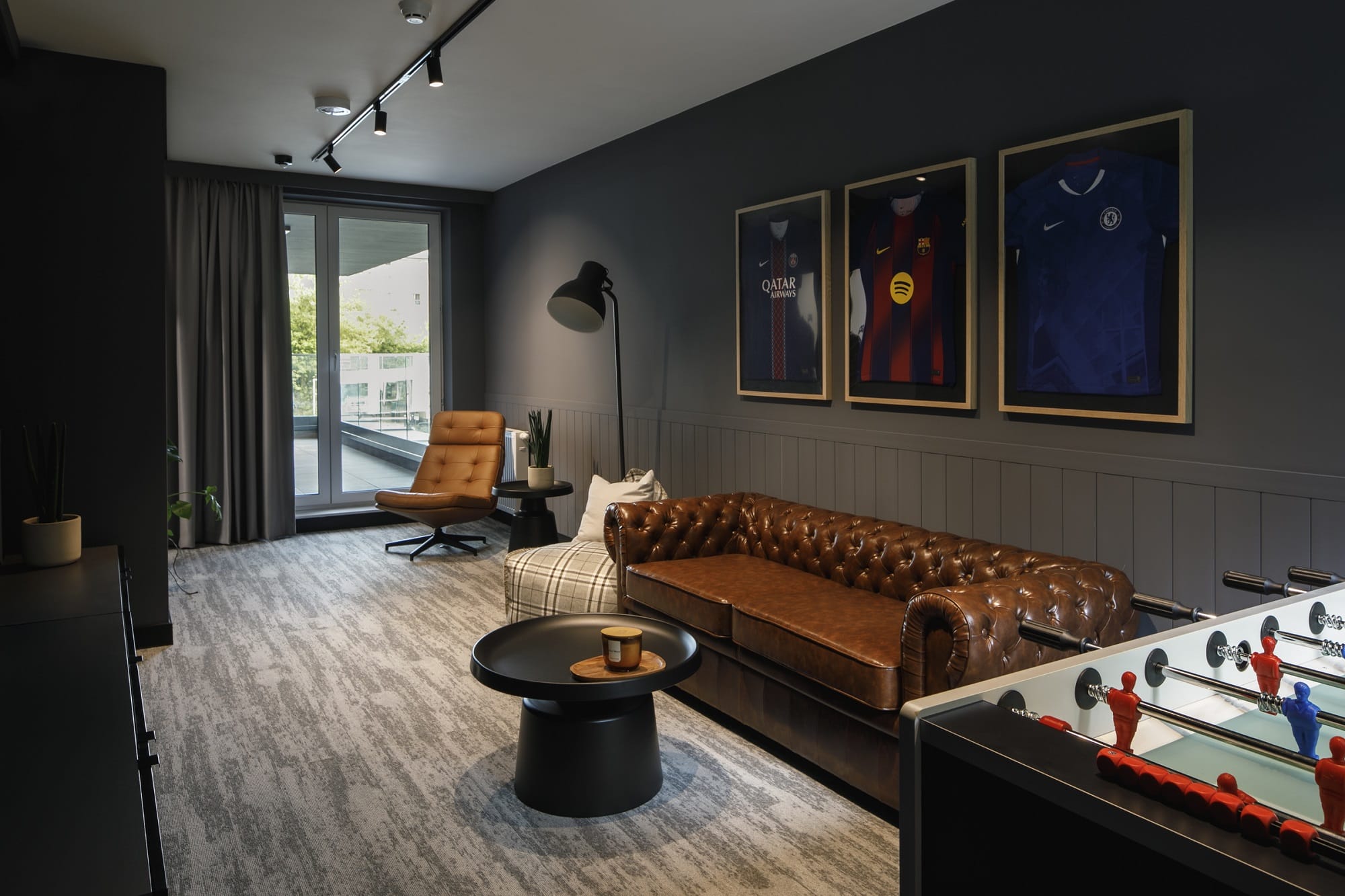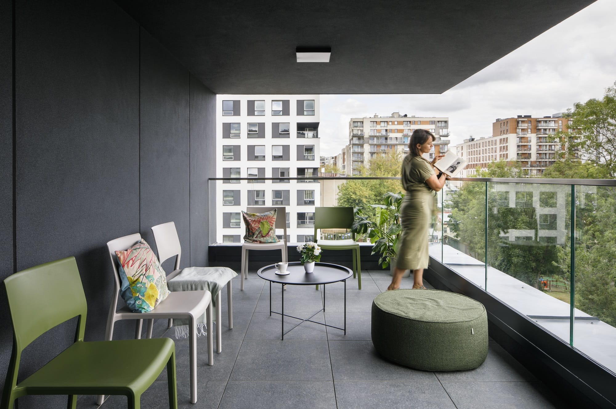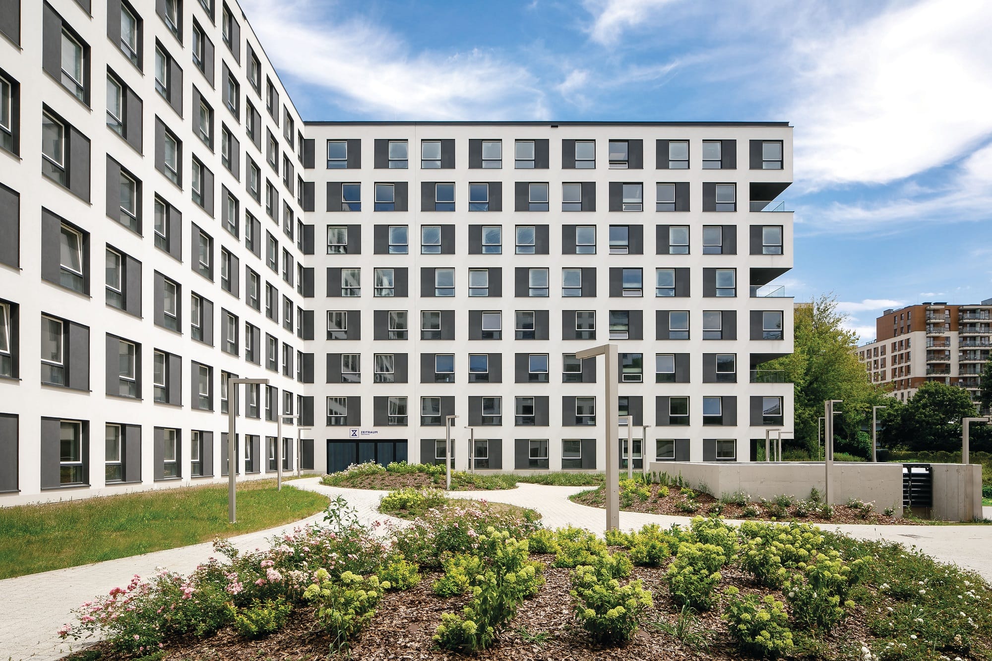 Budynek o bryle w kształcie podkowy mieści w prawym skrzydle 189 w pełni umeblowanych kawalerek i mieszkań typu studio. Lokale wyróżnia hotelowy standard wykończenia – są wyposażone w pościel, ręczniki, naczynia, a nawet drobne udogodnienia, jak zestaw przypraw. Dzięki temu wprowadzić się można praktycznie od zaraz. Co więcej, model najmu pozostaje elastyczny: do wyboru jest opcja krótkoterminowa z pełnym serwisem – w tym sprzątaniem i wymianą tekstyliów – albo standardowa umowa długoterminowa, korzystniejsza cenowo.