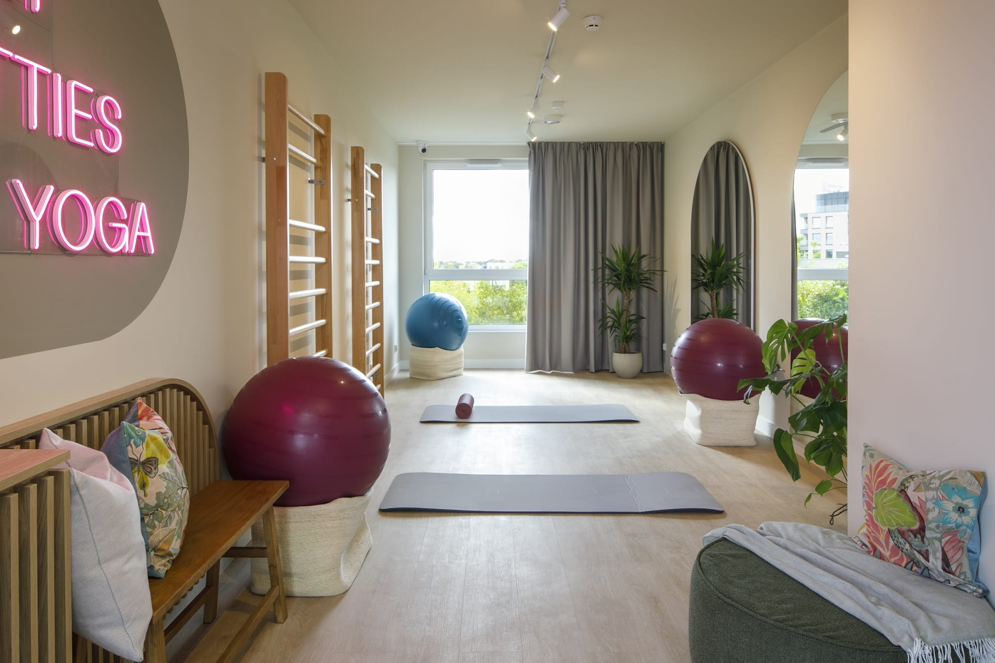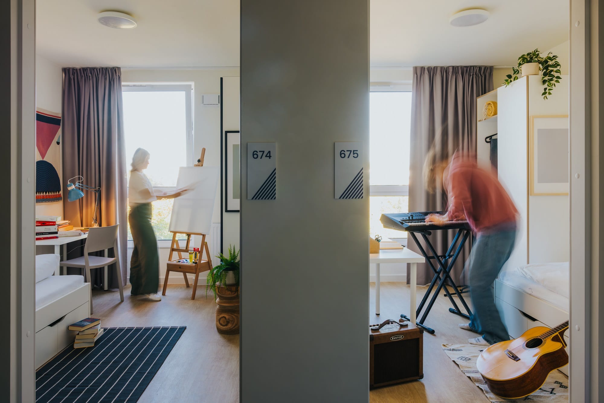Mieszkańcy mają dostęp do części wspólnych dzielonych z akademikiem – siłowni, sali do jogi czy pralni. Mogą też korzystać z naziemnych i podziemnych miejsc parkingowych, ładowarek dla aut elektrycznych oraz stojaków rowerowych. Całość uzupełnia zielony dziedziniec, tworzący kameralną przestrzeń do odpoczynku.